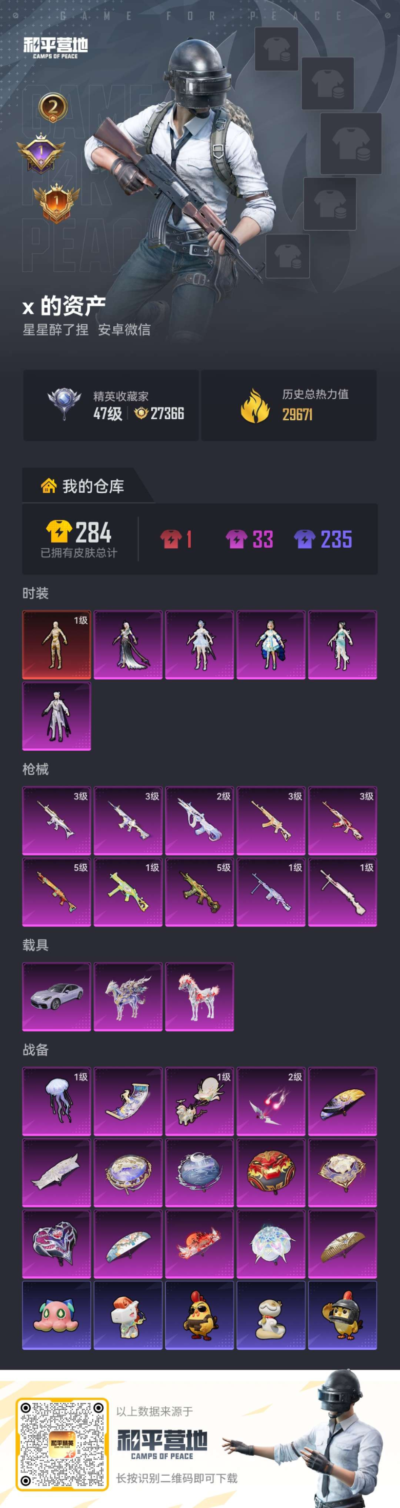 PX_2560678--5粉装-5特效枪-6载具-3粉色飞行器-58979热力值-8王牌印记-102套装-152枪皮 【热门品类】:粉装-梦幻火箭,套装-龟仙人,套装-暗影哥特 【粉色套装】:粉装-梦幻火箭,粉装-花间之火,粉装-暗夜玫瑰,角色-洛天依,粉装-挚爱序曲 【粉色枪皮等级】:SCAR-L-梦幻火箭(七级),SCAR-L-甜梦小狐(四级),M416-心之恋语(四级),GROZA-焦糖拿铁(五级)