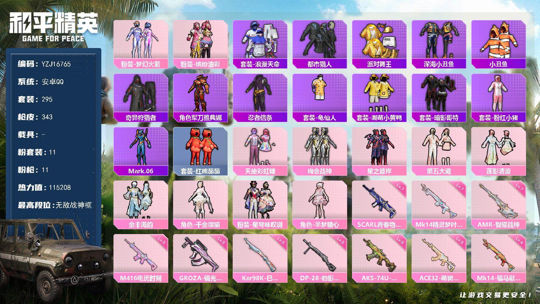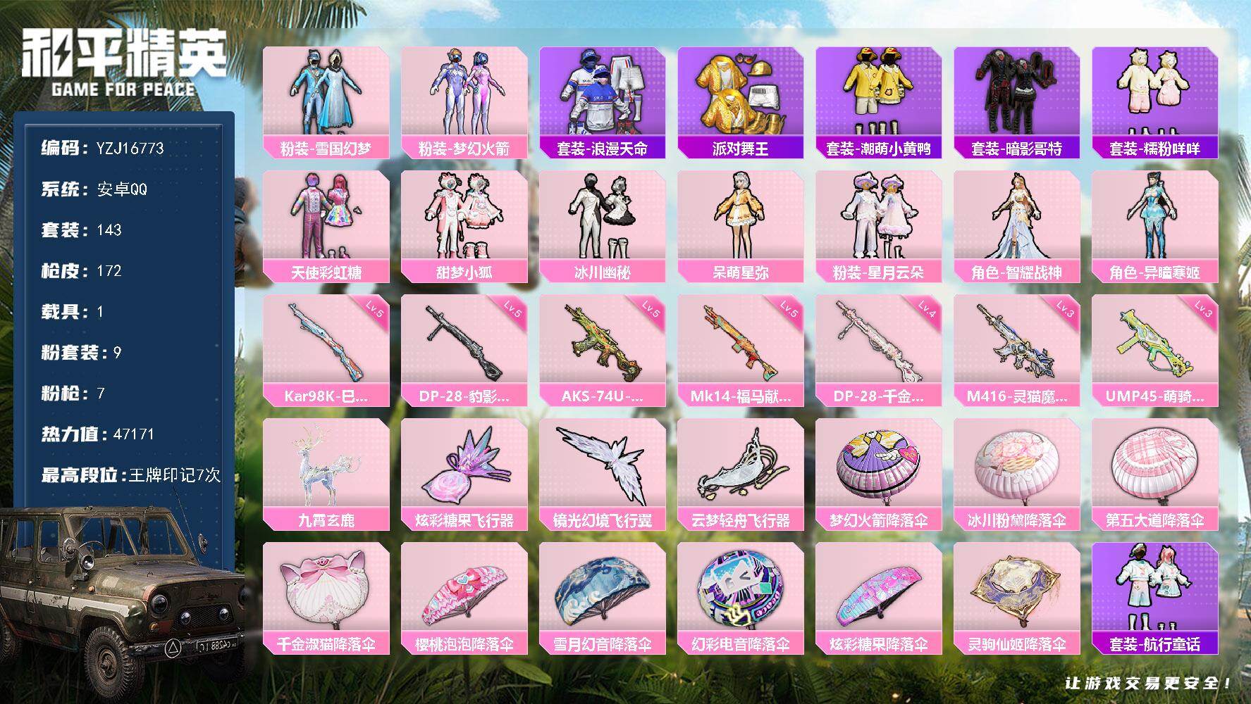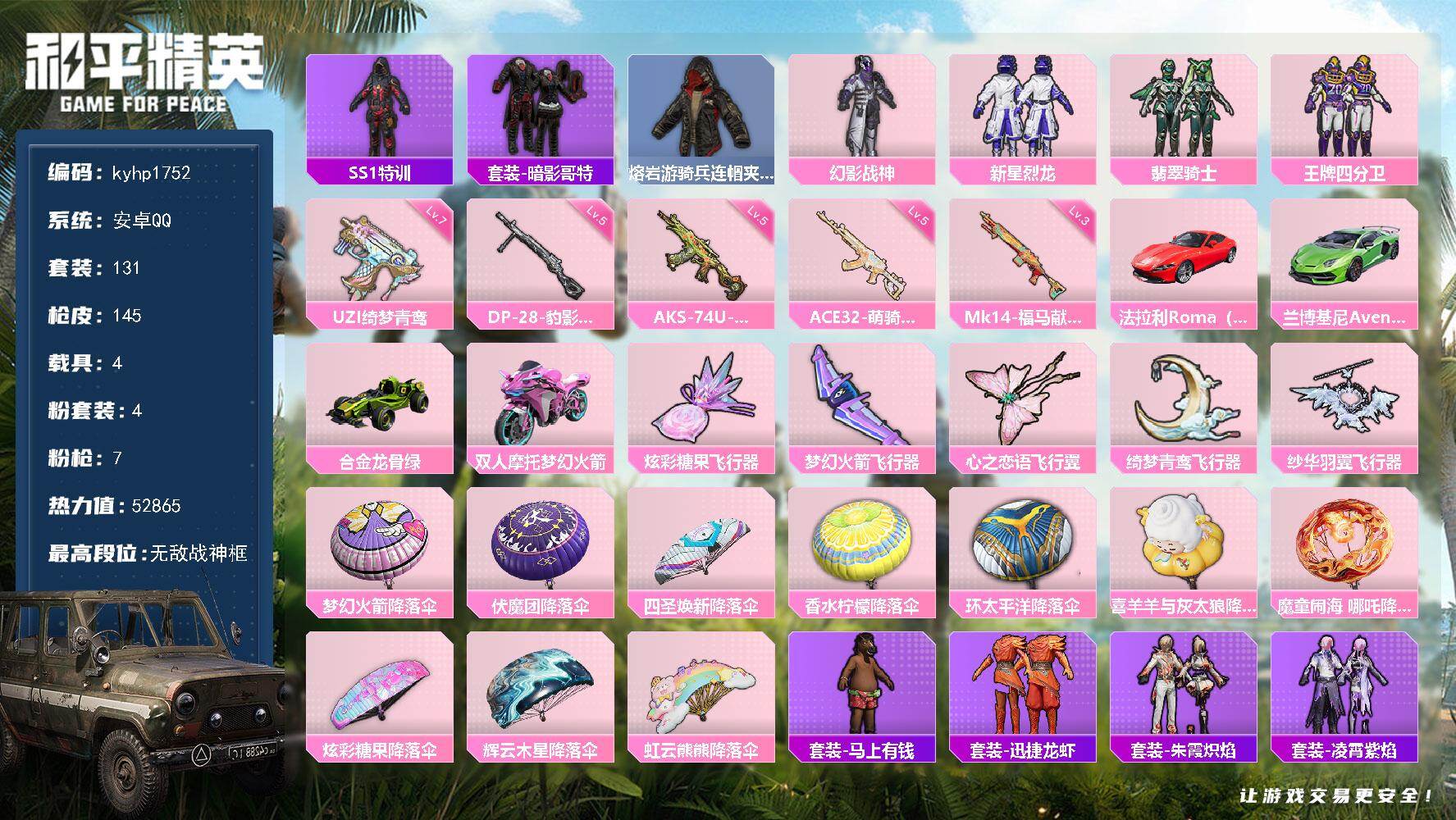PX_2560607--无敌战神框-4粉装-7特效枪-4载具-5粉色飞行器-52865热力值-8王牌印记-131套装-145枪皮 【热门品类】:套装-SS1特训,套装-暗影哥特,熔岩游骑兵连帽夹克 【粉色套装】:粉装-幻影战神,粉装-新星烈龙,粉装-翡翠骑士,粉装-王牌四分卫 【粉色枪皮等级】:ACE32-萌骑漫游(五级),UZI-绮梦青鸾(七级),AKS-74U-森灵之息(五级),Mk14-福马献瑞(三