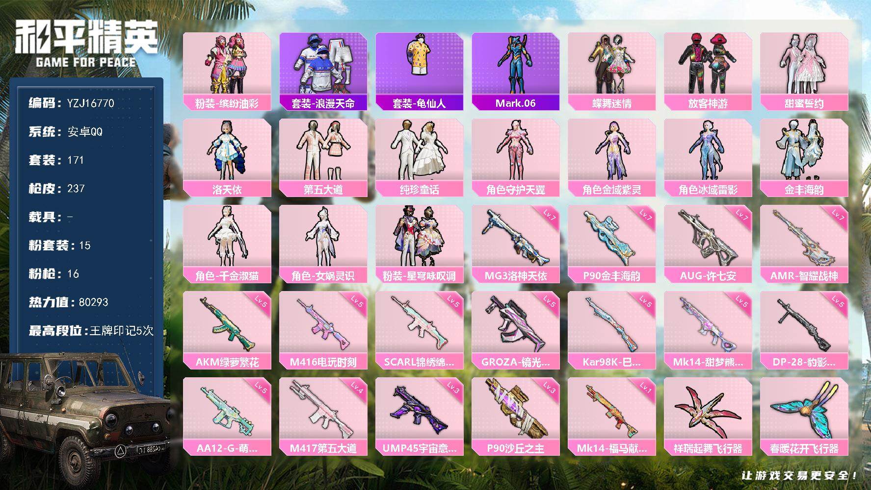 PX_2560609-可二次-安卓Q-1稀有15粉装16特效枪7热门【精品公主萌妹号,73级传奇收藏家,猪妹,第五大道,千金淑猫,女娲灵识,洛天依,发光眼罩,粉雾星云,恋恋初桃,绒宝小鹅,卖崽青蛙,怀庆长公主,多款热门满级特效枪,2级龙翔九天飞行器,1级沙丘之主天马,1级幻海精灵飞行器,梦海之灵背包头盔,伙伴-粉雪蛇宝,13款飞行器,6张改名卡】171套装237枪皮,80293热力值,5印记,历史超级王牌4星,【1稀有】,浪漫天命,【15粉装】,蝶舞迷情,女娲灵识,时空协奏心弦,千金淑猫,洛天依,金丰海韵,星穹咏叹调,冰域雷影,金域紫灵,守护天翼,缤纷油彩,放客神游,纯珍童话,第五大道,甜蜜誓约,【16特效枪】,SCAR-L-锦绣绵绵,(5级),M416-电玩时刻,(5级),P90-金丰海韵,(7级),P90-沙丘之主,(3级),AKM-绿萝繁花,(5级),UMP45-宇宙意志,(3级),Kar98K-巳巳如意,(5级),DP-28-豹影疾电,(5级),AUG-许七安,(7级),Mk14-甜梦熊击,(5级),AMR-智耀战神,(7级),GROZA-镜光银凌,(5级),M417-第五大道,(4级),MG3-洛神天依,(7级),Mk14-福马献瑞,(1级),AA12-G-萌骑幻想,(5级),【7热门】,Mark.06,龟仙人,鹰眼刺客,暗夜契约,纯白誓言,漫步者,破蛋小黄鸡,【5飞行器】,龙翔九天飞行器,春暖花开飞行器,幻海精灵飞行器,深渊漩涡飞行器,天之羽翼飞行器,【1头盔】,甜蜜誓约头盔,营地ID:962350446