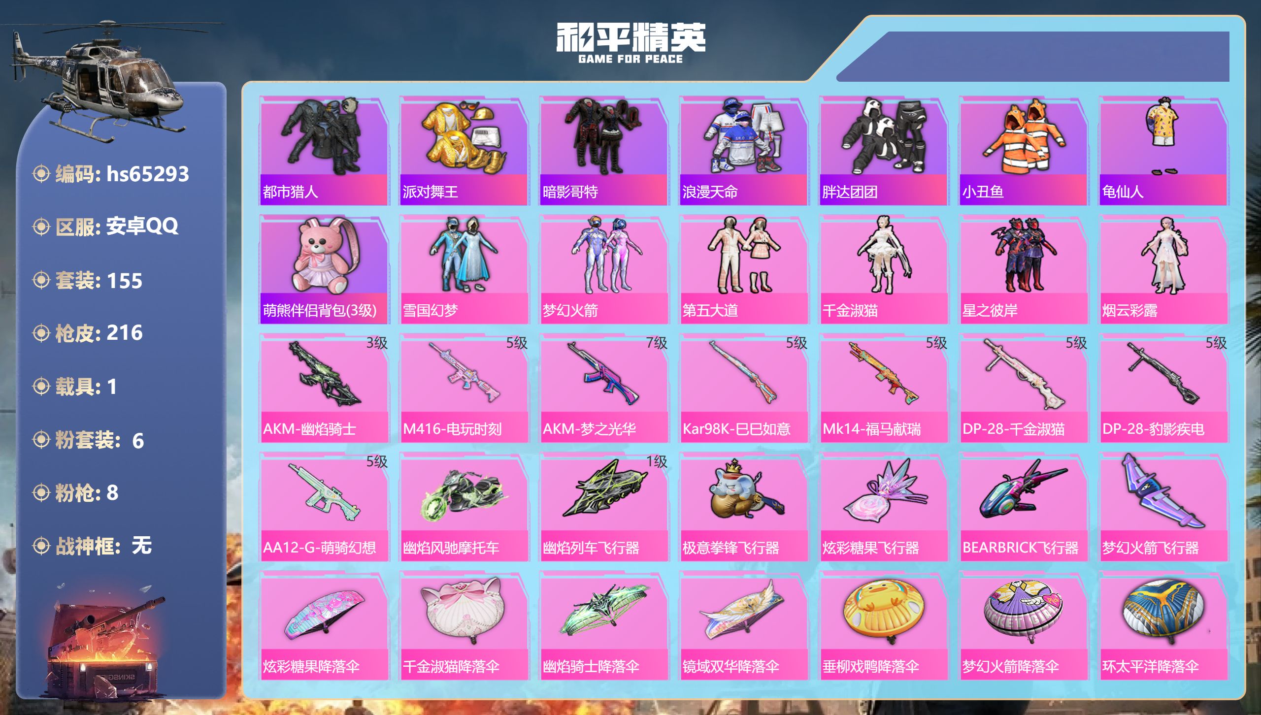 PX_2515217-安卓手Q-22王牌印记-14粉装-10特效枪-1载具-热力值-313套装-439枪皮-4卓越印记-2传奇印记 【14粉装】套装-莲影清波,角色-洛天依,套装-天使彩虹糖,套装-甜蜜誓约,套装-放客神游,角色-千金淑猫,套装-第五大道,套装-宝贝奶油派,套装-碧影闪光,套装-金丰海韵,套装-星穹咏叹调,套装-潮汐统领,套装-烈焰拳霸,套装-梦幻火箭 【10特效枪】Mk14-福马献瑞/5级,MG3-洛神天依/7级,M762-甜蜜誓约/7级,Kar98K-巳巳如意/5级,DP-28-千金淑猫/7级,M416-心之恋语/7级,SCAR-L-纯梦嫁纱/7级,AKM-甜心宝贝/7级,DP-28-豹影疾电/5级,UMP45-恐龙拽拽/7级 【12稀有紫装】都市猎人,Mark.06,8号机,派对舞王,2P战斗服款,奇异狩猎者,暗影哥特,浪漫天命,雪山精英,小丑鱼,龟仙人,怀庆长公主 【1稀有载具】兰博基尼Estoque(银翼灰) 【313稀有时装】梦幻火箭,放客神游,第五大道,宝贝奶油派,天使彩虹糖,洛天依,千金淑猫,碧影闪光,甜蜜誓约,潮汐统领,星穹咏叹调,莲影清波,烈焰拳霸,金丰海韵,都市猎人,浪漫天命,奇异狩猎者,龟仙人,Mark.06,雪山精英,暗影哥特,小丑鱼,8号机,派对舞王,2P战斗服款,爱崽白熊,罗小黑,狂战萌兔,银碳小老虎,狂沙舞者,Alan,Walker,萌趣咩咩,海上生明月,龙魂突击队,铁血战翼,小熊娃娃,异域银装,火种守卫者,都市丽猫,摩登魅猫,星渊小夜曲,街头风暴,星途旅人,蜜桃派对,冰河战士,鱼渊荷华,青团波波,大橘大利,燕燕于飞,战术大师,智谋强哥,怀庆长公主,雏菊兔兔,马上有钱,糖糖葫芦,晶辉守护,香桃花海,蝶变,巳巳如意,粉恋花,曼妙人鱼,棉花软糖,琴音绮想,画境星梦,狂鲨锋刃,粉黛兰香,炫彩糖果,绯色魅影,萌鸡速递,元气之梦,书海巡游,薄荷星砂,顶瓜瓜,冰公主,雪国风尚,蓝冰羽,恋语绒绒,青翼流星,紫幽梦,SS35特训,迷域探索者,机械英豪,机械征服者,SS29特训,萝兰蝴蝶,SS5特训,SS31特训,冰原使者,SS33特训,SS32特训,SS16特训,暴风机械师,无暇誓言,时空追击者,星际旅行,SS36特训,贝斯之夜,舰行太空,焰鹰斗篷,红酒骑士,军械专家,拳皇97八神庵,金鼠迎春,黑色刀锋,湖雨初晴,新侠客行,闪耀星光,福星高照,暗夜契约,纯白誓言,豚鼠丹丹,雪兔飞飞,虎虎生威吉莉,夏日音浪,龙的传人,潮流炫酷,SS8特训,众神之王,甜梦熊熊,智慧之神,青玉碎影,竞速先锋,萌黄之夏,SS37特训,SS28特训,暗黑骑手,蓝色运动,极速竞梦,飞驰魅影,白色伏地魔,音速流光,热血青春,活力之心,SS9特训,白月香洋装,森林猎手,酷潮明星,绯格组合,涂山之恋,SS26特训,漫步者,空岛之星,热情海星,黑色伏地魔,黎明保卫者,炫蓝之夏,元气发射,纯真浪花,SS34特训,骑行爱好者,竞技名士,蓝色守护者,深蓝色名流,SS30特训,长空猛禽,竞技勇士朋克,特战装甲,战地菁英,旭日情侣,山经魅狐,灰色格斗者,六六大吉,甜蜜告白,街头潮人,冷焰舞者,惊鸿侠骨,魅力单车,灼焰舞者,雪山征服者,春光漫游,夜莺强袭者,猎梦纪元,丛林猎人,甜心亚梦,虚音幻奏,传奇侦探,极地朋克,贵族骑装,幻世战舞者,甜蜜菠萝,半糖蓝莓,青涩时光,特种空勤,牛气满满,和平特警,娇憨猪猪,风暴特警,春日漫步,冰川特警,龙腾端午,幻影公爵,滨海假日,狙击之神,麻辣教官,鹰眼刺客,福马献瑞,冰冻风暴,攀登者,冷酷挑战者,SS11特训,幽夜迷踪,幻影武者,梦魇先生,青春冒险家,暖心橘喵,破蛋小黄鸡,潮流游乐家,疯狂小兔子,青龙圣者,圣诞大吉,特战英豪,快闪甜心,凛冬战士,北国孤狼,SS6特训,千禧之恋,炽焰拳师,绮丽涂鸦,格斗专家,星光纪元,坚韧舞者,奇迹天团,竞技达人朋克,淡雅花蕊,野性战心,原初圣火,逆风勇士,海岛探路者,跃动心情,初火先锋,SS7特训,核芯基因,精神漫游,娴静芝兰,和煦暖阳,霓虹街区,森林游猎者,田园牧歌,萌趣颜团子,轻风白浪,SS10特训,风行保卫者,特种颜团子,沙漠兵团,镭射皇者,风华少年志,探宝勇士,奇趣章鱼,SS12特训,SS27特训,牛气冲天,迅捷之星,SS18特训,治愈之星,银白舞王,科技之星,SS13特训,飞行日记,SS17特训,瑞龙福将,团圆交子,金耀舞者,蓝调潮人,缤纷焰火,异彩先驱,霓虹极客,空投萌叽,装甲骑士,SS19特训,光之冒险,晨曦薄雾,SS20特训,血色贵族,SS21特训,玉兔迎春,弄潮海豚,梦起落英,SS22特训,SS23特训,冰爽海盐,飞狐塔尔斯,甜蜜熊情侣,缤纷果语,双棍侠客,香榭午后,SS14特训,天籁歌者,电音精灵,神气柴柴,灵蜜圈圈,妙红点点,幻彩翩翩,格斗先锋,幻羽潜行,海盐绵绵冰,老实芭蕉,冷血极客,吉莉礼服,刚毅裁决者,王牌教练,荣耀,暗夜之虎,柠萌假日,粉红小猪,SS24特训,鹤鸣,绚紫流光,懵萌河马,SS25特训,锦衣飞扬,黑夜传说,SS15特训,深蓝冒险家 【439稀有枪械】M416-心之恋语/7级,AKM-甜心宝贝/7级,SCAR-L-纯梦嫁纱/7级,M762-甜蜜誓约/7级,Kar98K-巳巳如意/5级,Mk14-福马献瑞/5级,UMP45-恐龙拽拽/7级,DP-28-千金淑猫/7级,DP-28-豹影疾电/5级,MG3-洛神天依/7级,QBZ-纯真浪花,AWM-纯真浪花,汤姆逊-纯真浪花,DBS-乌木金纹,AA12-G-纯真浪花,平底锅-纯真浪花,撬棍-朗基努斯之枪,DBS-创世·救赎,蜜獾-精灵梦叶罗丽,S1897-精灵梦叶罗丽,SCAR-L-海盐豹豹,平底锅-精灵梦叶罗丽,GROZA-海盐豹豹,野牛-雏菊兔兔,Mk14-冰河战士,平底锅-雏菊兔兔,M762-雏菊兔兔,Mini14-雏菊兔兔,R1895-雏菊兔兔,M249-金丰海韵,UZI-冰河战士,M16A4-冰河战士,MK20-H-乌木金纹,Win94-乌木金纹,MK12-乌木金纹,PKM-紫幽梦,MG3-霓彩脉冲,ACE32-画境星梦,Famas-桃粉嫣然,M1加兰德-画境星梦,MP5K-画境星梦,Mk14-紫幽梦,蜜獾-乌木金纹,S1897-紫幽梦,P92-紫幽梦,SPAS-12-狂鲨锋刃,M417-玩趣呆呆,MK20-H-狂鲨锋刃