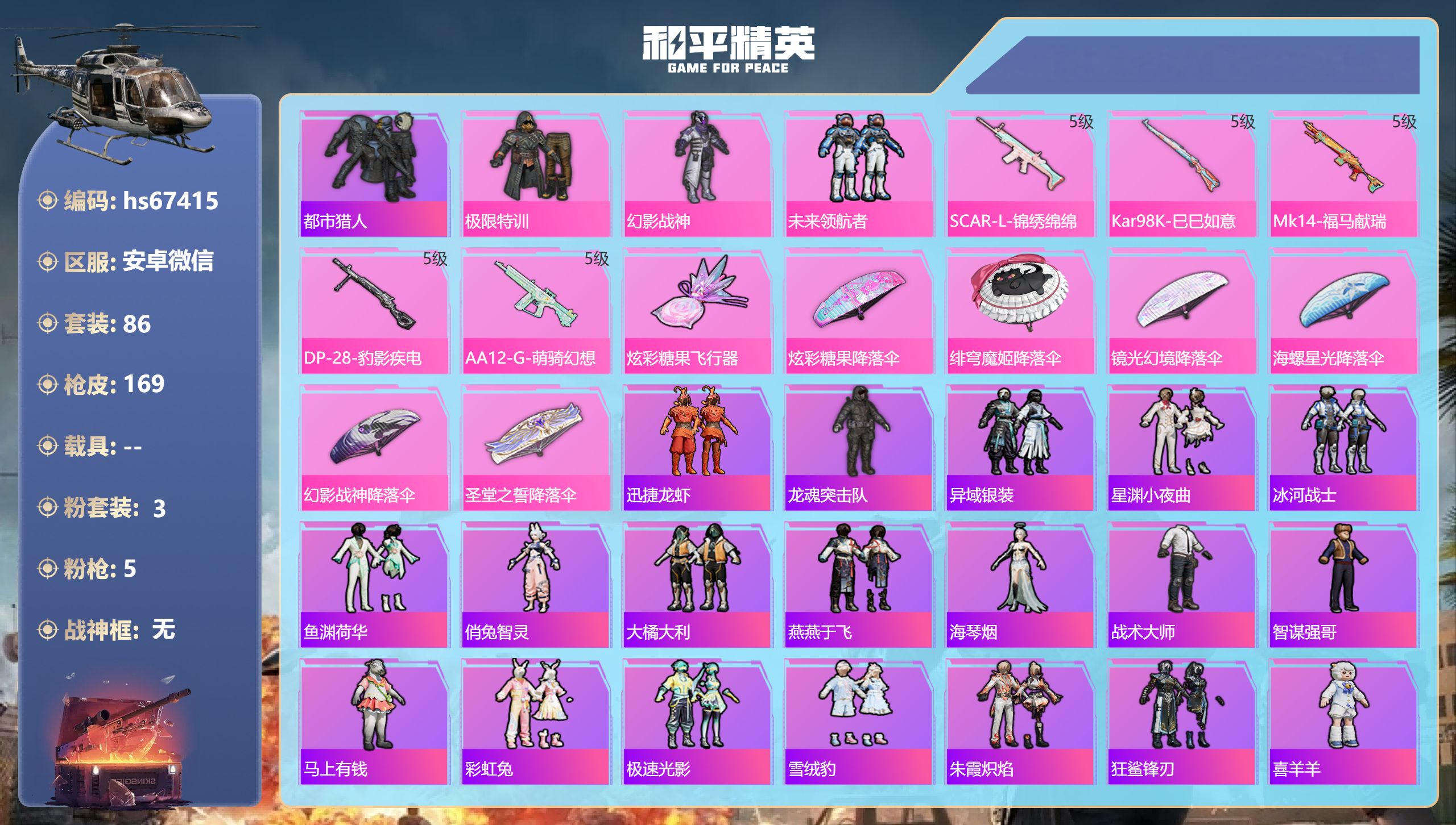 PX_2521495-,安卓手Q-7王牌印记-3粉装-9特效枪-37637热力值-83套装-140枪皮-5卓越印记-2传奇印记 【3粉装】角色-异瞳寒姬,套装-怪诞乔克,套装-幻影战神 【9特效枪】AUG-超新星/7级,M416-至情至圣/9级,MG-36-沧焰双生/5级,DP-28-豹影疾电/5级,GROZA-镜光银凌/5级,Kar98K-巳巳如意/5级,Mk14-福马献瑞/4级,AUG-暖羊咩咩/5级,Mk14-甜梦熊击/5级 【5稀有紫装】都市猎人,派对舞王,浪漫天命,迅捷狂鲨,小丑鱼 【82稀有时装】怪诞乔克,幻影战神,异瞳寒姬,都市猎人,浪漫天命,小丑鱼,迅捷狂鲨,派对舞王,异域银装,鱼渊荷华,大橘大利,燕燕于飞,战术大师,紫俏灵猫,元素星魂,午间小调,琴音绮想,雪绒豹,画境星梦,朱霞炽焰,狂鲨锋刃,游乐,凌霄紫焰,擎苍青焰,炫彩糖果,绯色魅影,萌鸡速递,元气之梦,风迹短诗,漫游都市,薄荷星砂,秘语星愿,云朵鹅,顶瓜瓜,雪国风尚,蓝冰羽,恋语绒绒,青翼流星,紫幽梦,马上来财,SS35特训,SS31特训,SS33特训,SS32特训,SS36特训,潮流炫酷,SS37特训,特训学院,红色运动,黄色运动,蓝色运动,黄色伏地魔,白色伏地魔,酒红色名流,阳光火鸡,湖蓝色名流,黄色名流,漫步者,黑色伏地魔,SS34特训,长空猛禽,旭日情侣,冷焰舞者,魅力单车,水银刺客,狙击之神,红釉青花,鹰眼刺客,雨过天青,福马献瑞,冰冻风暴,冷酷挑战者,摇滚舞王,海岛探路者,幻世保卫者,玉兔迎春,呆萌铁蟹,夏日倾情,青涩年华,忍者信条,柠萌假日,鹤鸣 【140稀有枪械】M416-至情至圣/9级,GROZA-镜光银凌/5级,AUG-暖羊咩咩/5级,AUG-超新星/7级,Kar98K-巳巳如意/5级,Mk14-甜梦熊击/5级,Mk14-福马献瑞/4级,DP-28-豹影疾电/5级,MG-36-沧焰双生/5级,DBS-乌木金纹,SCAR-L-海盐豹豹,GROZA-海盐豹豹,DBS-风迹短诗,莫辛纳甘-风迹短诗,AKM-绿洲时空,Win94-乌木金纹,MK12-风迹短诗,MK12-乌木金纹,破片手榴弹-爆破雪人,PKM-紫幽梦,MG3-霓彩脉冲,ACE32-画境星梦,M1加兰德-画境星梦,MP5K-画境星梦,Mk14-紫幽梦,蜜獾-乌木金纹,M762-云朵鹅,S1897-紫幽梦,SVD-云朵鹅,P92-紫幽梦,AWM-绿洲时空,SPAS-12-狂鲨锋刃,M417-玩趣呆呆,MK20-H-狂鲨锋刃,AUG-冰晶雪宝,突击盾牌-绝对恒星,铝热弹-炫彩糖果,UZI-炫彩糖果,AA12-G-画境星梦,平底锅-画境星梦,M249-冰晶雪宝,Mk47-风迹短诗,JS9-凌霄紫焰,MG-36-凌霄紫焰,平底锅-紫幽梦,破片手榴弹-海盐豹豹,UMP45-海盐豹豹,ARX-凌霄紫焰,AKS-74U-乌木金纹,AKM-涂鸦街区,蜜獾-风迹短诗,P92-凌霄紫焰,Famas-乌木金纹,Famas-霓彩脉冲,SPAS-12-云朵鹅,M249-无面战甲,破片手榴弹-拽到爆炸,十字弩-异瞳寒姬,S1897-糯团青竹,信号枪-异瞳寒姬,平底锅-凌霄紫焰,Mk14-薄荷星砂,AKS-74U-鸡智如我,沙漠之鹰-云朵鹅,烟雾弹-冰氧夏日,Mk14-紫晶流影,MG-36-薄荷星砂,大砍刀-云朵鹅,PKM-啾咪啾咪,M24-天降萌叽,SVD-霓彩脉冲,SLR-霓彩脉冲,平底锅-属我最6,SCAR-L-彩虹符号,P1911-无面战甲,蜜獾-鸡智如我,AUG-紫晶流影,S12K-霓彩脉冲,AMR-鸡智如我,AKM-霓彩脉冲,AKM-影袭,SCAR-L-玉兔迎春,SCAR-L-炫彩节奏,GROZA-影袭,AUG-幻影战神,QBZ-彩虹符号,M762-彩虹符号,AC-VAL-天降萌叽,蜜獾-天降萌叽,蜜獾-娇憨猪猪,Kar98K-幻影战神,Kar98K-影袭,Kar98K-金玉无双,M24-影袭,AWM-雷霆特警,SKS-金玉无双,SKS-迅猛狂鲨,Mini14-金玉无双,Mk14-治愈之星,UZI-影袭,UZI-幻影战神,UZI-金玉无双,UZI-天降萌叽,UZI-啾咪啾咪,UMP45-夜灯,UMP45-金玉无双,Vector-生命誓言,Vector-金玉无双,汤姆逊-幻影战神,P90-玩趣呆呆,S686-彩虹符号,S1897-炫彩节奏,S12K-幻影战神,S12K-夜灯,M249-彩虹符号,M249-糯团青竹,MG3-幻世战舞者,MG3-瑞龙福将,撬棍-冰晶雪宝,AC-VAL-荒原烈焰,ACE32-冰晶雪宝,AUG-异域银装,野牛-燕燕于飞,M200-乌木金纹,SPAS-12-燕燕于飞,蝎式手枪-燕燕于飞,十字弩-异域银装,Vector-燕燕于飞,十字弩-燕燕于飞,M16A4-雨过天青,GROZA-福马献瑞,蜜獾-启元战纹,AMR-雨过天青,SLR-乌木金纹,AA12-G-雨过天青,PKM-雨过天青,沙漠之鹰-雨过天青,P90-紫矿核心,GROZA-紫矿核心,汤姆逊-像素花束 【7稀有飞行器】极意拳锋飞行器,狂鲨锋刃飞行器,鸡智如我飞行器,炫彩糖果飞行器,破刃行动尾迹,提桶跑路飞行器,异域银装飞行器 【20稀有背包】小丑背包(3级),狂鲨锋刃背包(3级),画境星梦背包(3级),炫彩糖果背包(3级),异瞳寒姬背包(3级),凌霄紫焰背包(3级),粉黛兰香背包(3级),萌鸡速递背包(3级),薄荷星砂背包(3级),风迹短诗背包(3级),巳巳如意背包(3级),幻影战神背包(3级),异域银装背包(3级),雪国风尚背包(3级),龙的传人背包(3级),洛神天依背包(3级),樱桃泡泡背包(3级),福马献瑞背包(3级),深海小丑鱼背包(3级),玉兔迎春背包(3级) 【31稀有降落伞】无面战甲降落伞,SS35王牌降落伞,极意拳锋降落伞,SS36王牌降落伞,SS32王牌降落伞,炫彩糖果降落伞,绝对恒星降落伞,狂鲨锋刃降落伞,画境星梦降落伞,紫幽梦降落伞,SS34王牌降落伞,百战成名降落伞,异瞳寒姬降落伞,凌霄紫焰降落伞,SS33王牌降落伞,竞逐热浪降落伞,风迹短诗降落伞,云朵鹅降落伞,一举夺葵降落伞,钢铁雄心降落伞,都市猎人降落伞,普通降落伞,化学天才降落伞,白昼之火降落伞,闪电飞鸟降落伞,异域银装降落伞,燕燕于飞降落伞,SS31王牌降落伞,奇异狩猎者降落伞,幻影战神降落伞,极限特训降落伞 【20稀有头盔】幻影战神头盔(3级),雪国风尚头盔(3级),狂鲨锋刃头盔(3级),炫彩糖果头盔(3级),星渊头盔(3级),薄荷星砂头盔(3级),异瞳寒姬头盔(3级),粉黛兰香头盔(3级),萌鸡速递头盔(3级),绝对恒星头盔(3级),凌霄紫焰头盔(3级),风迹短诗头盔(3级),画境星梦头盔(3级),异域银装头盔(3级),荒