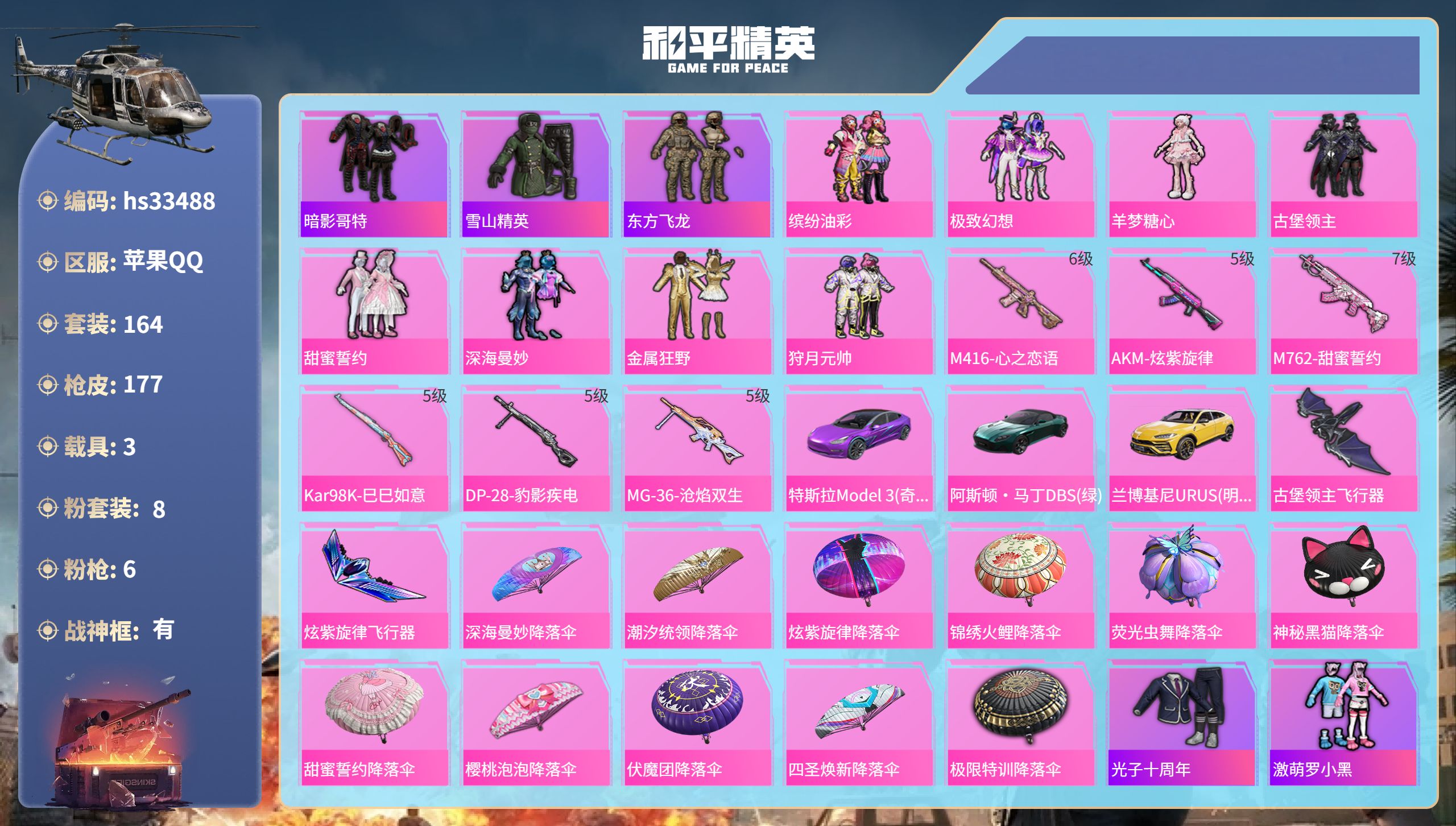 PX_2558592-,苹果手Q-14王牌印记-有战神框-8粉装-6特效枪-3载具-62284热力值-164套装-177枪皮-1卓越印记-1传奇印记 【8粉装】套装-狩月元帅,套装-缤纷油彩,套装-金属狂野,套装-深海曼妙,套装-极致幻想,套装-甜蜜誓约,角色-羊梦糖心,套装-古堡领主 【6特效枪】M416-心之恋语/6级,M762-甜蜜誓约/7级,DP-28-豹影疾电/5级,AKM-炫紫旋律/5级,MG-36-沧焰双生/5级,Kar98K-巳巳如意/5级 【3稀有紫装】暗影哥特,雪山精英,东方飞龙 【3稀有载具】特斯拉Model,3(奇幻紫),阿斯顿·马丁DBS(绿),兰博基尼URUS(明艳黄) 【164稀有时装】缤纷油彩,极致幻想,羊梦糖心,古堡领主,甜蜜誓约,深海曼妙,金属狂野,狩月元帅,光子十周年,雪山精英,暗影哥特,东方飞龙,激萌罗小黑,潮萌小黄鸭,神秘黑猫,软萌银虎,海上生明月,白糯汤圆,鱼渊荷华,大橘大利,燕燕于飞,战术大师,午间小调,星影赞美诗,朱霞炽焰,喜羊羊,美羊羊,凌霄紫焰,粉黛兰香,擎苍青焰,萌鸡速递,元气之梦,风迹短诗,薄荷星砂,顶瓜瓜,SS35特训,迷域探索者,SS5特训,SS31特训,SS33特训,SS32特训,红酒骑士,拳皇97八神庵,S5赛事,银河圣歌,暗夜契约,纯白誓言,夏日音浪,软嫩糖心蛋,潮流炫酷,SS8特训,众神之王,智慧之神,萌黄之夏,隐空刺,PEL摇滚竞梦者,海滨突袭者,超能拳王,S6赛事,摇滚狂鲨,恶魔宝贝,特训学院,红色运动,黄色运动,黄色伏地魔,白色伏地魔,SS9特训,白月香洋装,神秘舞者,顽皮玉兔,黎明保卫者,SS34特训,雪鹰学院,S2赛事,竞技名士,蓝色守护者,S3赛事,深蓝色名流,S4赛事,长空猛禽,竞技勇士朋克,时尚圣诞,特战装甲,乘风破浪,战地菁英,灰色格斗者,六六大吉,甜蜜告白,本愿之火,辉星之火,野性战魂,水银刺客,SS2特训,派对绅士,朋克之心,传奇侦探,极地朋克,甜蜜菠萝,半糖蓝莓,街舞之王,青春校园,战地名士,牛气满满,迎春赐吉,冰川特警,龙腾端午,燃烧卡路里,冷酷挑战者,SS11特训,梦魇先生,疯狂小兔子,圣诞大吉,北国孤狼,SS6特训,炽焰拳师,格斗专家,耀眼新星,坚韧舞者,竞技达人朋克,朋克治安官,野性战心,玲珑飞花,原初圣火,逆风勇士,跃动心情,SS7特训,幻世保卫者,娴静芝兰,霓虹街区,都市魅力,萌趣颜团子,SS10特训,风行保卫者,沙漠兵团,镭射皇者,风华少年志,探宝勇士,SS12特训,王子的夏天,SS18特训,冰凉西瓜,治愈之星,银白舞王,科技之星,SS13特训,特工红苹果,飞行日记,SS17特训,瑞龙福将,团圆交子,金耀舞者,蓝调潮人,异彩先驱,霓虹极客,滨海厨神,SS14特训,游猎者,刚毅裁决者,SS1特训,王牌教练,粉红小猪,鹤鸣,SS15特训,深蓝冒险家 【177稀有枪械】M416-心之恋语/6级,AKM-炫紫旋律/5级,M762-甜蜜誓约/7级,Kar98K-巳巳如意/5级,DP-28-豹影疾电/5级,MG-36-沧焰双生/5级,MK20-H-乌木金纹,DBS-风迹短诗,莫辛纳甘-风迹短诗,Mini14-鸡智如我,AKM-绿洲时空,Win94-乌木金纹,MK12-风迹短诗,撬棍-冷漠罗丽,DBS-幻彩电音,R45-幻彩电音,蜜獾-乌木金纹,MK20-H-狂鲨锋刃,铝热弹-炫彩糖果,Mk47-风迹短诗,JS9-凌霄紫焰,MG-36-凌霄紫焰,ARX-凌霄紫焰,AKS-74U-乌木金纹,AKM-涂鸦街区,蜜獾-风迹短诗,P92-凌霄紫焰,Famas-霓彩脉冲,破片手榴弹-拽到爆炸,平底锅-凌霄紫焰,Mk14-薄荷星砂,TMP-9-雪月幻音,Mk14-紫晶流影,SVD-霓彩脉冲,SLR-霓彩脉冲,SCAR-L-彩虹符号,S686-雪月幻音,AUG-紫晶流影,S12K-霓彩脉冲,AMR-鸡智如我,AKM-霓彩脉冲,M416-仓鼠灰灰,M416-神秘黑猫,M416-乌木金纹,M416-蓝色火焰,M416-夜灯,M416-动感兔斯基,M416-罗小黑,AKM-乌木金纹,AKM-彩虹符号,AKM-冰凉西瓜,AKM-玉龙,AKM-灼热熔岩,AKM-萌趣颜团子,AKM-霓虹街区,SCAR-L-红色方程式,SCAR-L-乌木金纹,SCAR-L-甜蜜誓约,SCAR-L-金风玉露,SCAR-L-炫彩节奏,SCAR-L-生命誓言,M16A4-乌木金纹,M16A4-夜灯,GROZA-乌木金纹,GROZA-异彩先驱,GROZA-治愈之星,GROZA-生命誓言,AUG-乌木金纹,QBZ-神秘黑猫,QBZ-赛罗,QBZ-原初圣火,QBZ-乌木金纹,M762-瑞龙福将,M762-镭射皇者,M762-拳皇97,M762-诡娃娃,M762-乌木金纹,M762-风花雪月,M762-牛气冲天,M762-乘风破浪,M762-深海曼妙,M762-天降萌叽,Mk47-乌木金纹,Mk47-洛神天依,G36C-不夜海上花,G36C-乌木金纹,Kar98K-彩虹符号,Kar98K-深海曼妙,Kar98K-勇闯险境,M24-众神之王,M24-治愈之星,AWM-乌木金纹,AWM-不夜海上花,Win94-瑞龙福将,SKS-勇闯险境,SKS-乌木金纹,VSS-乌木金纹,VSS-镭射皇者,Mini14-生命誓言,Mini14-金玉无双,Mini14-金鼠迎春,Mini14-原初圣火,Mini14-炫彩节奏,Mini14-异彩先驱,Mini14-海渊国主,Mk14-治愈之星,SLR-众神之王,QBU-不夜海上花,UZI-生命誓言,UZI-众神之王,UZI-影袭,UZI-金玉无双,UZI-金风玉露,UZI-天降萌叽,UMP45-生命誓言,UMP45-乌木金纹,UMP45-海渊国主,UMP45-金玉无双,Vector-乌木金纹,Vector-金玉无双,Vector-彩虹符号,Vector-治愈之星,汤姆逊-乌木金纹,汤姆逊-异彩先驱,汤姆逊-炫彩节奏,汤姆逊-勇闯险境,野牛-乌木金纹,野牛-扶摇飞仙,MP5K-异彩先驱,MP5K-甜蜜誓约,MP5K-众神之王,S686-不夜海上花,S686-乌木金纹,S686-深海曼妙,S1897-神秘黑猫,S1897-镭射皇者,S1897-潮汐统领,S1897-勇闯险境,S12K-瑞龙福将,M249-彩虹符号,M249-拳皇97,M249-乌木金纹,M249-星之彼岸,M249-镭射皇者,DP-28-彩虹符号,DP-28-清新柠檬,DP-28-乌木金纹,DP-28-原初圣火,DP-28-山经魅狐,MG3-瑞龙福将,P92-拳皇97,P18C-原初圣火,蝎式手枪-欢乐香蕉,平底锅-缤纷糖果,平底锅-众神之王,平底锅-原初圣火,平底锅-阿狸红,平底锅-勇闯险境,平底锅-治愈之星,平底锅-炫紫旋律,平底锅-拳皇97,平底锅-异彩先驱,平底锅-镭射皇者,平底锅-不夜海上花,平底锅-瑞龙福将,平底锅-火吻草莓,撬棍-快乐主宰,撬棍