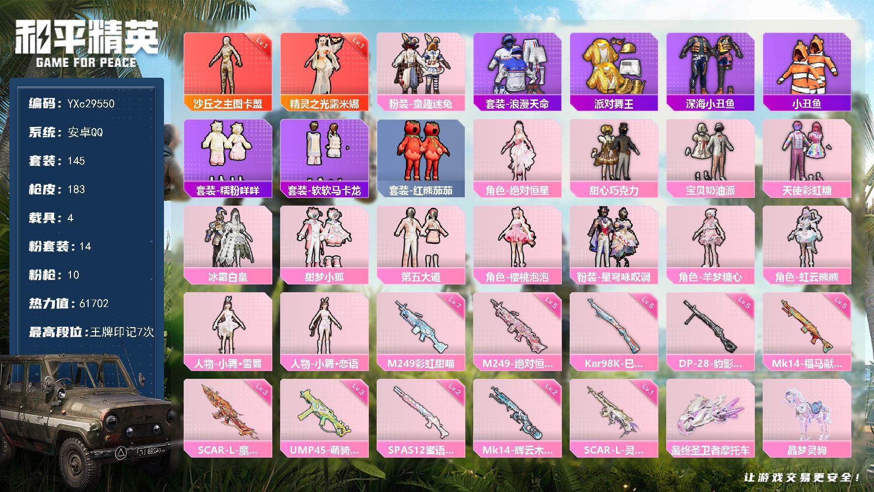 PX_2556638-图卡盟,精灵,金鞋,巧克力,小狐,番茄,马卡龙,咩咩】YXc29550-【无二次】【因赛季更新游戏段付以上号为准!】 ,安卓Q-2红装3稀有4载具14粉装10特效枪14热门145套装183枪皮,,7印记,历史绝世王牌20星, 【2红装】,精灵之光-露米娜,(1级),沙丘之主-图卡盟,(1级), 【3稀有】,浪漫天命,派对舞王,派对舞王(金靴子), 【4载具】,暮色幽蹄,九霄玄鹿,晶梦灵驹,最终圣卫者摩托车, 【14粉装】,宝贝奶油派,天使彩虹糖,甜心巧克力,虹云熊熊,小舞恋语,小舞雪昙,樱桃泡泡,星穹咏叹调,羊梦糖心,绝对恒星,第五大道,童趣迷兔,冰霜白皇,甜梦小狐, 【10特效枪】,SCAR-L-灵驹仙姬,(1级),SCAR-L-魔童闹海哪吒,(3级),Kar98K-巳巳如意,(5级),SPAS-12-蜜语绒猫,(2级),DP-28-豹影疾电,(5级),MK14-辉云木星,(2级),M249-绝对恒星,(5级),M249-彩虹甜喵,(7级),Mk14-福马献瑞,(5级),UMP45-萌骑冒险,(3级), 【14热门】,小丑鱼,浪漫假日,红熊茄茄,软软马卡龙,晶辉守护,小狗蛇点点,糯粉咩咩,鹰眼刺客,兔兔白日梦,奶芙汪汪,恶魔喵喵,深海小丑鱼,漫步者,破蛋小黄鸡, 【2头盔】,童趣迷兔头盔,甜心宝贝头盔, 【1背包】,甜心宝贝背包,