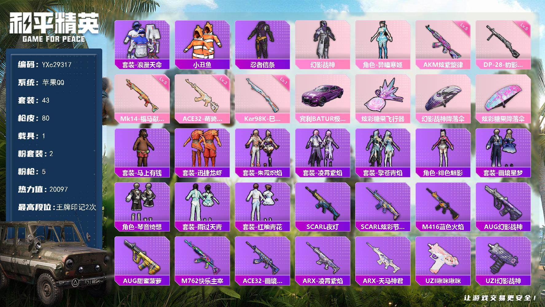 PX_2555977-??铁天赋】YXc29018-【可二次】【因赛季更新游戏段付以上号为准!】 ,苹果Q-1粉装3特效枪3热门56套装94枪皮,,4印记,历史超级王牌4星, 【1粉装】,幻彩电音, 【3特效枪】,Kar98K-巳巳如意,(5级),MG-36-沧焰双生,(5级),DP-28-豹影疾电,(5级), 【3热门】,龟仙人,韶华初心,破蛋小黄鸡