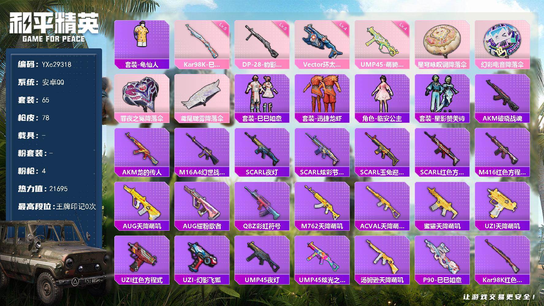 PX_2556043-,手Q-3粉装-9特效枪-1粉色飞行器-82123热力值-18王牌印记-214套装-295枪皮,Q钱包未注销 【热门品类】:套装-派对舞王,套装-深海小丑鱼,套装-金羽特工,套装-龟仙人,角色-Mark.06 【粉色套装】:角色-狂花道·不知火舞,角色-绯穹魔姬,角色-辉云木星 【粉色枪皮等级】:M416-心之恋语(七级),GROZA-镜光银凌(五级),AUG-暖羊咩咩(五级),ACE32-萌骑漫游(四级),UMP45-量子极限(五级),AKS-74U-森灵之息(五级),Kar98K-巳巳如意(五级),Mk14-福马献瑞(四级),DP-28-豹影疾电(五级) 【粉色枪皮】:M416-心之恋语,GROZA-镜光银凌,AUG-暖羊咩咩,ACE32-萌骑漫游,UMP45-量子极限,AKS-74U-森灵之息,Kar98K-巳巳如意,Mk14-福马献瑞,DP-28-豹影疾电 【粉色飞行器】:炫彩糖果飞行器 【粉色降落伞】:未来战士降落伞,神秘黑猫降落伞,四圣焕新降落伞,暗夜玫瑰降落伞,环太平洋降落伞,江南烟雨降落伞,星穹咏叹调降落伞,异瞳寒姬降落伞,炫彩糖果降落伞 【稀有套装】:套装-龟仙人,套装-巳巳如意,套装-雪国风尚,套装-炫彩糖果,角色-X,角色-阿虎,套装-马上有钱,套装-雏菊兔兔,套装-萝兰蝴蝶,套装-小熊娃娃,角色-狂花道·雅典娜,套装-糖糖葫芦,套装-青团波波,套装-棉花软糖,角色-怀庆长公主,套装-燕燕于飞,套装-鱼渊荷华,角色-海琴烟,套装-粉恋花,套装-紫幽梦,套装-蓝冰羽,套装-星影赞美诗,套装-彩虹兔,套装-云朵鹅,套装-雪绒豹,角色-夜瞳黯灵,套装-朱霞炽焰,套装-凌霄紫焰,套装-擎苍青焰,角色-申公豹,套装-书海巡游,套装-画境星梦,套装-琴音绮想,套装-雨过天青,套装-红釉青花 【稀有枪皮】:AUG-冰晶雪宝,AKM-四圣焕新,AKM-夜灯,AKM-影袭,AKM-破晓战魂,AKM-缤纷海域,AKM-虎虎生威,AKM-龙的传人,AKM-灵猫魔法师,M16A4-幻世战舞者,M16A4-甜心亚梦,M16A4-红色方程式,M16A4-蓝色火焰,SCAR-L-夜灯,SCAR-L-炫彩节奏,SCAR-L-玉兔迎春,SCAR-L-红色方程式,M416-夜灯,M416-糯团青竹,M416-红色方程式,M416-蓝色火焰,GROZA-影袭,GROZA-懵萌