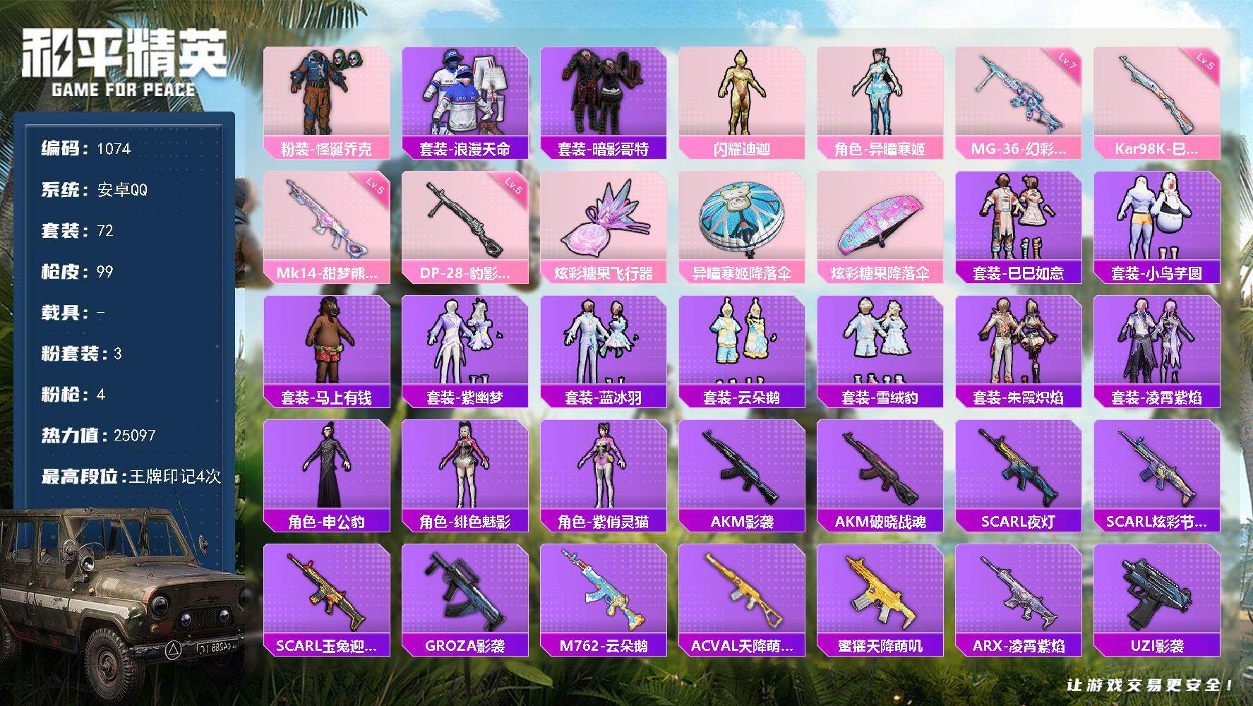 PX_2556004-,手Q-【天赋8级,身法号,怪诞乔克/浪漫天命/暗影哥特】3粉装-4特效枪-1粉色飞行器-25097热力值-4王牌印记-72套装-99枪皮 【热门品类】:粉装-怪诞乔克,套装-浪漫天命,套装-暗影哥特 【粉色套装】:粉装-怪诞乔克,角色-闪耀迪迦,角色-异瞳寒姬 【粉色枪皮等级】:Kar98K-巳巳如意(五级),Mk14-甜梦熊击(五级),DP-28-豹影疾电(五级),MG-36-幻彩电音(七级) 【粉色枪皮】:Kar98K-巳巳如意,Mk14-甜梦熊击,DP-28-豹影疾电,MG-36-幻彩电音 【粉色飞行器】:炫彩糖果飞行器 【粉色降落伞】:异瞳寒姬降落伞,炫彩糖果降落伞 【稀有套装】:套装-巳巳如意,套装-小鸟芋圆,套装-雪国风尚,套装-炫彩糖果,套装-马上有钱,套装-紫幽梦,套装-蓝冰羽,套装-云朵鹅,套装-雪绒豹,套装-朱霞炽焰,套装-凌霄紫焰,角色-申公豹,角色-绯色魅影,角色-紫俏灵猫 【稀有枪皮】:AUG-冰晶雪宝,AKM-影袭,AKM-破晓战魂,SCAR-L-夜灯,SCAR-L-炫彩节奏,SCAR-L-玉兔迎春,GROZA-影袭,M762-云朵鹅,AC-VAL-天降萌叽,蜜獾-天降萌叽,ARX-凌霄紫焰,UZI-影袭,UMP45-夜灯,JS9-凌霄紫焰,P90-巳巳如意,Kar98K-影袭,Kar98K-炫彩节奏,Kar98K-星穹咏叹调,M24-影袭,Mini14-耀粉歌者,SVD-云朵鹅,S686-奇异狩猎者,S686-生命誓言,S686-巳巳如意,S12K-夜灯,S12K-幻世战舞者,DBS-第五大道,DBS-荧海星豚,DBS-幻彩电音,SPAS-12-云朵鹅,MG3-幻世战舞者,MG-36-凌霄紫焰,P92-凌霄紫焰,短管霰弹-星穹咏叹调,沙漠之鹰-云朵鹅,大砍刀-云朵鹅,平底锅-凌霄紫焰,破片手榴弹-巳巳如意 【其他套装】:套装-人气偶像,套装-冷焰舞者,套装-完美偶像,套装-幻影武者,套装-旭日情侣,套装-暗影哥特,套装-极速红龙,套装-森林游猎者,套装-浪漫天命,套装-海岛探路者,套装-湖蓝色名流,套装-滨海厨神,套装-特殊使命,套装-狂沙舞者,套装-猛禽,套装-生化防暴队,套装-白色伏地魔,套装-破蛋小黄鸡,套装-红色运动,套装-缤纷果语,套装-耀粉歌者,套装-都市魅力,套装-长空猛禽,套装-魅力单车,套装-鹤鸣,套装-黄色运