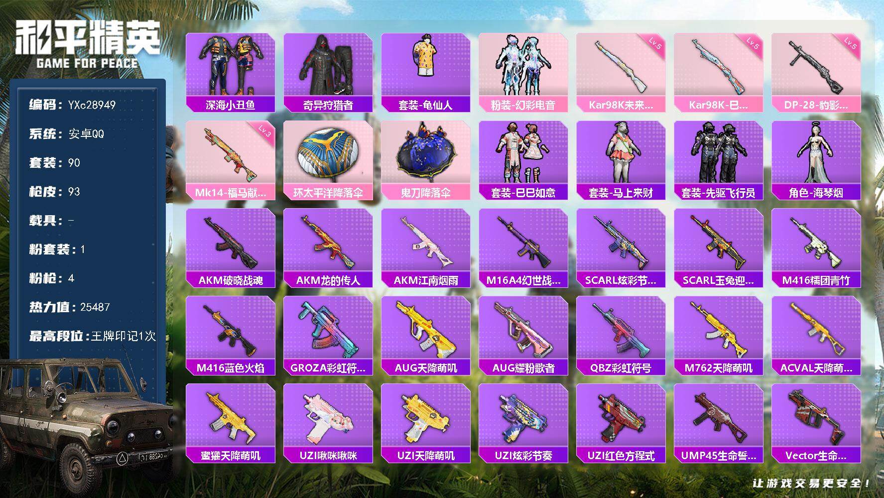 PX_2554363-??尾】YXc28949-【可二次】【因赛季更新游戏段付以上号为准!】 ,安卓Q-1稀有1粉装4特效枪5热门90套装93枪皮,,1印记,历史超级王牌4星, 【1稀有】,奇异狩猎者, 【1粉装】,幻彩电音, 【4特效枪】,Kar98K-巳巳如意,(5级),DP-28-豹影疾电,(5级),Kar98K-未来歌姬,(5级),Mk14-福马献瑞,(3级), 【5热门】,龟仙人,深海小丑鱼,破蛋小黄鸡,极速红龙,弄潮海豚,