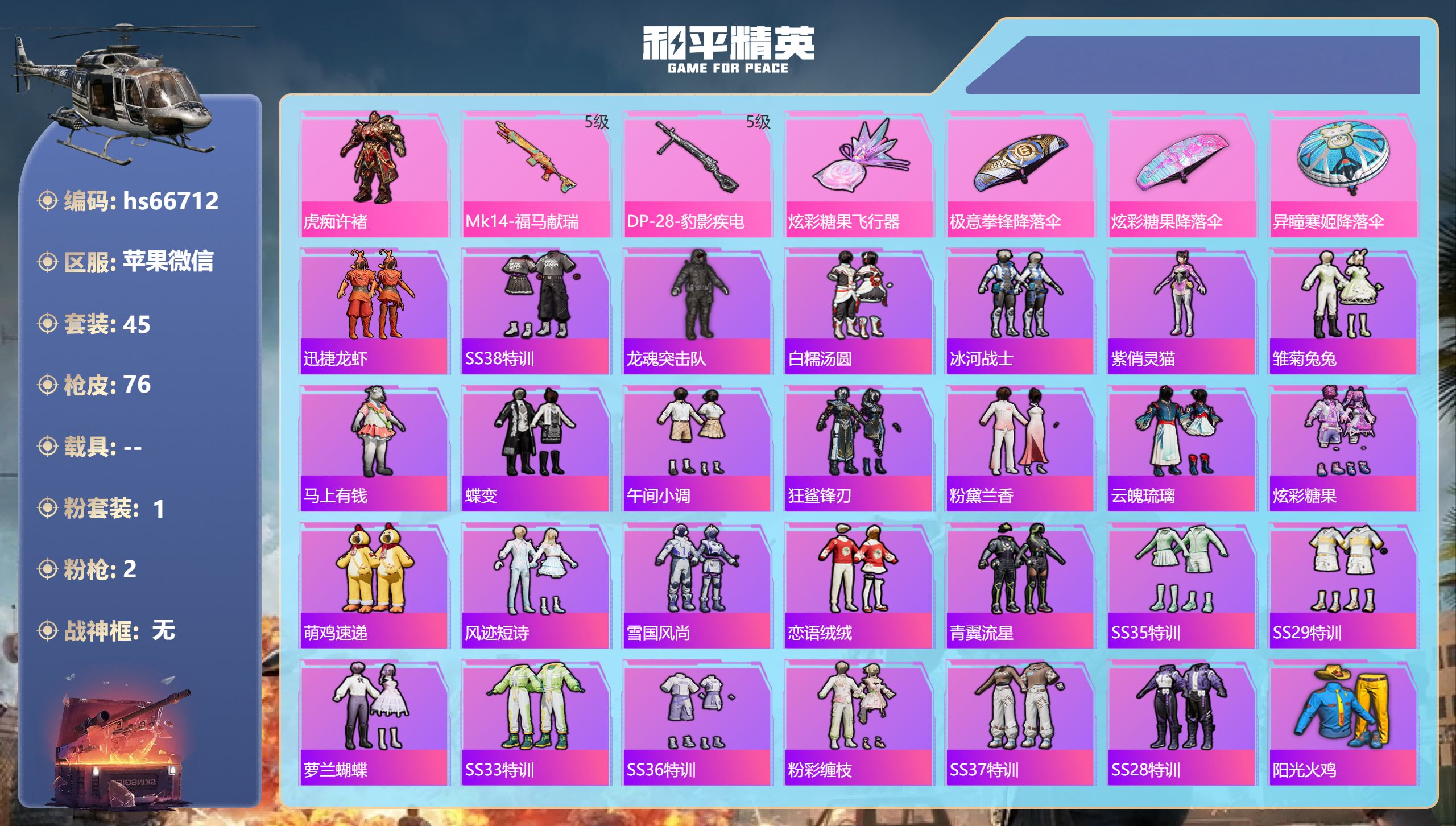 PX_2543923-,苹果微信-4王牌印记-1粉装-2特效枪-19325热力值-45套装-76枪皮 【1粉装】角色-虎痴许褚 【2特效枪】DP-28-豹影疾电/5级,Mk14-福马献瑞/5级 【45稀有时装】虎痴许褚,迅捷龙虾,SS38特训,龙魂突击队,白糯汤圆,冰河战士,紫俏灵猫,雏菊兔兔,马上有钱,蝶变,午间小调,狂鲨锋刃,粉黛兰香,云魄琉璃,炫彩糖果,萌鸡速递,风迹短诗,雪国风尚,恋语绒绒,青翼流星,SS35特训,SS29特训,萝兰蝴蝶,SS33特训,SS36特训,粉彩缠枝,SS37特训,SS28特训,阳光火鸡,SS34特训,竞技名士,长空猛禽,魅力单车,狙击之神,红釉青花,雨过天青,福马献瑞,完美偶像,破蛋小黄鸡,海岛探路者,缤纷果语,天籁歌者,海盐绵绵冰,老实芭蕉,柠萌假日 【77稀有枪械】Mk14-福马献瑞/5级,DP-28-豹影疾电/5级,DBS-乌木金纹,SCAR-L-海盐豹豹,GROZA-海盐豹豹,野牛-雏菊兔兔,蝎式手枪-金丰海韵,Mk14-冰河战士,平底锅-雏菊兔兔,M762-雏菊兔兔,Mini14-雏菊兔兔,Famas-突变脉冲,R1895-雏菊兔兔,UZI-冰河战士,M16A4-冰河战士,MK20-H-乌木金纹,DBS-风迹短诗,莫辛纳甘-风迹短诗,M416-错位像素,Win94-乌木金纹,MK12-风迹短诗,MK12-乌木金纹,破片手榴弹-爆破雪人,SPAS-12-狂鲨锋刃,MK20-H-狂鲨锋刃,铝热弹-炫彩糖果,UZI-炫彩糖果,ARX-像素花束,大砍刀-像素花束,Mk47-风迹短诗,AKS-74U-乌木金纹,蜜獾-风迹短诗,Famas-霓彩脉冲,破片手榴弹-拽到爆炸,信号枪-异瞳寒姬,MG-36-薄荷星砂,SLR-霓彩脉冲,SCAR-L-彩虹符号,S12K-霓彩脉冲,AKM-霓彩脉冲,M416-红色方程式,M416-蓝色火焰,AKM-破晓战魂,AKM-龙的传人,AUG-耀粉歌者,QBZ-洛神天依,M762-天降萌叽,Mk47-洛神天依,Kar98K-红色方程式,M24-炫彩节奏,AWM-天降萌叽,SKS-炫彩节奏,Mini14-耀粉歌者,UZI-啾咪啾咪,UMP45-蓝色火焰,Vector-生命誓言,汤姆逊-耀粉歌者,汤姆逊-天降萌叽,S686-红色方程式,S12K-破晓战魂,M249-彩虹符号,MG3-幻世战舞者,M200-罪夜之冕,MG3-火熔核心,ACE32-冰晶雪宝,M16A4-雨过天青,GROZA-福马献瑞,蜜獾-启元战纹,AMR-雨过天青,SLR-乌木金纹,AA12-G-雨过天青,PKM-雨过天青,沙漠之鹰-雨过天青,燃烧瓶-福马献瑞,Vector-荒原烈焰,汤姆逊-像素花束,MG3-火熔核心 【5稀有飞行器】马上有福飞行器,鸡智如我飞行器,炫彩糖果飞行器,光之冒险尾迹,粉色滑翔尾迹 【15稀有背包】狂鲨锋刃背包(3级),炫彩糖果背包(3级),异瞳寒姬背包(3级),粉黛兰香背包(3级),萌鸡速递背包(3级),风迹短诗背包(3级),金丰海韵背包(3级),海盐豹豹背包(3级),蝶变背包(3级),雪国风尚背包(3级),洛神天依背包(3级),雨过天青背包(3级),福马献瑞背包(3级),雏菊兔兔背包(3级),冰河战士背包(3级) 【20稀有降落伞】SS35王牌降落伞,极意拳锋降落伞,SS36王牌降落伞,炫彩糖果降落伞,狂鲨锋刃降落伞,雨过天青降落伞,福马献瑞降落伞,异瞳寒姬降落伞,风迹短诗降落伞,月下萌萌兔降落伞,天涯共此时降落伞,普通降落伞,比翼双飞降落伞,SS29王牌降落伞,雏菊兔兔降落伞,游龙飞鱼降落伞,极冰使者降落伞,干得PEL亮降落伞,勇者同行降落伞,冰河战士降落伞 【11稀有头盔】雪国风尚头盔(3级),冷漠罗丽头盔(3级),狂鲨锋刃头盔(3级),炫彩糖果头盔(3级),粉黛兰香头盔(3级),萌鸡速递头盔(3级),风迹短诗头盔(3级),雨过天青头盔(3级),海盐豹豹头盔(3级),福马献瑞头盔(3级),冰河战士头盔(3级)