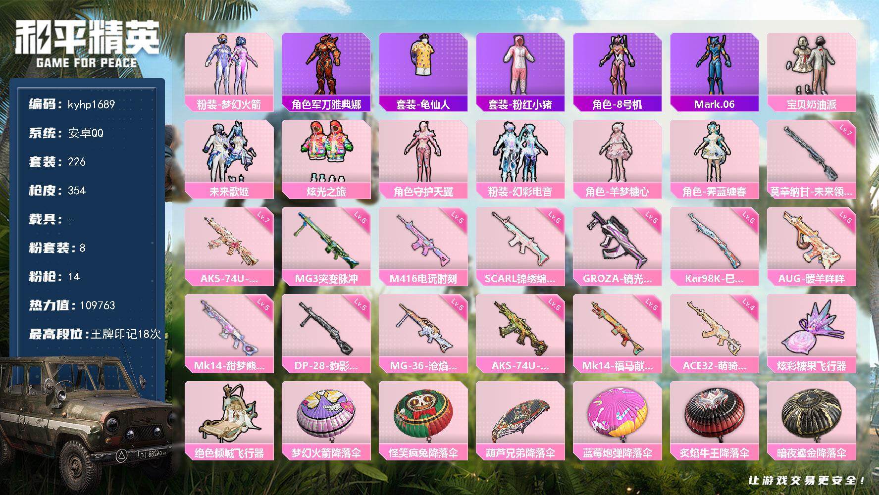 PX_2554570--8粉装-14特效枪-0载具-3粉色飞行器-109763热力值-18王牌印记-226套装-354枪皮 【热门品类】:粉装-梦幻火箭,角色-军刀雅典娜,套装-龟仙人,套装-粉红小猪,角色-8号机,角色-Mark.06 【粉色套装】:粉装-宝贝奶油派,粉装-梦幻火箭,粉装-未来歌姬,粉装-炫光之旅,角色-守护天翼,粉装-幻彩电音,角色-羊梦糖心,角色-霁蓝缠春 【粉色枪皮等级】:SCAR