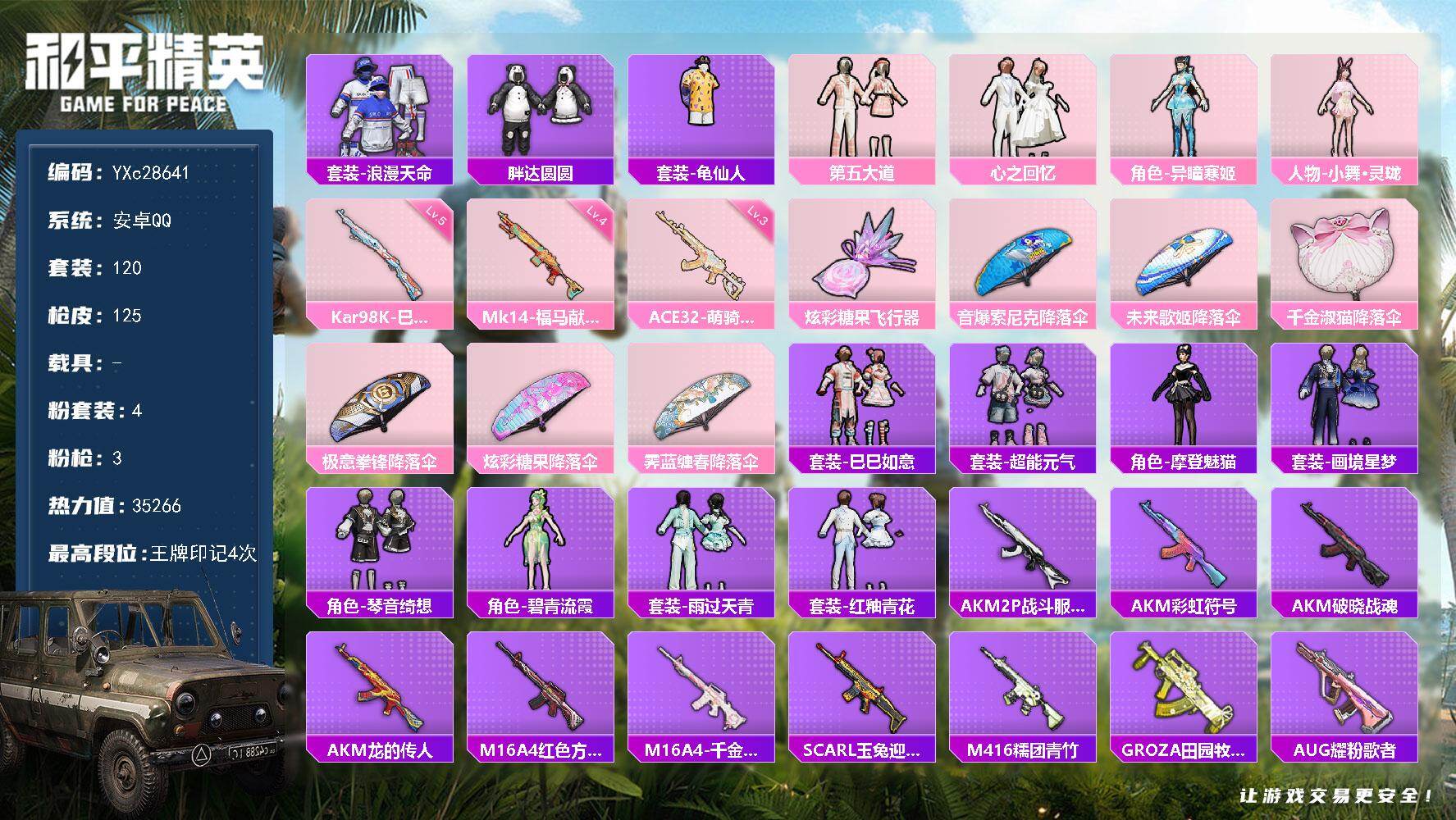PX_2554618-??大道,胖达】YXc28641,-【无二次协助处理】【因赛季更新游戏段付以上号为准!】 ,安卓Q-1稀有4粉装3特效枪4热门120套装125枪皮,4印记,历史超级王牌6星, 【1稀有】,浪漫天命, 【4粉装】,小舞灵珑,异瞳寒姬,第五大道,心之回忆, 【3特效枪】,Kar98K-巳巳如意,(5级),Mk14-福马献瑞,(4级),ACE32-萌骑漫游,(3级), 【4热门】,龟仙人,胖达圆圆,破蛋小黄鸡,极速红龙,