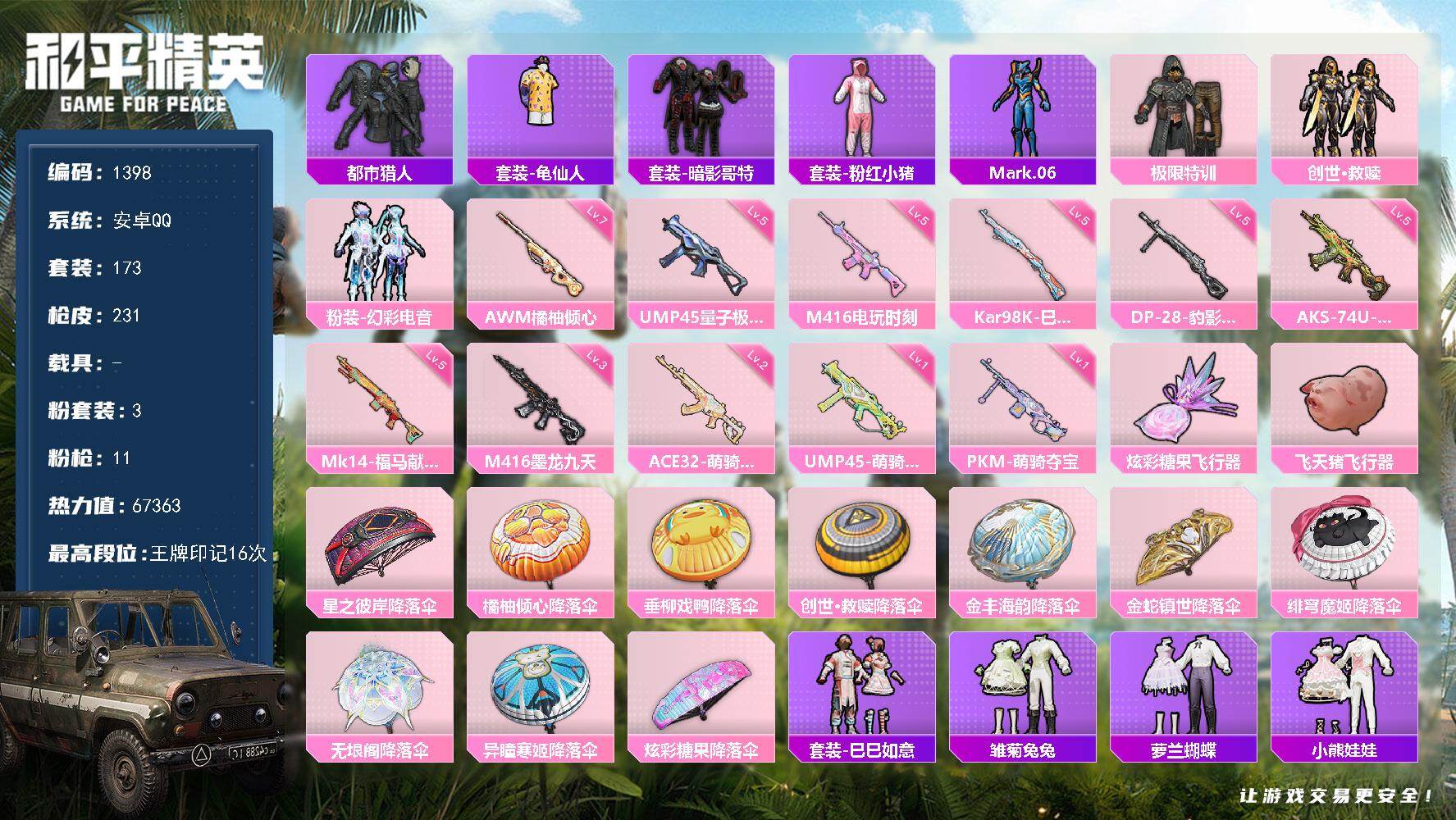 PX_2554602-【Mark.06,11粉枪,枪皮号!!】安卓,手Q-3粉装-11特效枪-0载具-2粉色飞行器-67363热力值-16王牌印记-173套装-231枪皮 【热门品类】:套装-都市猎人,套装-龟仙人,套装-暗影哥特,套装-粉红小猪,角色-Mark.06 【粉色套装】:粉装-极限特训,套装-创世·救赎,粉装-幻彩电音 【粉色枪皮等级】:M416-电玩时刻(五级),M416-墨龙九天(三级),ACE32-萌骑漫游(二级),UMP45-量子极限(五级),UMP45-萌骑冒险(一级),AKS-74U-森灵之息(五级),Kar98K-巳巳如意(五级),AWM-橘柚倾心(七级),Mk14-福马献瑞(五级),DP-28-豹影疾电(五级),PKM-萌骑夺宝(一级) 【粉色枪皮】:M416-电玩时刻,M416-墨龙九天,ACE32-萌骑漫游,UMP45-量子极限,UMP45-萌骑冒险,AKS-74U-森灵之息,Kar98K-巳巳如意,AWM-橘柚倾心,Mk14-福马献瑞,DP-28-豹影疾电,PKM-萌骑夺宝 【粉色飞行器】:炫彩糖果飞行器,飞天猪飞行器 【粉色降落伞】:星之彼岸降落伞,橘柚倾心降落伞,垂柳戏鸭降落伞,创世·救赎降落伞,金丰海韵降落伞,金蛇镇世降落伞,绯穹魔姬降落伞,无垠阁降落伞,异瞳寒姬降落伞,炫彩糖果降落伞 【稀有套装】:套装-龟仙人,套装-巳巳如意,套装-雪国风尚,套装-炫彩糖果,套装-雏菊兔兔,套装-萝兰蝴蝶,套装-小熊娃娃,角色-拉斐尔,套装-火种守卫者,套装-糖糖葫芦,套装-青团波波,套装-棉花软糖,套装-燕燕于飞,套装-鱼渊荷华,角色-风玲,套装-彩虹兔,套装-云朵鹅,套装-雪绒豹,套装-蓝海鲸歌,套装-朱霞炽焰,套装-凌霄紫焰,套装-擎苍青焰,角色-绯色魅影,套装-书海巡游,套装-画境星梦,套装-琴音绮想,角色-月烬之祷,套装-雨过天青,套装-红釉青花 【稀有枪皮】:AUG-冰晶雪宝,AKM-彩虹符号,AKM-灼热熔岩,AKM-破晓战魂,AKM-龙的传人,AKM-极光猎影,M16A4-幻世战舞者,SCAR-L-夜灯,SCAR-L-炫彩节奏,SCAR-L-玉兔迎春,M416-糯团青竹,M416-红色方程式,M416-绯红前夜,M416-蓝色火焰,GROZA-彩虹符号,GROZA-春暖花开,AUG-天降萌叽,AUG-甜蜜菠萝,AUG-耀粉歌者,AUG-闲梦青缨,AUG-金蛇镇世,QBZ-彩虹符号,QBZ-飞驰魅影,M762-天降萌叽,M762-橘柚倾心,M762-绯红前夜,M762-云朵鹅,AC-VAL-天降萌叽,蜜獾-天降萌叽,蜜獾-娇憨猪猪,蜜獾-虎痴许褚,ACE32-画境星梦,ARX-凌霄紫焰,UZI-啾咪啾咪,UZI-天降萌叽,UZI-娇憨猪猪,UZI-金风玉露,UMP45-夜灯,UMP45-春暖花开,UMP45-涂山之恋,UMP45-生命誓言,UMP45-蓝色火焰,UMP45-极意拳锋,Vector-彩虹符号,Vector-生命誓言,Vector-金玉无双,汤姆逊-天降萌叽,汤姆逊-炫彩节奏,汤姆逊-樱桃泡泡,汤姆逊-像素花束,汤姆逊-智耀战神,MP5K-画境星梦,JS9-凌霄紫焰,P90-倾城蜜语,P90-快闪甜心,P90-飞驰魅影,P90-巳巳如意,Kar98K-六号树人,Kar98K-炫彩节奏,Kar98K-王子的夏天,Kar98K-飞驰魅影,M24-影袭,M24-炫彩节奏,SKS-炫彩节奏,VSS-彩虹符号,VSS-星之彼岸,Mini14-春暖花开,SLR-娇憨猪猪,SLR-彩虹符号,M417-惊鸿侠骨,M200-惊鸿侠骨,SVD-云朵鹅,M1加兰德-画境星梦,S686-橘柚倾心,S686-生命誓言,S686-巳巳如意,S1897-春暖花开,S1897-炫彩节奏,S1897-飞驰魅影,S12K-玩趣呆呆,S12K-夜灯,S12K-娇憨猪猪,DBS-彩虹符号,AA12-G-画境星梦,SPAS-12-云朵鹅,M249-冰封烈焰,M249-彩虹符号,M249-百万伏特,M249-糯团青竹,DP-28-旋转彩虹,DP-28-橘柚倾心,MG3-幻世战舞者,MG3-惊鸿侠骨,MG3-第五大道,MG-36-凌霄紫焰,P92-凌霄紫焰,短管霰弹-星穹咏叹调,沙漠之鹰-快闪甜心,沙漠之鹰-旋转彩虹,沙漠之鹰-云朵鹅,爆炸猎弓-惊鸿侠骨,爆炸猎弓-喜羊羊与灰太狼,大砍刀-云朵鹅,平底锅-凌霄紫焰,平底锅-画境星梦,破片手榴弹-巳巳如意 【其他套装】:套装-SS19特训,套装-SS20特训,套装-SS21特训,套装-SS22特训,套装-SS23特训,套装-SS24特训,套装-SS25特训,套装-SS26特训,套装-SS27特训,套装-SS28特训,套装-SS29特训,套装-光之冒险,套装-冷焰舞者,套装-千禧之恋,套装-夏日倾情,套装-夏日音浪,套装-完美偶像,套装-幻世保卫者,套装-幻世战舞者,套装-幻影武者,套装-战地督导,套装-旭日情侣,套装-春日漫步,套装-暗影哥特,套装-暗金炫舞,套装-极速红龙,套装-柠萌假日,套装-森林游猎者,套装-海岛探路者,套装-涂山之恋,套装-深蓝色名流,套装-湖蓝色名流,套装-滨海厨神,套装-潮流炫酷,套装-灼焰舞者,套装-炫蓝之夏,套装-燃烧卡路里,套装-牛气冲天,套装-牛气满满,套装-特战装甲,套装-特训学院,套装-猎鹰,套装-猛禽,套装-玉兔迎春,套装-王牌教练,套装-白熊同盟,套装-白色伏地魔,套装-破晓战魂,套装-破蛋小黄鸡,套装-竞技名士,套装-竞技达人朋克,套装-粉红小猪,套装-红色运动,套装-绮丽涂鸦,套装-绯格组合,套装-缤纷果语,套装-耀眼新星,套装-耀粉歌者,套装-荣耀,套装-萌黄之夏,套装-蓝彩潮人,套装-蓝色运动,套装-街头潮人,套装-都市魅力,套装-酷潮明星,套装-野性战心,套装-长空猛禽,套装-青涩时光,套装-青玉碎影,套装-魅力单车,套装-鹤鸣,套装-麻辣教官,套装-黄色伏地魔,套装-黄色运动,套装-黑色伏地魔,套装-龙的传人,套装-龟仙人,套装-特战英豪,套装-沙漠毒蛇,套装-漫步者,套装-水银刺客,套装-冷酷挑战者,套装-蓝调潮人,套装-清新柠檬,套装-东方飞龙,套装-核芯基因,套装-新侠客行,套装-飞驰魅影,套装-音速流光,套装-沁蓝冰爽,套装-浓情蜜辣,套装-娇憨猪猪,套装-萌趣咩咩,套装-熠彩粉晶,套装-惊鸿侠骨,套装-锦衣飞扬,套装-春光漫游,角色-蝶吟花词,角色-白光莹,套装-纯真浪花,套装-热情海星,套装-曼妙人鱼,角色-Mark.06 【稀有背包】:银河战甲背包(2级),深海小丑鱼背包(3级) 【营地ID】:910878350