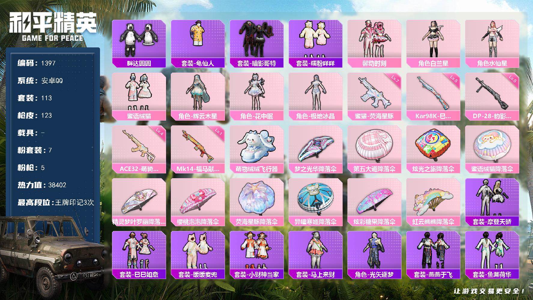 PX_2554603-【7粉装5粉枪,蜜獾-荧海星豚(七级),粉装-蜜语绒猫,暗影哥特,,糯粉咩咩,花中眠,极地冰晶】安卓,手Q-7粉装-5特效枪-0载具-1粉色飞行器-38402热力值-3王牌印记-113套装-123枪皮 【热门品类】:套装-胖达圆圆,套装-龟仙人,套装-暗影哥特,套装-糯粉咩咩 【粉色套装】:粉装-馨动时刻,角色-白兰星,角色-水仙星,粉装-蜜语绒猫,角色-辉云木星,角色-花中眠,角色-极地冰晶 【粉色枪皮等级】:蜜獾-荧海星豚(七级),ACE32-萌骑漫游(四级),Kar98K-巳巳如意(五级),Mk14-福马献瑞(一级),DP-28-豹影疾电(五级) 【粉色枪皮】:蜜獾-荧海星豚,ACE32-萌骑漫游,Kar98K-巳巳如意,Mk14-福马献瑞,DP-28-豹影疾电 【粉色飞行器】:萌物绒绒飞行器 【粉色降落伞】:梦之光华降落伞,第五大道降落伞,炫光之旅降落伞,蜜语绒猫降落伞,精灵梦叶罗丽降落伞,樱桃泡泡降落伞,荧海星豚降落伞,异瞳寒姬降落伞,炫彩糖果降落伞,虹云熊熊降落伞 【稀有套装】:套装-龟仙人,套装-摩登天骄,套装-巳巳如意,套装-暖暖麦兜,套装-小财神当家,套装-马上来财,角色-光矢逐梦,套装-燕燕于飞,套装-鱼渊荷华,套装-晶辉守护,套装-云朵鹅,套装-雪绒豹,玩偶服-懒羊羊,角色-绯色魅影,套装-雨过天青,套装-红釉青花,角色-极夜星羊,角色-幽雨猫猫 【稀有枪皮】:AKM-彩虹符号,AKM-破晓战魂,AKM-龙的传人,SCAR-L-夜灯,SCAR-L-炫彩节奏,M416-糯团青竹,GROZA-懵萌河马,GROZA-荧海星豚,AUG-天降萌叽,AUG-耀粉歌者,QBZ-彩虹符号,M762-天降萌叽,M762-萌物绒绒,M762-云朵鹅,Mk47-妙红点点,Mk47-虹云熊熊,G36C-懵萌河马,G36C-星穹咏叹调,AC-VAL-天降萌叽,蜜獾-天降萌叽,UMP45-生命誓言,UMP45-绒宝小鹅,Vector-生命誓言,Vector-音爆索尼克,汤姆逊-天降萌叽,汤姆逊-炫彩节奏,汤姆逊-像素花束,P90-快闪甜心,P90-甜蜜旋律,Kar98K-六号树人,AWM-胡桃卫兵,SKS-炫彩节奏,SKS-折梦之诗,VSS-绿野极光,Mini14-涂山之恋,SLR-彩虹符号,莫辛纳甘-懵萌河马,AMR-妙红点点,M417-虹云熊熊,MK20-H-莲影清波,MK20-H-绶带小兔,SVD-云朵鹅,S686-生命誓言,S686-巳巳如意,S1897-荧海星豚,S12K-玩趣呆呆,DBS-彩虹符号,DBS-荧海星豚,SPAS-12-云朵鹅,M249-妙红点点,M249-彩虹符号,M249-糯团青竹,DP-28-彩虹符号,MG3-妙红点点,MG3-幻世战舞者,MG3-第五大道,PKM-蜜语绒猫,PKM-懵萌河马,短管霰弹-星穹咏叹调,沙漠之鹰-云朵鹅,爆炸猎弓-花中眠,大砍刀-云朵鹅,破片手榴弹-巳巳如意 【其他套装】:套装-SS22特训,套装-SS23特训,套装-SS24特训,套装-SS25特训,套装-SS28特训,套装-人气偶像,套装-光之冒险,套装-冷焰舞者,套装-夏日倾情,套装-完美偶像,套装-旭日情侣,套装-春日漫步,套装-暗影哥特,套装-暗金炫舞,套装-极速红龙,套装-柠萌假日,套装-森林游猎者,套装-海岛探路者,套装-涂山之恋,套装-湖蓝色名流,套装-潮流炫酷,套装-热血青春,套装-特训学院,套装-猛禽,套装-王牌教练,套装-疯狂小兔子,套装-白色伏地魔,套装-破蛋小黄鸡,套装-福星高照,套装-竞技名士,套装-竞技达人朋克,套装-糯粉咩咩,套装-红色运动,套装-绯格组合,套装-缤纷果语,套装-耀粉歌者,套装-荣耀,套装-萌黄之夏,套装-蓝色运动,套装-都市魅力,套装-酒红色名流,套装-长空猛禽,套装-青年教官,套装-青涩时光,套装-青玉碎影,套装-顽皮玉兔,套装-飞行日记,套装-魅力单车,套装-黄色名流,套装-黄色运动,套装-龙的传人,套装-龟仙人,套装-魔力冰咖,套装-兔兔白日梦,套装-软羊咩咩,套装-妙红点点,套装-幻彩翩翩,套装-莱茵河畔,套装-懵萌河马,套装-神气柴柴,套装-绝对偶像,套装-春光漫游,套装-童真绒兔,套装-萌趣绒叽 【营地ID】:936004549