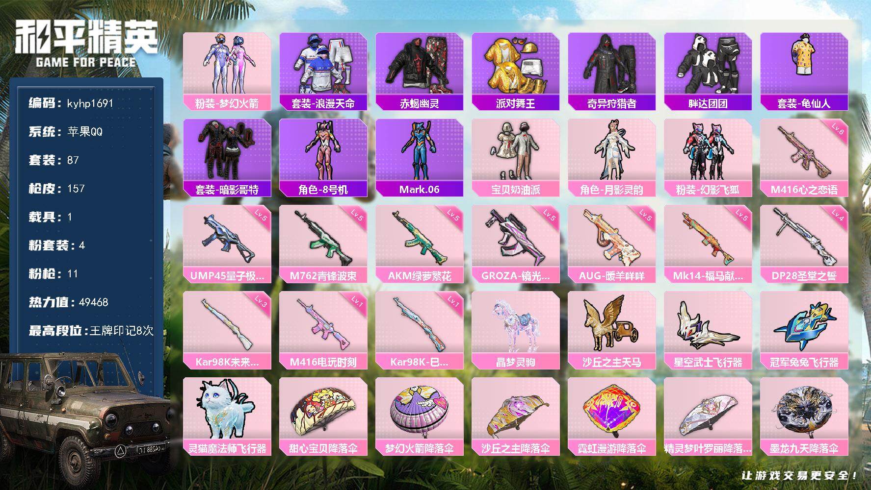 PX_2554596--4粉装-11特效枪-1载具-5粉色飞行器-49468热力值-8王牌印记-87套装-157枪皮 【热门品类】:粉装-梦幻火箭,套装-浪漫天命,套装-赤蝎幽灵,套装-派对舞王,套装-奇异狩猎者,套装-胖达团团,套装-龟仙人,套装-暗影哥特,角色-8号机,角色-Mark.06 【粉色套装】:粉装-宝贝奶油派,粉装-梦幻火箭,角色-月影灵韵,粉装-幻影飞狐 【粉色枪皮等级】:AKM-绿萝繁