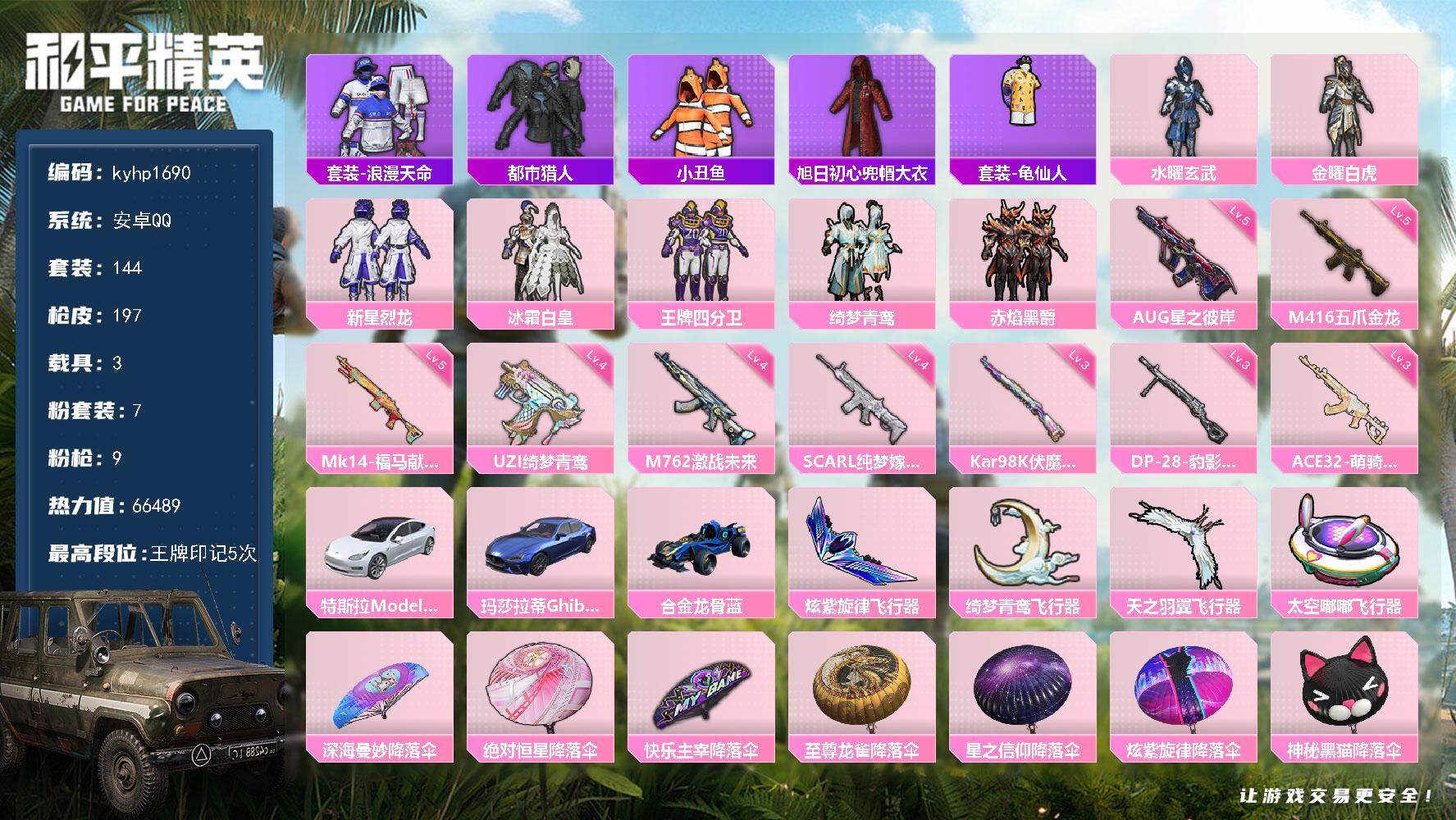 PX_2554623--7粉装-9特效枪-3载具-4粉色飞行器-66489热力值-5王牌印记-144套装-197枪皮 【热门品类】:套装-浪漫天命,套装-都市猎人,套装-小丑鱼,旭日初心兜帽大衣,套装-龟仙人 【粉色套装】:粉装-水曜玄武,粉装-金曜白虎,粉装-新星烈龙,粉装-冰霜白皇,粉装-王牌四分卫,粉装-绮梦青鸾,粉装-赤焰黑爵 【粉色枪皮等级】:SCAR-L-纯梦嫁纱(四级),M416-五爪金龙(