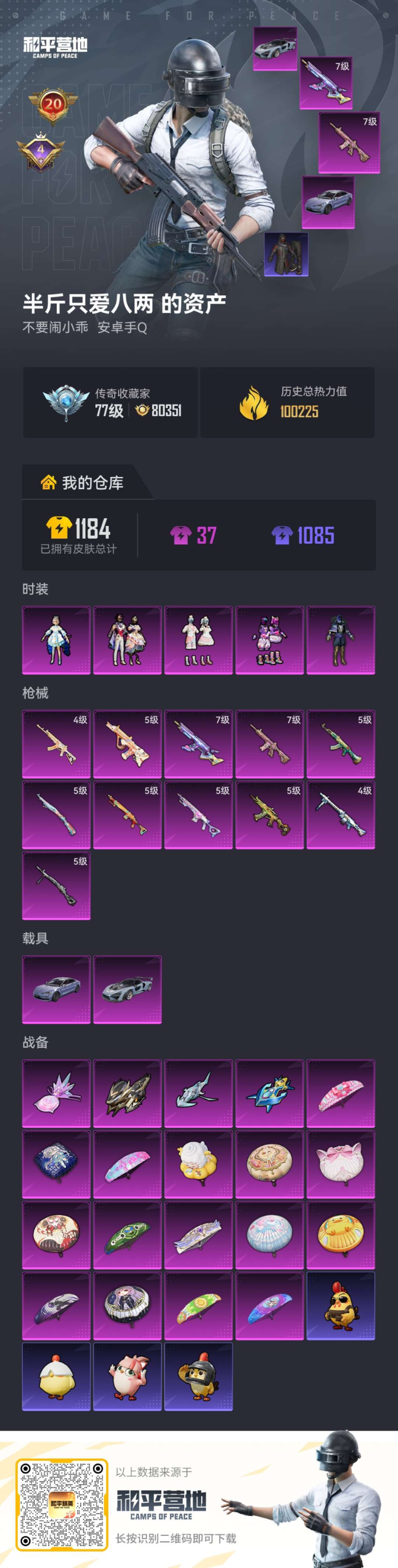 PX_2554579-2载具-237套装-324枪皮-4稀有2载具5粉装11特效枪20热门237套装324枪皮,热力值,20印记,历史卓越王牌12星,【4稀有】,奇异狩猎者,AWM-黄金龙骨,AKM-缤纷海域,浪漫天命,【2载具】,仰望U7先锋版(阿盖尔紫),迈凯伦塞纳(冷萃蓝),【5粉装】,蜜语绒猫,洛天依,星穹咏叹调,星之信仰,蓝莓炮弹,【11特效枪】,M416-心之恋语,(7级),AKS-74U-森灵之息,(5级),AKM-绿萝繁花,(5级),Kar98K-巳巳如意,(5级),M762-电糖天使,(7级),DP-28-豹影疾电,(5级),AUG-暖羊咩咩,(5级),Mk14-甜梦熊击,(5级),MG3-洛神天依,(4级),Mk14-福马献瑞,(5级),ACE32-萌骑漫游,(4级),【20热门】,Mark.06,龟仙人,鹰眼刺客,软萌银虎,金羽特工,暗影哥特,团圆交子,瑞龙福将,星河浪客,粉红小猪,漫步者,韶华初心,粉甜马卡龙,破蛋小黄鸡,黑色刀锋,极速红龙,M762-奇异狩猎者,M762-瑞龙福将,M24-奇异狩猎者,S686-奇异狩猎者,【2头盔】,幻影战神头盔,金羽特工头盔,【4背包】,梦幻火箭背包,幻影战神背包,深海曼妙背包,金羽特工背包,营地ID: