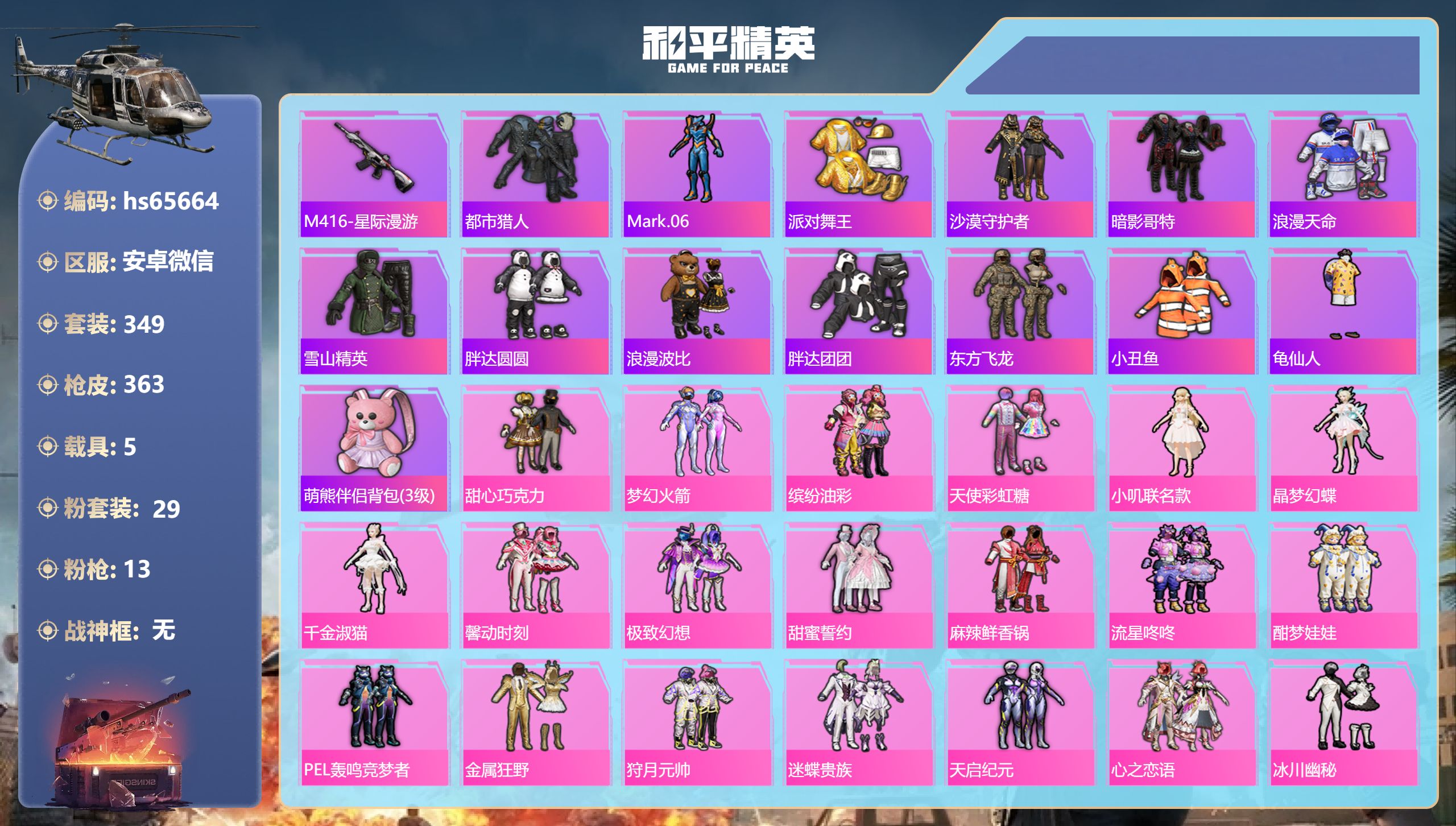 PX_2550081-,安卓微信-29王牌印记-29粉装-13特效枪-5载具-热力值-349套装-363枪皮-7卓越印记-6传奇印记 【29粉装】套装-蜜桃特工,套装-翡翠骑士,套装-心之恋语,套装-香水柠檬,套装-甜蜜誓约,套装-迷蝶贵族,套装-流星咚咚,角色-小叽联名款,套装-炙焰红王,套装-酣梦娃娃,套装-冰川幽秘,套装-馨动时刻,套装-苍蓝魅影,套装-麻辣鲜香锅,套装-天启纪元,套装-PEL轰鸣竞梦者,角色-晶梦幻蝶,套装-甜心巧克力,套装-锦绣火鲤,套装-梦幻火箭,套装-狩月元帅,角色-小蓝,角色-电磁星,套装-金属狂野,套装-山涧鹿灵,角色-千金淑猫,套装-天使彩虹糖,套装-极致幻想,套装-缤纷油彩 【13特效枪】Mk14-福马献瑞/5级,DP-28-豹影疾电/5级,SCAR-L-梦幻火箭/7级,GROZA-香水柠檬/7级,Mini14-荧光虫舞/7级,AKS-74U-森灵之息/5级,AKM-炫紫旋律/7级,M416-电玩时刻/5级,Kar98K-巳巳如意/5级,UMP45-萌骑冒险/3级,M416-心之恋语/7级,信号枪-金乌曜日/3级,SCAR-L-锦绣绵绵/5级 【15稀有紫装】M416-星际漫游,都市猎人,Mark.06,派对舞王,沙漠守护者,暗影哥特,浪漫天命,雪山精英,胖达圆圆,浪漫波比,胖达团团,东方飞龙,小丑鱼,龟仙人,萌熊伴侣背包(3级) 【4稀有载具】玛莎拉蒂Ghibli(粉),特斯拉Model,3(珍珠白),特斯拉Roadster(沁心粉),双人摩托-梦幻火箭 【350稀有时装】甜心巧克力,梦幻火箭,缤纷油彩,天使彩虹糖,小叽联名款,晶梦幻蝶,千金淑猫,馨动时刻,极致幻想,甜蜜誓约,麻辣鲜香锅,流星咚咚,酣梦娃娃,PEL轰鸣竞梦者,金属狂野,狩月元帅,迷蝶贵族,天启纪元,心之恋语,冰川幽秘,炙焰红王,锦绣火鲤,山涧鹿灵,苍蓝魅影,翡翠骑士,香水柠檬,蜜桃特工,小蓝,电磁星,太空漫步,迅捷龙虾,SS38特训,沙漠守护者,都市猎人,胖达团团,浪漫天命,龟仙人,Mark.06,雪山精英,暗影哥特,小丑鱼,东方飞龙,胖达圆圆,浪漫波比,派对舞王,好奇恐龙,奇趣企鹅,大橘为重,仓鼠灰灰,萌熊伴侣,潮萌小黄鸭,黄金大亨,萌趣咩咩,软萌银虎,海上生明月,狂徒小丑,晶灵使者,龙魂突击队,迎夏光舞,白糯汤圆,街头风暴,糖霜甜心,萌熊伴侣,4AM战队服,战术大师,紫俏灵猫,马上有钱,晶辉守护,香桃花海,萌主吾皇,向日葵先生,元素星魂,琴音绮想,画境星梦,狂鲨锋刃,阳光菠萝,粉黛兰香,云魄琉璃,萌鸡速递,书海巡游,雪国风尚,青翼流星,SS35特训,迷域探索者,机械英豪,机械征服者,SS29特训,SS5特训,SS31特训,冰原使者,SS33特训,SS32特训,SS16特训,星际旅行,SS36特训,贝斯之夜,舰行太空,焰鹰斗篷,云虎纪,拳皇97八神庵,蔷薇魔法师,云纹魔法士,黑色刀锋,爆裂葡萄,银河圣歌,闪耀星光,福星高照,暗夜契约,纯白誓言,虎虎生威吉莉,夏日音浪,清香五月粽,软嫩糖心蛋,深山诡影,潮流炫酷,SS8特训,众神之王,甜梦熊熊,智慧之神,白熊同盟,SS37特训,PEL躁动竞梦者,SS28特训,摇滚狂鲨,特训学院,海洋之心,猎鹰,青年教官,橘黑制服,红色运动,沁蓝冰爽,黄色运动,浓情蜜辣,蓝色运动,5.56爱好者,黄色伏地魔,白色伏地魔,热血青春,壁垒格斗者,SS9特训,白月香洋装,不夜海上花,森林猎手,酒红色名流,神秘舞者,阳光火鸡,湖蓝色名流,黄色名流,酷潮明星,顽皮玉兔,绯格组合,涂山之恋,SS26特训,薄荷蓝莓,酷萌兔限定,漫步者,空岛之星,热情海星,黑色伏地魔,黎明保卫者,炫蓝之夏,纯真浪花,SS34特训,骑行爱好者,S2赛事,竞技名士,深蓝色名流,灰色守护者,S4赛事,猛禽,SS30特训,长空猛禽,竞技勇士朋克,特战装甲,乘风破浪,战地菁英,旭日情侣,灰色格斗者,甜蜜告白,本愿之火,街头潮人,辉星之火,怒火燎原,冷焰舞者,惊鸿侠骨,魅力单车,灼焰舞者,雪山征服者,春光漫游,夜莺强袭者,野性战魂,丛林猎人,SS2特训,派对绅士,缤纷假日,传奇侦探,极地朋克,贵族骑装,幻世战舞者,战地督导,甜蜜菠萝,半糖蓝莓,街舞之王,街舞达人,粉甜马卡龙,午夜朋克,青涩时光,特种空勤,牛气满满,和平特警,玫瑰恋情,娇憨猪猪,风暴特警,童话森林,冰川特警,潮流先锋,雷霆特警,龙腾端午,燃烧卡路里,幻影公爵,滨海假日,极速红龙,狙击之神,WiFi精灵,红釉青花,麻辣教官,鹰眼刺客,雨过天青,福马献瑞,SS3特训,冰冻风暴,玲珑侠影,攀登者,完美偶像,SS11特训,人气偶像,SS4特训,幻影武者,梦魇先生,青春冒险家,破蛋小黄鸡,潮流游乐家,疯狂小兔子,青龙圣者,圣诞大吉,玄武圣者,快闪甜心,凛冬战士,白虎圣者,暗金炫舞,北国孤狼,蓝彩潮人,SS6特训,千禧之恋,神秘领域,炽焰拳师,绮丽涂鸦,格斗专家,耀眼新星,星光纪元,坚韧舞者,奇迹天团,竞技达人朋克,朋克治安官,淡雅花蕊,玲珑飞花,原初圣火,逆风勇士,海岛探路者,跃动心情,初火先锋,SS7特训,核芯基因,精神漫游,破晓战魂,霓虹街区,赛博空间,都市魅力,萌趣颜团子,轻风白浪,SS10特训,特种颜团子,沙漠兵团,闪金天王,镭射皇者,耀粉歌者,风华少年志,SS12特训,SS27特训,SS18特训,冰凉西瓜,治愈之星,银白舞王,科技之星,SS13特训,飞行日记,SS17特训,瑞龙福将,团圆交子,光影梦想家,机械哨兵,霓虹极客,SS19特训,光之冒险,SS20特训,SS21特训,玉兔迎春,弄潮海豚,梦起落英,SS23特训,呆萌铁蟹,冰爽海盐,浪漫樱花,甜蜜熊情侣,缤纷果语,滨海厨神,闪银刀客,耀动青春,青涩年华,SS14特训,星耀竞速,神气柴柴,奶油庭院,忍者信条,捷德奥特曼,幻羽潜行,海盐绵绵冰,老实芭蕉,冷血极客,吉莉礼服,旷野奇兵,王牌教练,暗夜之虎,微雨春柳,SS24特训,鹤鸣,暖风夏荷,懵萌河马,SS25特训,初雨海棠,快乐星愿,锦衣飞扬,金环蜂王,星梦畅游,万圣娃娃,惊声尖笑,黑夜传说,SS15特训,