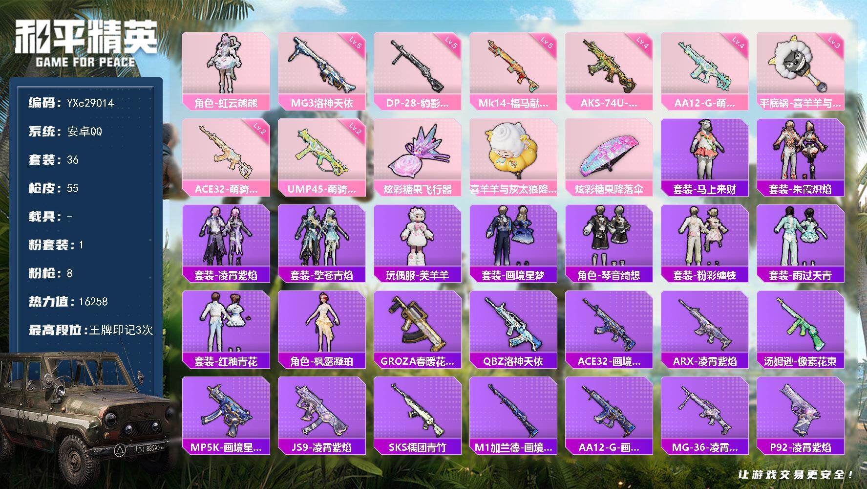 PX_2530061-,安卓手Q-5王牌印记-7粉装-10特效枪-45812热力值-116套装-182枪皮-4卓越印记 【7粉装】角色-辉云木星,套装-幻影战神,角色-洛天依,角色-羊梦糖心,套装-宝贝奶油派,套装-蜜语绒猫,角色-天穹 【10特效枪】UMP45-萌骑冒险/3级,AUG-暖羊咩咩/5级,破片手榴弹-招财进宝/3级,SPAS-12-蜜语绒猫/3级,蜜獾-异瞳寒姬/6级,Kar98K-巳巳如意/5级,AKS-74U-森灵之息/4级,DP-28-豹影疾电/5级,SCAR-L-梦幻火箭/4级,Mk14-福马献瑞/5级 【3稀有紫装】都市猎人,暗影哥特,浪漫天命 【113稀有时装】宝贝奶油派,洛天依,辉云木星,幻影战神,天穹,羊梦糖心,蜜语绒猫,都市猎人,浪漫天命,暗影哥特,自由猎手,异域银装,白糯汤圆,街头风暴,鱼渊荷华,大橘大利,燕燕于飞,NV战队服,战术大师,紫俏灵猫,马上有钱,猎影月神,巳巳如意,粉恋花,元素星魂,午间小调,琴音绮想,画境星梦,狂鲨锋刃,阳光菠萝,云魄琉璃,炫彩糖果,绯色魅影,萌鸡速递,荧光像素,小鸟芋圆,元气之梦,书海巡游,风迹短诗,蜜露汐语,漫游都市,薄荷星砂,顶瓜瓜,雪国风尚,蓝冰羽,恋语绒绒,青翼流星,紫幽梦,新风雅兰,SS35特训,SS31特训,SS33特训,SS32特训,SS36特训,军械专家,童真绒兔,潮流炫酷,SS37特训,萌趣绒叽,特训学院,猎鹰,青年教官,橘黑制服,红色运动,黄色运动,蓝色运动,顽皮橙,黄色伏地魔,白色伏地魔,帅气教官,酒红色名流,湖蓝色名流,黄色名流,漫步者,黑色伏地魔,SS34特训,竞技名士,深蓝色名流,猛禽,长空猛禽,旭日情侣,街头潮人,冷焰舞者,魅力单车,灼焰舞者,战地督导,幻影公爵,极速红龙,狙击之神,红釉青花,鹰眼刺客,雨过天青,福马献瑞,冰冻风暴,完美偶像,人气偶像,幻影武者,破蛋小黄鸡,摇滚舞王,蓝彩潮人,绮丽涂鸦,竞技达人朋克,海岛探路者,幻世保卫者,森林游猎者,都市魅力,耀粉歌者,深海梦境,夏日倾情,缤纷果语,滨海厨神,王牌教练,快乐星愿 【181稀有枪械】SCAR-L-梦幻火箭/4级,AUG-暖羊咩咩/5级,Kar98K-巳巳如意/5级,Mk14-福马献瑞/5级,UMP45-萌骑冒险/3级,SPAS-12-蜜语绒猫/3级,DP-28-豹影疾电/5级,蜜獾-异瞳寒姬/6级,AKS-74U-森灵之息/4级,破片手榴弹-招财进宝/3级,DBS-风迹短诗,莫辛纳甘-风迹短诗,Mini14-鸡智如我,AKM-绿洲时空,Win94-乌木金纹,MK12-风迹短诗,MK12-乌木金纹,AKS-74U-荧光像素,破片手榴弹-爆破雪人,PKM-紫幽梦,MG3-桃粉嫣然,MG3-霓彩脉冲,ACE32-画境星梦,M1加兰德-画境星梦,MP5K-画境星梦,M762-登顶巅峰,Mk14-紫幽梦,蜜獾-乌木金纹,S1897-紫幽梦,P92-紫幽梦,SPAS-12-狂鲨锋刃,M417-玩趣呆呆,MK20-H-狂鲨锋刃,AUG-冰晶雪宝,突击盾牌-绝对恒星,铝热弹-炫彩糖果,UZI-炫彩糖果,UMP45-绿洲时空,M416-萌萌史莱姆,M249-萌萌史莱姆,TMP-9-萌萌史莱姆,信号枪-奇迹舞步,AA12-G-画境星梦,G36C-星穹咏叹调,平底锅-画境星梦,M249-冰晶雪宝,Mk47-风迹短诗,平底锅-紫幽梦,破片手榴弹-海盐豹豹,UMP45-海盐豹豹,平底锅-宁雨蝶,AKS-74U-乌木金纹,AKM-涂鸦街区,蜜獾-风迹短诗,AMR-喜羊羊与灰太狼,Famas-乌木金纹,Famas-霓彩脉冲,破片手榴弹-拽到爆炸,十字弩-异瞳寒姬,S1897-糯团青竹,信号枪-异瞳寒姬,Mk14-薄荷星砂,AKS-74U-鸡智如我,TMP-9-雪月幻音,烟雾弹-冰氧夏日,AKS-74U-粉粉喵呜,Mk14-紫晶流影,MG-36-薄荷星砂,SCAR-L-绿洲时空,PKM-荧光像素,PKM-啾咪啾咪,S1897-荧海星豚,SVD-霓彩脉冲,SLR-霓彩脉冲,平底锅-属我最6,SCAR-L-彩虹符号,蜜獾-绿洲时空,蜜獾-鸡智如我,AUG-紫晶流影,S12K-霓彩脉冲,AMR-鸡智如我,AKM-霓彩脉冲,M416-红色方程式,M416-蓝色火焰,AKM-影袭,AKM-星之彼岸,AKM-江南烟雨,SCAR-L-夜灯,M16A4-红色方程式,GROZA-影袭,AUG-耀粉歌者,AUG-甜蜜菠萝,M762-甜心宝贝,G36C-古战神甲,Kar98K-影袭,M24-影袭,莫辛纳甘-蜜语绒猫,SKS-迅猛狂鲨,VSS-星之彼岸,Mini14-梦幻火箭,Mini14-金玉无双,Mini14-耀粉歌者,UZI-红色方程式,UZI-影袭,UZI-幻影战神,UZI-天降萌叽,UMP45-生命誓言,UMP45-夜灯,UMP45-炫光之旅,Vector-生命誓言,汤姆逊-耀粉歌者,汤姆逊-幻影战神,汤姆逊-环太平洋,P90-玩趣呆呆,S686-蜜语绒猫,S686-红色方程式,S686-生命誓言,S1897-炫彩节奏,S12K-破晓战魂,S12K-暖熊萌萌,S12K-夜灯,DBS-彩虹符号,M249-沙丘之主,DP-28-甜心宝贝,MG3-第五大道,PKM-蜜语绒猫,撬棍-甜心宝贝,撬棍-环太平洋,AWM-暮色玫影,Mk14-阳光菠萝,撬棍-冰晶雪宝,ARX-天马神君,DBS-绿洲时空,MG3-火熔核心,沙漠之鹰-羲和光序,JS9-蓝晶绮麟,ACE32-蓝晶绮麟,Famas-镜中幻,野牛-松绒汪汪,蜜獾-虎痴许褚,ACE32-冰晶雪宝,突击盾牌-虎痴许褚,AUG-异域银装,MK20-H-樱桃泡泡,MK20-H-净心行者,野牛-燕燕于飞,M200-乌木金纹,SPAS-12-燕燕于飞,蝎式手枪-燕燕于飞,十字弩-异域银装,大砍刀-鬼刀,S686-巳巳如意,SPAS-12-乌木金纹,爆炸猎弓-花中眠,Vector-燕燕于飞,十字弩-燕燕于飞,撬棍-脆鲨七海,M16A4-雨过天青,GROZA-福马献瑞,蜜獾-启元战纹,AMR-雨过天青,SLR-乌木金纹,AA12-G-雨过天青,PKM-雨过天青,Kar98K-自由猎手,沙漠之鹰-雨过天青,SVD-自由猎手,燃烧瓶-福马献瑞,MP5K-自由猎手,P90-紫矿核心,GROZA-紫矿核心,SCAR-L-小狗蛇点点,SPAS-12-福马献瑞,S12K-蓝晶绮麟,汤姆逊-像素花束,P90-巳巳如意,破片手榴弹-巳巳如意,ARX-天马神君,DBS-绿洲时空,MG3-火熔核心,MG-36-绿洲幽影 【9稀有飞行器】圣域金龙飞行器/1级,极意拳锋飞行器,狂鲨锋刃飞行器,鸡智如我飞行器,炫彩糖果飞行器,登顶巅峰飞行器,破刃行动尾迹,繁龙极客飞行器,异域银装飞行器 【29稀有背包】狂鲨锋刃背包(3级),画境星梦背包(3级),星穹咏叹调背包(3级),星渊背包(3级),炫彩糖果背包(3级),异瞳寒