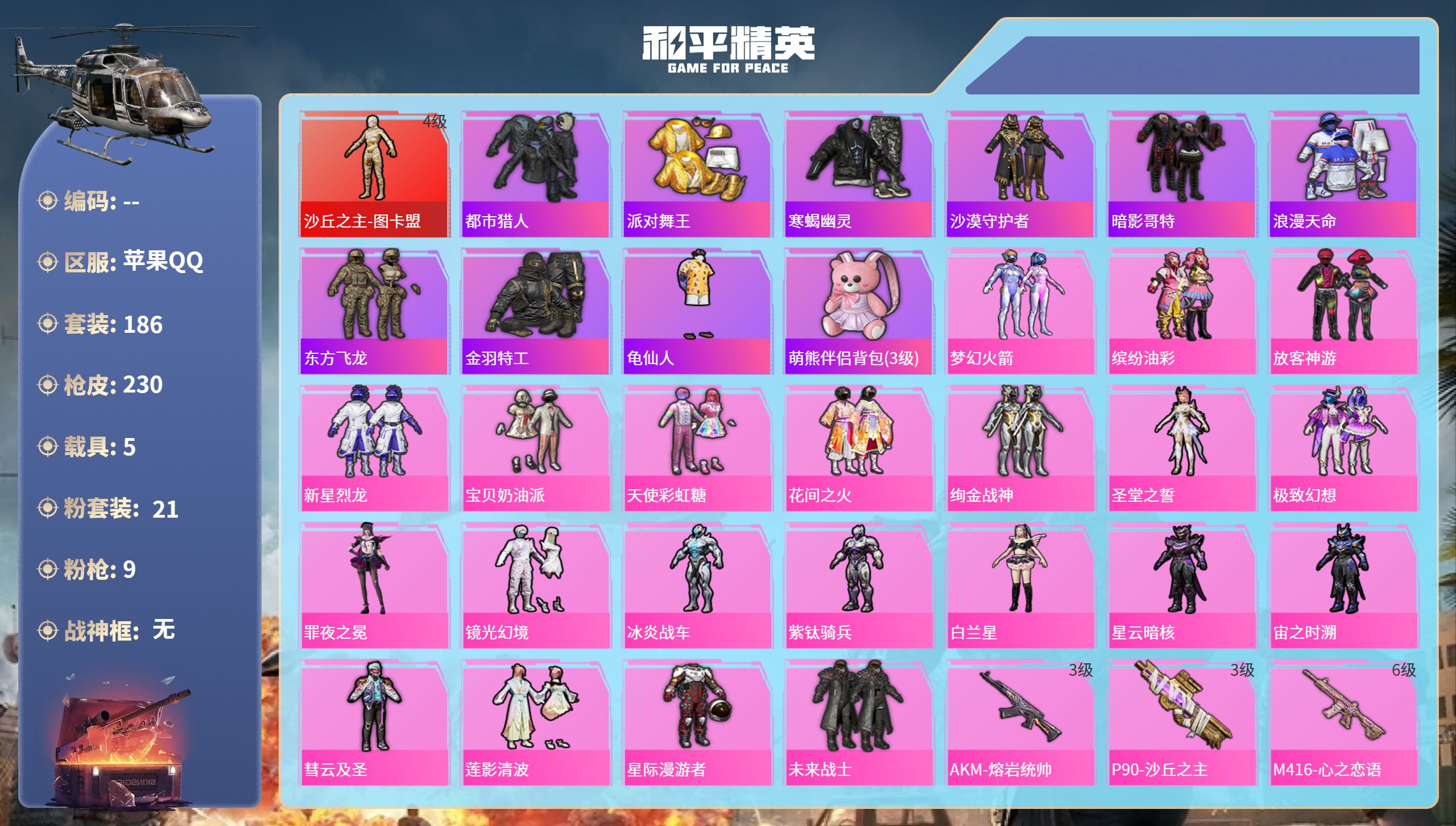 PX_2547484-可二次-苹果Q-2红装5稀有5载具31粉装20特效枪16热门171套装241枪皮,110703热力值,极品7位数皇冠Q,极品双红装公主衣柜素材号,300多天精英特权卡,璀璨场景-东方绮梦,萌兔起飞僚机,3款升级飞行器,狗砸精灵之光,M200梦海之灵,4级精灵之光露米娜,3级水母妮芮妲,觉醒紫螳螂,新火箭少女,巧克力三姐妹,猪妹,洛天依,千金淑猫,花仙子,第五大道,独舞天鹅,小舞玲珑,樱桃泡泡,小可学妹,咏叹调,莫吉托,女娲灵识,圣堂之誓,旋转彩虹,都市,金鞋,LED发光眼罩,红眼罩,胖达圆圆,小黄鸭,深海小丑鱼,鲨鱼服,天命,国宝头盔,粉熊背包,星空马,赞萌露比伙伴,灵珠宝驹伙伴,超萌熊本熊伙伴,满级M4心之恋语,满级AK甜心,满级斯嘎甜梦小狐,6印记,历史绝世王牌14星,【2红装】,精灵之光-露米娜,(4级),梦海之灵-妮芮妲,(3级),【5稀有】,AKM-缤纷海域,都市猎人,浪漫天命,派对舞王,派对舞王(金靴子),【5载具】,保时捷Panamera(星辰紫),时空跃影(星辉银),黑曜夜骑,星梦玉骢,萌兔起飞僚机,【31粉装】,觉醒初号机,圣堂之誓,梦幻火箭,蝶舞迷情,女娲灵识,茉莉星,宝贝奶油派,天使彩虹糖,甜心巧克力,小舞灵珑,千金淑猫,洛天依,金丰海韵,樱桃泡泡,星穹咏叹调,小可学妹,缤纷油彩,放客神游,仲夏莫吉托,青空秋雨,鸢尾晶梦,第五大道,新星烈龙,暗夜鎏金,炙焰红王,银红美神,馨动时刻,彩虹甜喵,旋转彩虹,独舞天鹅,【20特效枪】,M416-心之恋语,(7级),AKM-甜心宝贝,(7级),AKS-74U-森灵之息,(5级),Kar98K-巳巳如意,(5级),PKM-江南烟雨,(7级),M200-梦海之灵,(3级),Mk14-樱桃泡泡,(3级),GROZA-精灵之光,(3级),AKM-星际浪客,(1级),SCAR-L-桃夭倾城,(1级),SCAR-L-甜梦小狐,(7级),野牛-青空秋雨,(1级),DP-28-暗夜鎏金,(1级),M24-莲影清波,(3级),GROZA-旋转彩虹,(5级),MG3-洛神天依,(5级),Mk14-福马献瑞,(1级),ACE32-萌骑漫游,(3级),平底锅-仲夏莫吉托,(2级),烟雾弹-猫咪绅士,(4级),【16热门】,8号机,小丑鱼,龟仙人,雪山精英,潮萌小黄鸭,晶辉守护,呆萌铁蟹,鹰眼刺客,迅捷狂鲨,深海小丑鱼,胖达圆圆,暗影哥特,豚鼠丹丹,漫步者,风华少年志,弄潮海豚,【7飞行器】,梦幻火箭飞行器,幻海精灵飞行器,深渊漩涡飞行器,萌物绒绒飞行器,歌者泠鸢飞行器,星际浪客飞行器,冰川粉黛飞行器,【4头盔】,国宝胖达头盔,梦幻火箭头盔,甜心宝贝头盔,深海小丑鱼头盔,【4背包】,梦幻火箭背包,甜心宝贝背包,萌熊伴侣背包,深海小丑鱼背包,营地ID:938037590,