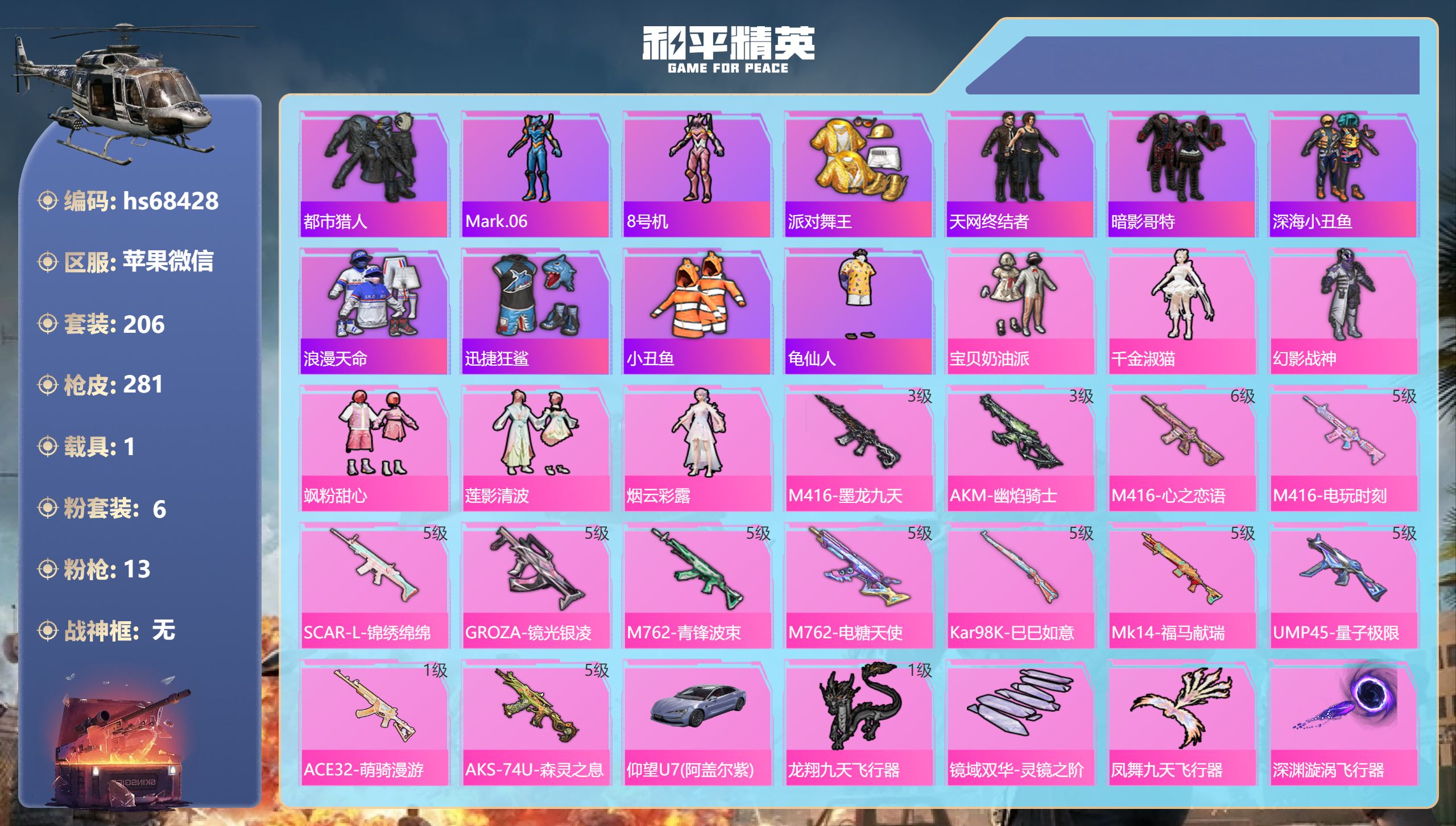 PX_2546055-【精品号手慢无】10粉装-10特效枪-0载具-3粉色飞行器-86962热力值-13王牌印记-189套装-270枪皮 【热门品类】:套装-浪漫天命,套装-都市猎人,套装-小丑鱼,套装-龟仙人,套装-暗影哥特 【粉色套装】:粉装-天使彩虹糖,粉装-骨龙祭渊,粉装-旋转彩虹,粉装-暗夜鎏金,粉装-飒粉甜心,角色-水仙星,角色-宙之时溯,角色-星云暗核,玩偶服-猪猪侠,角色-千金淑猫 【粉色枪皮等级】:SCAR-L-青春物语(五级),SCAR-L-锦绣绵绵(五级),M416-电玩时刻(五级),GROZA-焦糖拿铁(七级),M762-电糖天使(五级),UMP45-量子极限(五级),Kar98K-巳巳如意(五级),DP-28-豹影疾电(五级),PKM-江南烟雨(五级),MG-36-沧焰双生(五级)