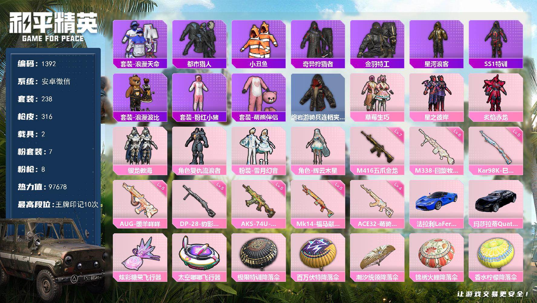 PX_2535533-,安卓微信-18王牌印记-1红装-9粉装-13特效枪-2载具-85012热力值-163套装-264枪皮-2卓越印记 【1红装】最终圣卫者-帕修斯/2级 【9粉装】角色-狂魇小丑,角色-千金淑猫,角色-罗征,角色-狂魅哈莉,角色-冷漠罗丽,套装-幻彩电音,角色-辉云木星,角色-异瞳寒姬,角色-洛天依 【13特效枪】SCAR-L-锦绣绵绵/5级,SPAS-12-音爆索尼克/7级,DP-28-鸢尾珑雾/3级,M416-电玩时刻/5级,UMP45-量子极限/5级,Vector-最终圣卫者/3级,ACE32-萌骑漫游/5级,Mk14-福马献瑞/5级,AKS-74U-森灵之息/5级,MG-36-沧焰双生/5级,Kar98K-巳巳如意/5级,M416-心之恋语/7级,DP-28-豹影疾电/5级 【5稀有紫装】冥河战士,Mark.06,8号机,迅捷狂鲨,龟仙人 【2稀有载具】虚妄之影(炫耀紫),最终圣卫者摩托车 【163稀有时装】帕修斯/2级,狂魅哈莉,洛天依,千金淑猫,辉云木星,狂魇小丑,幻彩电音,罗征,冷漠罗丽,异瞳寒姬,龟仙人,Mark.06,8号机,迅捷狂鲨,冥河战士,萌趣咩咩,龙魂突击队,暖阳柴柴,卖崽青蛙,小熊娃娃,异域银装,火种守卫者,狂花道·娜可露露,白糯汤圆,星途旅人,冰河战士,鱼渊荷华,俏兔智灵,青团波波,大橘大利,燕燕于飞,碧青流霞,战术大师,智谋强哥,紫俏灵猫,雏菊兔兔,糖糖葫芦,香桃花海,蝶变,瑰梦爱神,巳巳如意,粉日山川,湖畔霞光,曼妙人鱼,极地流光,午间小调,彩虹兔,时希公主,琴音绮想,乐音,灵公主,霓虹热舞,雪绒豹,画境星梦,星影赞美诗,朱霞炽焰,狂鲨锋刃,懒羊羊,凌霄紫焰,粉黛兰香,擎苍青焰,炫彩糖果,绯色魅影,萌鸡速递,书海巡游,风迹短诗,圣穹绘梦,甜心蒙太奇,诡诞巡游,混沌火种,蜜露汐语,薄荷星砂,秘语星愿,超感刻度,云朵鹅,顶瓜瓜,兰香蝶语,雪国风尚,蓝冰羽,恋语绒绒,紫幽梦,马上来财,SS35特训,SS29特训,萝兰蝴蝶,SS31特训,SS33特训,SS32特训,SS36特训,焰鹰斗篷,童真绒兔,龙的传人,青玉碎影,萌黄之夏,SS37特训,SS28特训,阳光火鸡,绯格组合,涂山之恋,SS26特训,酷萌兔限定,空岛之星,热情海星,纯真浪花,SS34特训,竞技名士,SS30特训,长空猛禽,特战装甲,甜蜜告白,惊鸿侠骨,魅力单车,春光漫游,甜心亚梦,虚音幻奏,幻世战舞者,青涩时光,牛气满满,娇憨猪猪,春日漫步,狙击之神,红釉青花,麻辣教官,雨过天青,沙暴袭击者,福马献瑞,完美偶像,破蛋小黄鸡,快闪甜心,坚韧舞者,野性战心,海岛探路者,破晓战魂,和煦暖阳,霓虹街区,田园牧歌,轻风白浪,耀粉歌者,探宝勇士,SS27特训,飞行日记,光之冒险,SS20特训,SS21特训,玉兔迎春,深海梦境,SS22特训,SS23特训,滨海厨神,神气柴柴,妙红点点,幻彩翩翩,幻羽潜行,海盐绵绵冰,老实芭蕉,王牌教练,荣耀,柠萌假日,SS24特训,鹤鸣,懵萌河马,SS25特训,锦衣飞扬 【264稀有枪械】Vector-最终圣卫者/3级,M416-心之恋语/7级,M416-电玩时刻/5级,SCAR-L-锦绣绵绵/5级,Kar98K-巳巳如意/5级,Mk14-福马献瑞/5级,UMP45-量子极限/5级,SPAS-12-音爆索尼克/7级,DP-28-豹影疾电/5级,ACE32-萌骑漫游/5级,MG-36-沧焰双生/5级,AKS-74U-森灵之息/5级,QBZ-纯真浪花,AWM-纯真浪花,汤姆逊-纯真浪花,DBS-乌木金纹,AA12-G-纯真浪花,平底锅-纯真浪花,撬棍-朗基努斯之枪,烟雾弹-鸢尾晶梦,突击盾牌-初号机,觉醒Ver.,蜜獾-精灵梦叶罗丽,SCAR-L-海盐豹豹,GROZA-海盐豹豹,野牛-雏菊兔兔,蝎式手枪-金丰海韵,DBS-游龙飞鱼,Mk14-冰河战士,平底锅-雏菊兔兔,M762-雏菊兔兔,Mini14-雏菊兔兔,Famas-突变脉冲,R1895-雏菊兔兔,Mk47-极冰使者,UZI-冰河战士,M16A4-冰河战士,MK20-H-乌木金纹,DBS-风迹短诗,莫辛纳甘-风迹短诗,Win94-乌木金纹,MK12-风迹短诗,MK12-乌木金纹,SVD-冷漠罗丽,撬棍-冷漠罗丽,破片手榴弹-爆破雪人,S12K-极意拳锋,G36C-桃粉嫣然,AKM-灵猫魔法师,PKM-紫幽梦,MG3-霓彩脉冲,DBS-幻彩电音,R45-幻彩电音,ACE32-画境星梦,SCAR-L-冷漠罗丽,M1加兰德-画境星梦,MP5K-画境星梦,Mk14-紫幽梦,蜜獾-乌木金纹,M762-云朵鹅,S1897-紫幽梦,SVD-云朵鹅,P92-紫幽梦,SPAS-12-狂鲨锋刃,MK20-H-狂鲨锋刃,AUG-冰晶雪宝,铝热弹-炫彩糖果,UZI-炫彩糖果,大砍刀-像素花束,AA12-G-画境星梦,平底锅-画境星梦,M249-冰晶雪宝,Mk47-风迹短诗,JS9-凌霄紫焰,MG-36-凌霄紫焰,平底锅-紫幽梦,破片手榴弹-海盐豹豹,AC-VAL-霁蓝缠春,ARX-凌霄紫焰,AKS-74U-乌木金纹,电击枪-喜羊羊与灰太狼,蜜獾-风迹短诗,爆炸猎弓-喜羊羊与灰太狼,P92-凌霄紫焰,AMR-喜羊羊与灰太狼,Famas-乌木金纹,Famas-霓彩脉冲,SPAS-12-云朵鹅,M249-无面战甲,破片手榴弹-拽到爆炸,十字弩-异瞳寒姬,S1897-糯团青竹,信号枪-异瞳寒姬,平底锅-凌霄紫焰,汤姆逊-智耀战神,S12K-智耀战神,沙漠之鹰-云朵鹅,烟雾弹-冰氧夏日,MG3-智耀战神,MG-36-薄荷星砂,大砍刀-云朵鹅,SLR-圣穹绘梦,UMP45-圣穹绘梦,沙漠之鹰-圣穹绘梦,M200-爆裂游戏,撬棍-双重狂想,SLR-霓彩脉冲,M16A4-最终圣卫者,S12K-霓彩脉冲,Kar98k-最终圣卫者,野牛-最终圣卫者,AKM-霓彩脉冲,M416-红色方程式,M416-蓝色火焰,M416-糯团青竹,AKM-破晓战魂,AKM-龙的传人,SCAR-L-红色方程式,SCAR-L-玉兔迎春,SCAR-L-黄金龙骨,M16A4-冥河战士,M16A4-幻世战舞者,M16A4-甜心亚梦,GROZA-田园牧歌,GROZA-懵萌河马,AUG-耀粉歌者,AUG-天降萌叽,M762-彩虹符号,M762-天降萌叽,Mk47-乌木金纹,Mk47-妙红点点,Mk47-洛神天依,G36C-懵萌河马,AC-VAL-闲梦青缨,AC-VAL-快闪甜心,AC-VAL-甜心亚梦,AC-VAL-乌木金纹,蜜獾-天降萌叽,蜜獾-娇憨猪猪,Kar98K-王子的夏天,Kar98K-红色方程式,M24-乌木金纹,M24-妙趣可丽,M24-炫彩节奏,AWM-焰鹰斗篷,Win94-玉鳞金羽,莫辛纳甘-乌木金纹,莫辛纳甘-懵萌河马,AMR-乌木金纹,AMR-妙红点点,M200-惊鸿侠骨,SKS-糯团青