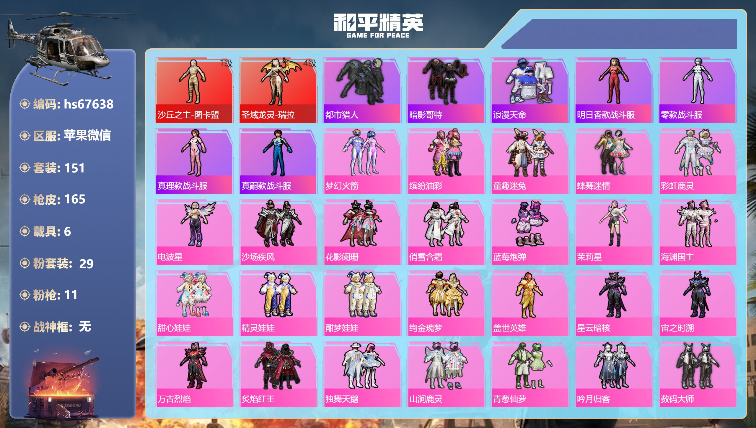 PX_2541524-,苹果微信-2王牌印记-2红装-29粉装-11特效枪-6载具-88166热力值-151套装-165枪皮 【2红装】圣域龙灵-瑞拉/4级,沙丘之主-图卡盟/1级 【29粉装】套装-星之彼岸,套装-独舞天鹅,套装-山涧鹿灵,套装-酣梦娃娃,套装-青葱仙萝,套装-绚金瑰梦,角色-万古烈焰,套装-盖世英雄,角色-电磁星,角色-电波星,角色-宙之时溯,套装-精灵娃娃,角色-超弦星,套装-数码大师,套装-童趣迷兔,套装-彩虹鹿灵,套装-蝶舞迷情,角色-茉莉星,套装-缤纷油彩,套装-俏雪含霜,套装-吟月归客,套装-炙焰红王,套装-沙场疾风,套装-花影阑珊,套装-甜心娃娃,套装-梦幻火箭,套装-海渊国主,角色-星云暗核,套装-蓝莓炮弹 【11特效枪】SCAR-L-万古烈焰/1级,Kar98K-圣域龙灵/1级,UMP45-雪国精灵/5级,P90-沙丘之主/7级,Kar98K-巳巳如意/4级,M249-蓝莓炮弹/5级,SCAR-L-金蛇镇世/7级,M416-风花雪月/2级,M416-心之恋语/5级,AKM-梦之光华/4级,S12K-海渊国主/2级 【7稀有紫装】都市猎人,暗影哥特,浪漫天命,明日香款战斗服,零款战斗服,真理款战斗服,真嗣款战斗服 【6稀有载具】玛莎拉蒂Ghibli(粉),特斯拉Roadster(沁心粉),兰博基尼URUS(明艳黄),路特斯EVIJA(星际黄),仰望U9(赤霞丹朱),护世瑞兽 【1僚机】僚机-圣域龙宝 【151稀有时装】图卡盟/1级,瑞拉/4级,梦幻火箭,缤纷油彩,童趣迷兔,蝶舞迷情,彩虹鹿灵,电波星,沙场疾风,花影阑珊,俏雪含霜,蓝莓炮弹,茉莉星,海渊国主,甜心娃娃,精灵娃娃,酣梦娃娃,绚金瑰梦,盖世英雄,星云暗核,宙之时溯,万古烈焰,炙焰红王,独舞天鹅,山涧鹿灵,青葱仙萝,吟月归客,数码大师,星之彼岸,超弦星,电磁星,都市猎人,浪漫天命,暗影哥特,零款战斗服,明日香款战斗服,爱崽白熊,激萌罗小黑,大橘为重,狂沙舞者,龙宫之主,软软马卡龙,神秘黑猫,软萌银虎,海上生明月,花面小丑,石蕴玉辉,鱼渊荷华,大橘大利,燕燕于飞,NV战队服,TianBa战队服,真理款战斗服,真嗣款战斗服,薰款战斗服,雪绒豹,顶瓜瓜,绒绒粉兔,蓝冰羽,恋语绒绒,紫幽梦,新风雅兰,SS31特训,SS33特训,SS32特训,华灯初上,明鸳圣池,贝斯之夜,醒狮腾龙,决胜时刻,冰爽风暴,爆裂葡萄,福星高照,海龙战士,虎虎生威吉莉,夏日音浪,龙的传人,潮酷猛小鳄,潮流炫酷,白熊同盟,绿翡凌光,月蓝流光,热血青春,冰川格斗者,绯格组合,SS26特训,漫步者,空岛之星,黎明保卫者,SS34特训,竞技名士,猛禽,长空猛禽,特战装甲,灰色格斗者,六六大吉,怒火燎原,冷焰舞者,魅力单车,春光漫游,夜莺强袭者,野性战魂,传奇侦探,幻世战舞者,青涩时光,特种空勤,牛气满满,童话森林,滨海假日,WiFi精灵,沙漠毒蛇,鹰眼刺客,SS3特训,冰冻风暴,攀登者,SS4特训,梦魇先生,热血骑手,青春冒险家,疯狂小兔子,圣诞大吉,快闪甜心,北国孤狼,千禧之恋,神秘领域,坚韧舞者,奇迹天团,淡雅花蕊,玲珑飞花,霓虹街区,都市魅力,牛气冲天,SS18特训,SS17特训,瑞龙福将,团圆交子,遗落祭司,光影梦想家,霓虹极客,空投萌叽,玉兔迎春,弄潮海豚,甜蜜熊情侣,缤纷果语,电音精灵,格斗先锋,冷血极客,刚毅裁决者,快乐星愿,万圣娃娃,黑夜传说 【165稀有枪械】SCAR-L-金蛇镇世/7级,SCAR-L-万古烈焰/1级,P90-沙丘之主/7级,Kar98K-圣域龙灵/1级,M416-心之恋语/5级,M416-风花雪月/2级,AKM-梦之光华/4级,Kar98K-巳巳如意/4级,UMP45-雪国精灵/5级,S12K-海渊国主/2级,M249-蓝莓炮弹/5级,AMR-墨龙九天,MK20-H-圣域龙灵,短管霰弹-圣域龙灵,S1897-绒绒粉兔,P18C-绒绒粉兔,PKM-紫幽梦,Mk14-紫幽梦,蜜獾-乌木金纹,M762-云朵鹅,S1897-紫幽梦,SVD-云朵鹅,P92-紫幽梦,Mk14-绒绒粉兔,平底锅-紫幽梦,燃烧瓶-甜梦桃焰,Famas-乌木金纹,SPAS-12-云朵鹅,S1897-糯团青竹,沙漠之鹰-云朵鹅,爆炸猎弓-圣斗士星矢,AC-VAL-六号稻草人,M200-六号稻草人,SKS-圣域龙灵,M416-红色方程式,M416-神秘黑猫,M416-乌木金纹,M416-蓝色火焰,M416-糯团青竹,M416-绯红前夜,AKM-影袭,AKM-百万伏特,AKM-星之彼岸,AKM-彩虹符号,AKM-海渊国主,AKM-春暖花开,SCAR-L-龙宫之主,SCAR-L-生命誓言,M16A4-红色方程式,GROZA-春暖花开,GROZA-异彩先驱,GROZA-蓝莓炮弹,GROZA-影袭,GROZA-南瓜骑士,AUG-耀粉歌者,QBZ-神秘黑猫,QBZ-诡娃娃,QBZ-彩虹符号,M762-瑞龙福将,M762-诡娃娃,M762-风花雪月,Mk47-百万伏特,Mk47-乌木金纹,G36C-乌木金纹,G36C-暗夜玫瑰,G36C-雪国精灵,AC-VAL-天降萌叽,AC-VAL-快闪甜心,Kar98K-梦幻火箭,Kar98K-蓝莓炮弹,Kar98K-王子的夏天,Kar98K-蜘蛛突变者,Kar98K-影袭,M24-影袭,M24-未来战士,Win94-瑞龙福将,AMR-乌木金纹,M200-酷泡奶龙,SKS-夜灯,SKS-诡娃娃,VSS-未来战士,VSS-星之彼岸,Mini14-梦幻火箭,Mini14-甜心娃娃,Mini14-龙宫之主,Mini14-乌木金纹,Mini14-异彩先驱,Mini14-海渊国主,Mini14-春暖花开,Mk14-绚金瑰梦,MK20-H-快闪甜心,UZI-生命誓言,UZI-炫彩节奏,UZI-乌木金纹,UZI-影袭,UZI-啾咪啾咪,UMP45-生命誓言,UMP45-春暖花开,UMP45-海渊国主,UMP45-诡娃娃,Vector-暗夜玫瑰,Vector-生命誓言,Vector-金玉无双,汤姆逊-耀粉歌者,汤姆逊-异彩先驱,汤姆逊-炫彩节奏,野牛-乌木金纹,野牛-沙丘之主,MP5K-异彩先驱,MP5K-蓝莓炮弹,MP5K-乌木金纹,P90-乌木金纹,P90-快闪甜心,S686-彩虹符号,S686-生命誓言,S1897-神秘黑猫,S1897-春暖花开,S1897-百万伏特,S12K-玩趣呆呆,S12K-幻世战舞者,S12K-幻影战神,S12K-瑞龙福将,S12K-龙宫之主,S12K-童趣迷兔,M249-彩虹符号,M249-百万伏特,M249-沙丘之主,M249-星之彼岸,DP-28-未来战士,DP-28-彩虹符号,MG3-瑞龙福将,P92-雷霆特警,P18C-百万伏特,沙漠之鹰-快闪甜心,大砍刀-万古烈焰,平底锅-空岛之星,平底锅-梦之光华,平底锅-绿意幻