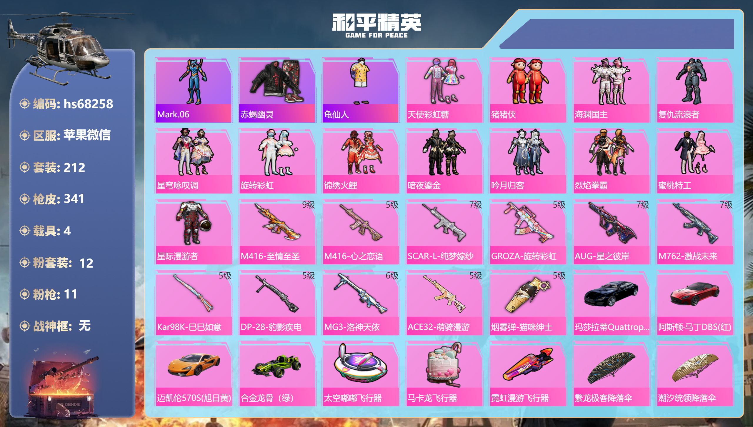 PX_2543209-,苹果微信-22王牌印记-12粉装-11特效枪-4载具-热力值-212套装-341枪皮-6卓越印记-3传奇印记 【12粉装】套装-锦绣火鲤,套装-海渊国主,套装-烈焰拳霸,套装-星穹咏叹调,套装-吟月归客,玩偶服-猪猪侠,套装-暗夜鎏金,套装-天使彩虹糖,角色-复仇流浪者,套装-星际漫游者,套装-蜜桃特工,套装-旋转彩虹 【11特效枪】DP-28-豹影疾电/5级,AUG-星之彼岸/7级,Kar98K-巳巳如意/5级,MG3-洛神天依/6级,GROZA-旋转彩虹/5级,M416-至情至圣/9级,M762-激战未来/7级,ACE32-萌骑漫游/5级,M416-心之恋语/5级,烟雾弹-猫咪绅士/5级,SCAR-L-纯梦嫁纱/7级 【3稀有紫装】Mark.06,赤蝎幽灵,龟仙人 【4稀有载具】玛莎拉蒂Quattroporte(夜幕蓝),阿斯顿·马丁DBS(红),迈凯伦570S(旭日黄),合金龙骨(绿) 【212稀有时装】天使彩虹糖,猪猪侠,海渊国主,复仇流浪者,星穹咏叹调,旋转彩虹,锦绣火鲤,暗夜鎏金,吟月归客,烈焰拳霸,蜜桃特工,星际漫游者,太空漫步,龟仙人,Mark.06,赤蝎幽灵,狂沙舞者,Alan,Walker,萌趣咩咩,龙魂突击队,火种守卫者,星途旅人,冰河战士,鱼渊荷华,青团波波,燕燕于飞,海琴烟,战术大师,糖糖葫芦,香桃花海,蝶变,巳巳如意,粉日山川,曼妙人鱼,棉花软糖,彩虹兔,雪绒豹,星影赞美诗,美羊羊,萌鸡速递,云朵鹅,蓝冰羽,SS35特训,机械英豪,机械征服者,SS29特训,SS31特训,SS33特训,SS32特训,SS16特训,暴风机械师,时空追击者,贝斯之夜,焰鹰斗篷,暗夜傀儡,英勇保护者,军械专家,醒狮腾龙,冰爽风暴,新侠客行,炫光向阳,福星高照,纯白誓言,幻世猎手,虎虎生威吉莉,夏日音浪,龙的传人,军刀雅典娜,众神之王,甜梦熊熊,智慧之神,白熊同盟,青玉碎影,萌黄之夏,SS37特训,PEL躁动竞梦者,SS28特训,海洋之心,猎鹰,青年教官,飞驰魅影,音速流光,热血青春,SS9特训,酷潮明星,绯格组合,涂山之恋,SS26特训,空岛之星,热情海星,黎明保卫者,炫蓝之夏,纯真浪花,SS34特训,竞技名士,覆海蛟龙,雨林探路者,荷鲁斯之眼,SS30特训,长空猛禽,特战装甲,西部风情,战地菁英,山经魅狐,本愿之火,街头潮人,怒火燎原,惊鸿侠骨,春光漫游,猎梦纪元,甜心亚梦,虚音幻奏,幻世战舞者,特殊使命,青涩时光,暖心熊熊,牛气满满,娇憨猪猪,春日漫步,龙腾端午,夏雨游龙,滨海假日,荷畔雨呱,狙击之神,麻辣教官,SS11特训,幽夜迷踪,幻影武者,俏皮奶喵,青春冒险家,破蛋小黄鸡,潮流游乐家,青龙圣者,玄武圣者,快闪甜心,梦幻奶油,酸甜橘柚,千禧之恋,神秘领域,绮丽涂鸦,耀眼新星,朋克治安官,野性战心,原初圣火,逆风勇士,海岛探路者,霓虹街区,田园牧歌,萌趣颜团子,轻风白浪,SS10特训,风行保卫者,特种颜团子,镭射皇者,耀粉歌者,探宝勇士,SS12特训,SS27特训,牛气冲天,迅捷之星,SS18特训,治愈之星,银白舞王,科技之星,SS13特训,碧波幻想,飞行日记,SS17特训,瑞龙福将,团圆交子,缤纷焰火,异彩先驱,霓虹极客,空投萌叽,金戈铁马,SS19特训,光之冒险,SS20特训,SS21特训,玉兔迎春,SS22特训,SS23特训,呆萌铁蟹,浪漫樱花,飞狐塔尔斯,甜蜜熊情侣,缤纷果语,SS14特训,天籁歌者,电音精灵,白兰地假日,星耀竞速,神气柴柴,灵蜜圈圈,妙红点点,幻彩翩翩,格斗先锋,幻羽潜行,海盐绵绵冰,老实芭蕉,吉莉礼服,王牌教练,荣耀,柠萌假日,SS24特训,鹤鸣,懵萌河马,SS25特训,锦衣飞扬,星梦畅游,万圣娃娃,SS15特训 【341稀有枪械】M416-至情至圣/9级,M416-心之恋语/5级,SCAR-L-纯梦嫁纱/7级,GROZA-旋转彩虹/5级,AUG-星之彼岸/7级,M762-激战未来/7级,Kar98K-巳巳如意/5级,DP-28-豹影疾电/5级,MG3-洛神天依/6级,ACE32-萌骑漫游/5级,烟雾弹-猫咪绅士/5级,QBZ-纯真浪花,AWM-纯真浪花,汤姆逊-纯真浪花,DBS-乌木金纹,AA12-G-纯真浪花,平底锅-纯真浪花,P1911-创世·救赎,蜜獾-精灵梦叶罗丽,S1897-精灵梦叶罗丽,SCAR-L-海盐豹豹,平底锅-精灵梦叶罗丽,GROZA-海盐豹豹,Mk14-冰河战士,UZI-冰河战士,M16A4-冰河战士,MK20-H-乌木金纹,Win94-乌木金纹,撬棍-冷漠罗丽,PKM-紫幽梦,QBZ-魔药课室,M762-云朵鹅,SVD-云朵鹅,SPAS-12-狂鲨锋刃,MK20-H-狂鲨锋刃,铝热弹-炫彩糖果,Mini14-绯穹魔姬,蜜獾-折梦之诗,SKS-折梦之诗,MG3-折梦之诗,AKS-74U-乌木金纹,SKS-棋盘冕主,Famas-乌木金纹,Famas-霓彩脉冲,SPAS-12-云朵鹅,破片手榴弹-拽到爆炸,信号枪-异瞳寒姬,AKS-74U-鸡智如我,沙漠之鹰-云朵鹅,烟雾弹-冰氧夏日,大砍刀-云朵鹅,S1897-荧海星豚,DBS-荧海星豚,平底锅-属我最6,AKM-霓彩脉冲,M416-潮汐统领,M416-乌木金纹,M416-夜灯,M416-糯团青竹,M416-暗夜行者,M416-彩虹嘻嘻猴,AKM-环太平洋,AKM-胡桃卫兵,AKM-星兔领航员,AKM-墨染幽兰,AKM-夜灯,AKM-四圣焕新,AKM-PEL轰鸣竞梦者,AKM-彩虹符号,AKM-缤纷海域,AKM-破晓战魂,AKM-龙的传人,AKM-灼热熔岩,AKM-虎虎生威,AKM-萌趣颜团子,AKM-霓虹街区,SCAR-L-玉兔迎春,SCAR-L-乌木金纹,SCAR-L-龙宫之主,SCAR-L-青丘仙客,SCAR-L-黄金龙骨,SCAR-L-炫彩节奏,M16A4-机械英豪,M16A4-幻世战舞者,M16A4-甜心亚梦,M16A4-乌木金纹,GROZA-春暖花开,GROZA-异彩先驱,GROZA-恐龙拽拽,GROZA-田园牧歌,GROZA-懵萌河马,GROZA-彩虹符号,GROZA-马卡龙,GROZA-治愈之星,AUG-乌木金纹,AUG-耀粉歌者,AUG-怪笑疯兔,AUG-灵符少年,AUG-青春冒险家,AUG-海螺星光,AUG-天降萌叽,QBZ-神秘黑猫,QBZ-飞驰魅影,QBZ-洛神天依,QBZ-原初圣火,QBZ-乌木金纹,QBZ-未来歌姬,QBZ-彩虹符号,M762-瑞龙福将,M762-镭射皇者,M762-乌木金纹,M762-绯红前夜,M762-牛气冲天,M762-甜心宝贝,M762-第五大道,M762-天降萌叽,Mk47-百万伏特,Mk47-乌木金纹,Mk47-妙红点点,Mk47-洛神天依,Mk47-青春冒险家,G36C-乌木金纹,G36C-暗夜玫瑰,G36C
