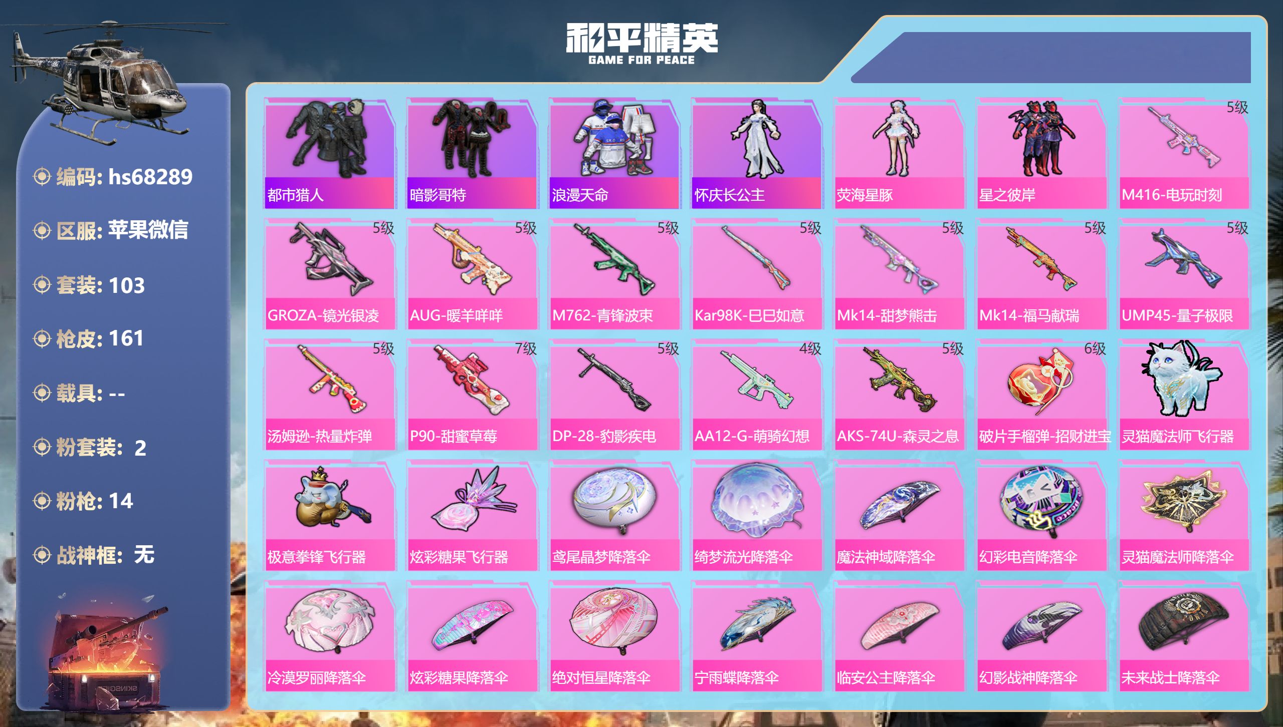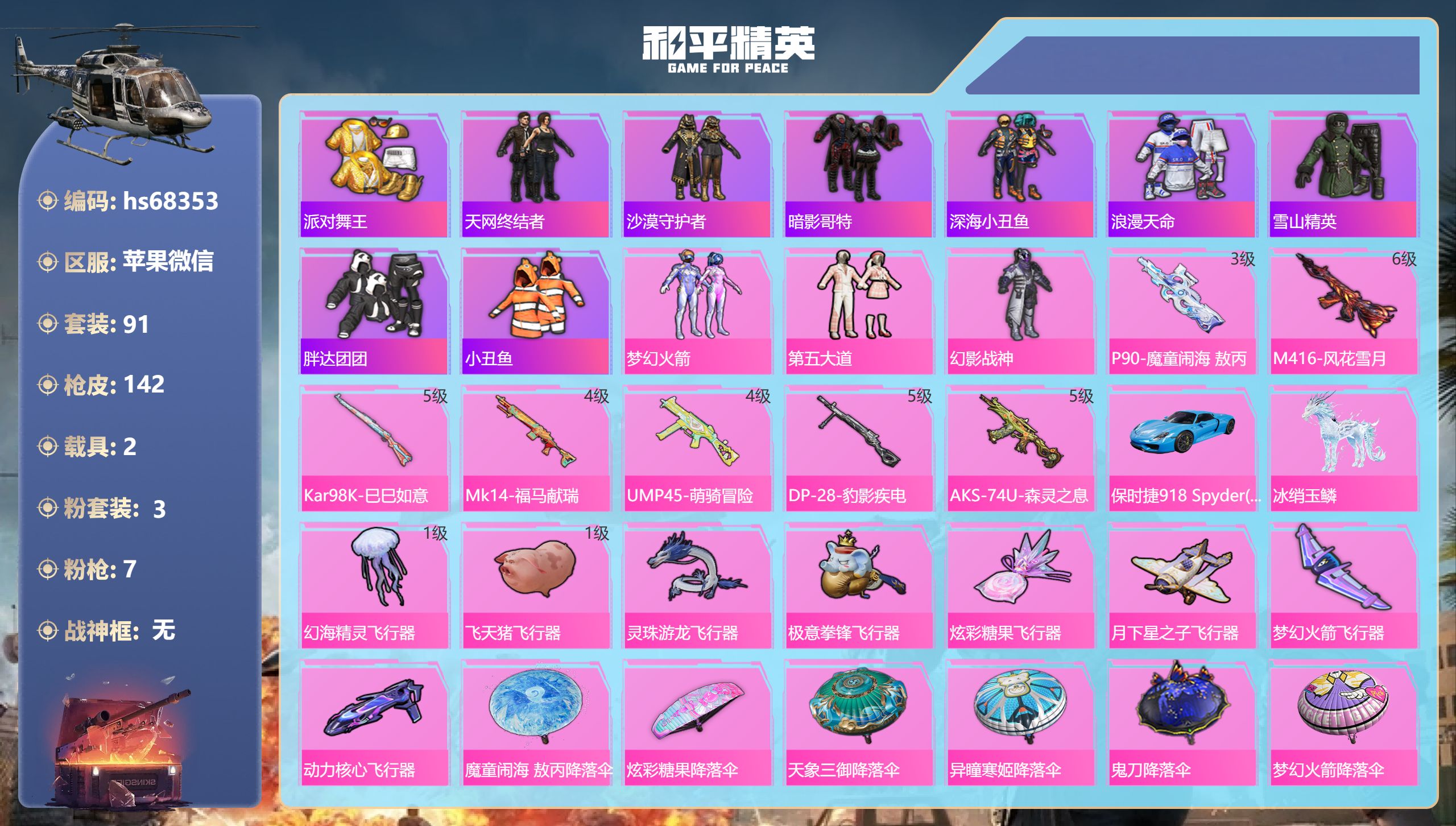 PX_2543228-,苹果微信-6王牌印记-3粉装-7特效枪-2载具-42265热力值-91套装-142枪皮-3卓越印记-1传奇印记 【3粉装】套装-第五大道,套装-幻影战神,套装-梦幻火箭 【7特效枪】Mk14-福马献瑞/4级,P90-魔童闹海,敖丙/3级,AKS-74U-森灵之息/5级,UMP45-萌骑冒险/4级,M416-风花雪月/6级,Kar98K-巳巳如意/5级,DP-28-豹影疾电/5级 【9稀有紫装】派对舞王,天网终结者,沙漠守护者,暗影哥特,深海小丑鱼,浪漫天命,雪山精英,胖达团团,小丑鱼 【2稀有载具】保时捷918,Spyder(沉静蓝),冰绡玉鳞 【91稀有时装】梦幻火箭,第五大道,幻影战神,迅捷龙虾,沙漠守护者,胖达团团,浪漫天命,雪山精英,暗影哥特,深海小丑鱼,小丑鱼,派对舞王,天网终结者,西部牛仔,激萌罗小黑,狂战萌兔,花面小丑,糖霜甜心,鱼渊荷华,TT战队服,大橘大利,燕燕于飞,海琴烟,风玲,战术大师,智谋强哥,紫俏灵猫,马上有钱,巳巳如意,元素星魂,午间小调,琴音绮想,霓虹热舞,画境星梦,朱霞炽焰,狂鲨锋刃,凌霄紫焰,擎苍青焰,炫彩糖果,绯色魅影,萌鸡速递,元气之梦,书海巡游,风迹短诗,秘语星愿,雪国风尚,蓝冰羽,恋语绒绒,紫幽梦,SS35特训,SS31特训,SS33特训,SS32特训,SS36特训,军械专家,军刀雅典娜,SS37特训,SS28特训,蓝色运动,白色伏地魔,湖蓝色名流,边境牛仔,绯格组合,漫步者,黑色伏地魔,SS34特训,雪鹰学院,竞技名士,长空猛禽,甜蜜告白,魅力单车,水银刺客,青涩时光,风暴特警,幻影公爵,狙击之神,红釉青花,鹰眼刺客,雨过天青,福马献瑞,冰冻风暴,破蛋小黄鸡,疯狂小兔子,精神漫游,都市魅力,弄潮海豚,呆萌铁蟹,夏日倾情,缤纷果语,青涩年华,吉莉礼服 【142稀有枪械】P90-魔童闹海,敖丙/3级,M416-风花雪月/6级,Kar98K-巳巳如意/5级,Mk14-福马献瑞/4级,UMP45-萌骑冒险/4级,DP-28-豹影疾电/5级,AKS-74U-森灵之息/5级,MK20-H-白蛇盈舞,蜜獾-精灵梦叶罗丽,S1897-精灵梦叶罗丽,DBS-风迹短诗,莫辛纳甘-风迹短诗,Win94-乌木金纹,MK12-风迹短诗,MK12-乌木金纹,F57-魔童闹海,敖闰,AKS-74U-荧光像素,烟雾弹-冰澜龙吟,S12K-极意拳锋,PKM-紫幽梦,MG3-霓彩脉冲,ACE32-画境星梦,M1加兰德-画境星梦,MP5K-画境星梦,Mk14-紫幽梦,蜜獾-乌木金纹,S1897-紫幽梦,P92-紫幽梦,SPAS-12-狂鲨锋刃,MK20-H-狂鲨锋刃,AUG-冰晶雪宝,铝热弹-炫彩糖果,UZI-炫彩糖果,M416-萌萌史莱姆,AA12-G-画境星梦,平底锅-画境星梦,Mk47-风迹短诗,JS9-凌霄紫焰,MG-36-凌霄紫焰,平底锅-紫幽梦,UMP45-海盐豹豹,ARX-凌霄紫焰,AKS-74U-乌木金纹,AKM-涂鸦街区,蜜獾-风迹短诗,爆炸猎弓-喜羊羊与灰太狼,P92-凌霄紫焰,Famas-霓彩脉冲,破片手榴弹-拽到爆炸,十字弩-异瞳寒姬,信号枪-异瞳寒姬,平底锅-凌霄紫焰,S12K-智耀战神,TMP-9-雪月幻音,MG-36-薄荷星砂,SCAR-L-绿洲时空,PKM-荧光像素,PKM-啾咪啾咪,SVD-霓彩脉冲,SLR-霓彩脉冲,蜜獾-冰澜龙吟,大砍刀-冰澜龙吟,S12K-霓彩脉冲,AKM-霓彩脉冲,破片手榴弹-火尖莲影,M416-糯团青竹,AKM-影袭,AKM-江南烟雨,AKM-龙的传人,AKM-沙漠守护者,SCAR-L-炫彩节奏,GROZA-影袭,AUG-甜蜜菠萝,AUG-终结者,AUG-天降萌叽,AC-VAL-天降萌叽,Kar98K-梦幻火箭,Kar98K-彩虹符号,Kar98K-影袭,Kar98K-金玉无双,M24-影袭,AMR-乌木金纹,SKS-迅猛狂鲨,VSS-未来战士,Mini14-梦幻火箭,Mini14-穿刺龙虾,SLR-沙漠守护者,UZI-影袭,UZI-幻影战神,UMP45-生命誓言,Vector-生命誓言,Vector-彩虹符号,汤姆逊-天降萌叽,汤姆逊-幻影战神,汤姆逊-环太平洋,MP5K-乌木金纹,P90-乌木金纹,S686-红色方程式,S686-生命誓言,S686-终结者,S12K-破晓战魂,S12K-玩趣呆呆,DP-28-未来战士,DP-28-彩虹符号,DP-28-沙漠守护者,MG3-幻世战舞者,MG3-镜域双华,平底锅-空岛之星,平底锅-终结者,撬棍-沙丘之主权杖,撬棍-环太平洋,战术弩-江南烟雨,破片手榴弹-呆爆全场,DBS-绿洲时空,ACE32-冰晶雪宝,燃点复合弓-罪夜之冕,AUG-异域银装,UMP45-绒宝小鹅,MK20-H-净心行者,野牛-燕燕于飞,M200-乌木金纹,SPAS-12-燕燕于飞,蝎式手枪-燕燕于飞,莫辛纳甘-汪仔布丁,Vector-燕燕于飞,十字弩-燕燕于飞,M16A4-雨过天青,GROZA-福马献瑞,AMR-雨过天青,PKM-小狗蛇点点,SLR-乌木金纹,P1911-小狗蛇点点,AA12-G-雨过天青,PKM-雨过天青,沙漠之鹰-雨过天青,燃烧瓶-福马献瑞,SCAR-L-小狗蛇点点,汤姆逊-像素花束,P90-巳巳如意,破片手榴弹-巳巳如意,UZI-幻影飞狐,DBS-绿洲时空 【11稀有飞行器】幻海精灵飞行器/1级,飞天猪飞行器/1级,灵珠游龙飞行器,极意拳锋飞行器,狂鲨锋刃飞行器,鸡智如我飞行器,炫彩糖果飞行器,月下星之子飞行器,梦幻火箭飞行器,动力核心飞行器,异域银装飞行器 【26稀有背包】魔童闹海,敖丙背包(3级),极意拳锋背包(3级),狂鲨锋刃背包(3级),天象三御背包(3级),画境星梦背包(3级),星穹咏叹调背包(3级),炫彩糖果背包(3级),喜羊羊与灰太狼背包(3级),异瞳寒姬背包(3级),冰魄背包(3级),凌霄紫焰背包(3级),紫幽梦背包(3级),薄荷星砂背包(3级),风迹短诗背包(3级),月下星之子背包(3级),沙丘之主背包(3级),西部牛仔背包(3级),沙漠守护者背包(3级),梦海之灵背包(3级),异域银装背包(3级),龙的传人背包(3级),雨过天青背包(3级),燕燕于飞背包(3级),梦幻火箭背包(3级),福马献瑞背包(3级),智谋强哥背包(3级) 【34稀有降落伞】魔童闹海,敖丙降落伞,SS35王牌降落伞,魔童闹海,敖闰降落伞,SS36王牌降落伞,SS32王牌降落伞,炫彩糖果降落伞,萌萌史莱姆降落伞,狂鲨锋刃降落伞,天象三御降落伞,橘猫汽水降落伞,雨过天青降落伞,福马献瑞降落伞,画境星梦降落伞,紫幽梦降落伞,SS34王牌降落伞,异瞳寒姬降落伞,凌霄紫