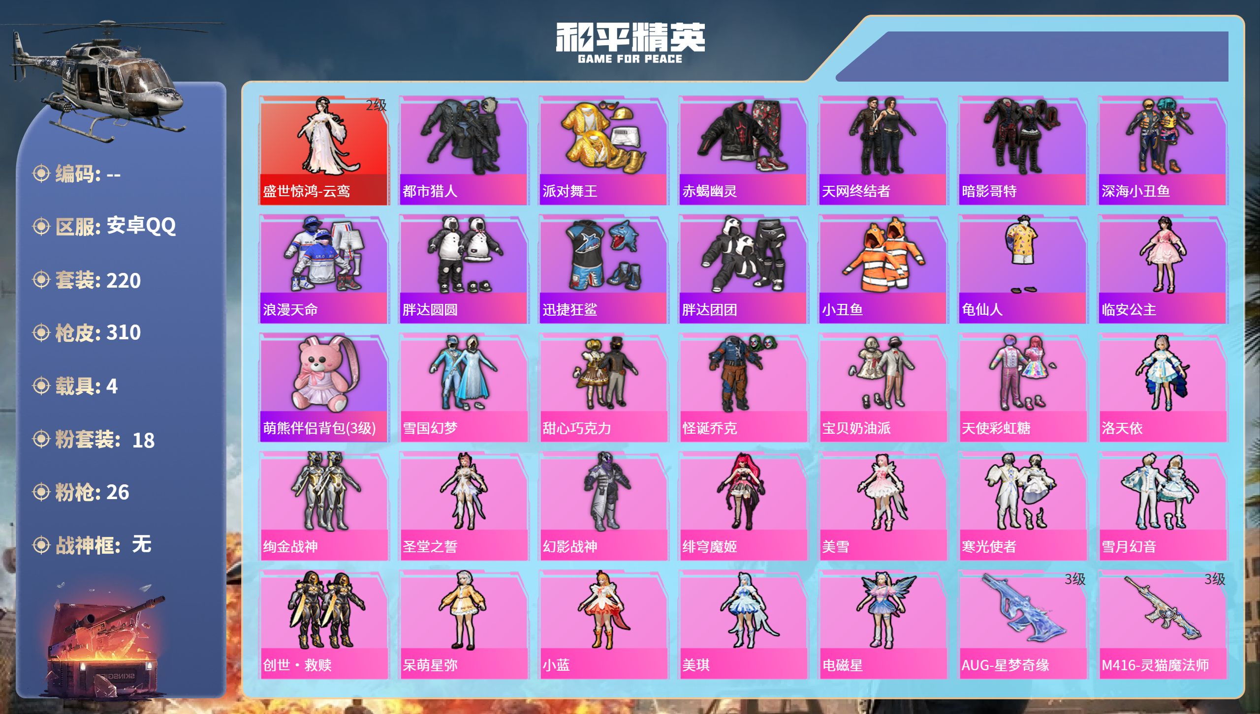 PX_2543036-安卓手Q-17王牌印记-1红装-18粉装-26特效枪-4载具-热力值-220套装-310枪皮-8卓越印记-3传奇印记 【1红装】盛世惊鸿-云鸾/2级 【18粉装】套装-天使彩虹糖,角色-呆萌星弥,套装-雪国幻梦,套装-甜心巧克力,角色-洛天依,套装-寒光使者,角色-美琪,角色-电磁星,角色-绯穹魔姬,角色-圣堂之誓,套装-绚金战神,套装-怪诞乔克,套装-宝贝奶油派,套装-创世·救赎,角色-美雪,套装-幻影战神,套装-雪月幻音,角色-小蓝 【26特效枪】Mk14-盛世惊鸿/3级,M416-暖熊萌萌/5级,破片手榴弹-瓶中星球/5级,AUG-星梦奇缘/3级,M416-电玩时刻/5级,ARX-无垠阁/5级,P90-沙丘之主/3级,SCAR-L-锦绣绵绵/5级,DP-28-豹影疾电/5级,M416-灵猫魔法师/3级,M24-魔法神域/5级,AKS-74U-森灵之息/4级,AKM-甜心宝贝/7级,M762-电糖天使/5级,GROZA-精灵之光/3级,AKM-星际浪客/1级,AUG-暖羊咩咩/5级,SCAR-L-金蛇镇世/3级,PKM-萌骑夺宝/2级,蜜獾-异瞳寒姬/5级,Kar98K-未来歌姬/5级,Mk14-福马献瑞/5级,Kar98K-巳巳如意/5级,GROZA-镜光银凌/5级,UMP45-量子极限/5级,MG3-洛神天依/4级 【14稀有紫装】都市猎人,派对舞王,赤蝎幽灵,天网终结者,暗影哥特,深海小丑鱼,浪漫天命,胖达圆圆,迅捷狂鲨,胖达团团,小丑鱼,龟仙人,临安公主,萌熊伴侣背包(3级) 【4稀有载具】宝马M4(圣保罗黄),护世瑞兽,星梦玉骢,盛世惊鸿摩托车 【1僚机】僚机-圣域龙宝 【220稀有时装】云鸾/2级,雪国幻梦,甜心巧克力,怪诞乔克,宝贝奶油派,天使彩虹糖,洛天依,绚金战神,圣堂之誓,幻影战神,绯穹魔姬,美雪,寒光使者,雪月幻音,创世·救赎,呆萌星弥,小蓝,美琪,电磁星,迅捷龙虾,SS38特训,都市猎人,胖达团团,浪漫天命,龟仙人,暗影哥特,深海小丑鱼,小丑鱼,迅捷狂鲨,胖达圆圆,赤蝎幽灵,派对舞王,天网终结者,萌神柯基,粉雾星云,萌趣咩咩,糯粉咩咩,龙魂突击队,小熊娃娃,异域银装,先驱飞行员,摩登魅猫,绒宝小鹅,街头风暴,星途旅人,冰河战士,鱼渊荷华,创世·追猎,青团波波,大橘大利,燕燕于飞,NV战队服,RSG战队服,达芬奇,临安公主,战术大师,智谋强哥,紫俏灵猫,雏菊兔兔,马上有钱,糖糖葫芦,香桃花海,米开朗基罗,蝶变,巳巳如意,曼妙人鱼,棉花软糖,极地流光,闪电轻猫,午间小调,彩虹兔,琴音绮想,灵公主,雪绒豹,画境星梦,朱霞炽焰,狂鲨锋刃,绛羽幽主,游乐,凌霄紫焰,粉黛兰香,擎苍青焰,炫彩糖果,绯色魅影,萌鸡速递,元气之梦,书海巡游,风迹短诗,薄荷星砂,秘语星愿,云朵鹅,银尘,雪国风尚,蓝冰羽,恋语绒绒,青翼流星,紫幽梦,SS35特训,SS29特训,萝兰蝴蝶,SS31特训,SS33特训,SS32特训,SS36特训,贝斯之夜,焰鹰斗篷,军械专家,湖雨初晴,都市漫游者,虎虎生威吉莉,夏日音浪,龙的传人,魔力冰咖,萌黄之夏,隐空刺,SS37特训,蝶吟花词,SS28特训,特训学院,黄色运动,蓝色运动,白色伏地魔,热血青春,活力之心,阳光火鸡,湖蓝色名流,绯格组合,暖暖麦兜,涂山之恋,SS26特训,迅猛虎鲸,野性山猫,漫步者,空岛之星,热情海星,黑色伏地魔,黎明保卫者,炫蓝之夏,纯真浪花,SS34特训,竞技名士,猛禽,SS30特训,长空猛禽,特战装甲,旭日情侣,甜蜜告白,本愿之火,街头潮人,辉星之火,魅力单车,春光漫游,水银刺客,幻世战舞者,青涩时光,青春校园,牛气满满,娇憨猪猪,春日漫步,冰川特警,燃烧卡路里,极速红龙,狙击之神,沙漠毒蛇,生化防暴队,红釉青花,麻辣教官,鹰眼刺客,雨过天青,福马献瑞,冰冻风暴,幽夜迷踪,破蛋小黄鸡,快闪甜心,红潮炫舞,酸甜橘柚,千禧之恋,耀眼新星,竞技达人朋克,幸运萌趣趣,野性战心,海岛探路者,幻世保卫者,和煦暖阳,霓虹街区,田园牧歌,轻风白浪,沙漠兵团,探宝勇士,SS27特训,牛气冲天,飞行日记,熠彩粉晶,SS19特训,光之冒险,晨曦薄雾,SS20特训,血色贵族,SS21特训,玉兔迎春,SS22特训,SS23特训,呆萌铁蟹,缤纷果语,青涩年华,天籁歌者,电音精灵,幻羽潜行,海盐绵绵冰,老实芭蕉,吉莉礼服,王牌教练,荣耀,暗夜之虎,柠萌假日,微雨春柳,SS24特训,鹤鸣,SS25特训,星梦畅游 【311稀有枪械】AUG-星梦奇缘/3级,M416-灵猫魔法师/3级,SCAR-L-金蛇镇世/3级,GROZA-精灵之光/3级,P90-沙丘之主/3级,Mk14-盛世惊鸿/3级,M416-暖熊萌萌/5级,M416-电玩时刻/5级,AKM-甜心宝贝/7级,AKM-星际浪客/1级,SCAR-L-锦绣绵绵/5级,GROZA-镜光银凌/5级,AUG-暖羊咩咩/5级,M762-电糖天使/5级,Kar98K-巳巳如意/5级,Kar98K-未来歌姬/5级,M24-魔法神域/5级,Mk14-福马献瑞/5级,UMP45-量子极限/5级,DP-28-豹影疾电/5级,MG3-洛神天依/4级,PKM-萌骑夺宝/2级,蜜獾-异瞳寒姬/5级,ARX-无垠阁/5级,AKS-74U-森灵之息/4级,破片手榴弹-瓶中星球/5级,QBZ-纯真浪花,AWM-纯真浪花,汤姆逊-纯真浪花,DBS-乌木金纹,AA12-G-纯真浪花,平底锅-纯真浪花,大砍刀-鸢尾晶梦,汤姆逊-星梦奇缘,蜜獾-精灵梦叶罗丽,S1897-精灵梦叶罗丽,MK20-H-星梦奇缘,SCAR-L-海盐豹豹,GROZA-海盐豹豹,SLR-金丰海韵,野牛-雏菊兔兔,蝎式手枪-金丰海韵,Mk14-冰河战士,平底锅-雏菊兔兔,M762-雏菊兔兔,Mini14-雏菊兔兔,Vector-突变脉冲,R1895-雏菊兔兔,撬棍-突变脉冲,UZI-冰河战士,M16A4-冰河战士,MK20-H-乌木金纹,MK20-H-圣域龙灵,DBS-风迹短诗,莫辛纳甘-风迹短诗,Mini14-鸡智如我,Win94-乌木金纹,MK12-风迹短诗,MK12-乌木金纹,AKM-灵猫魔法师,PKM-紫幽梦,ACE32-画境星梦,M1加兰德-画境星梦,MP5K-画境星梦,Mk14-紫幽梦,蜜獾-乌木金纹,M762-云朵鹅,S1897-紫幽梦,SVD-云朵鹅,P92-紫幽梦,蜜獾-绯穹魔姬,AWM-绿洲时空,M249-绯穹魔姬,SPAS-12-狂鲨锋刃,M417-玩趣呆呆,MK20-H-狂鲨锋刃,AUG-冰晶雪宝,铝热弹-炫彩糖果,UZI-炫彩糖果,ARX-