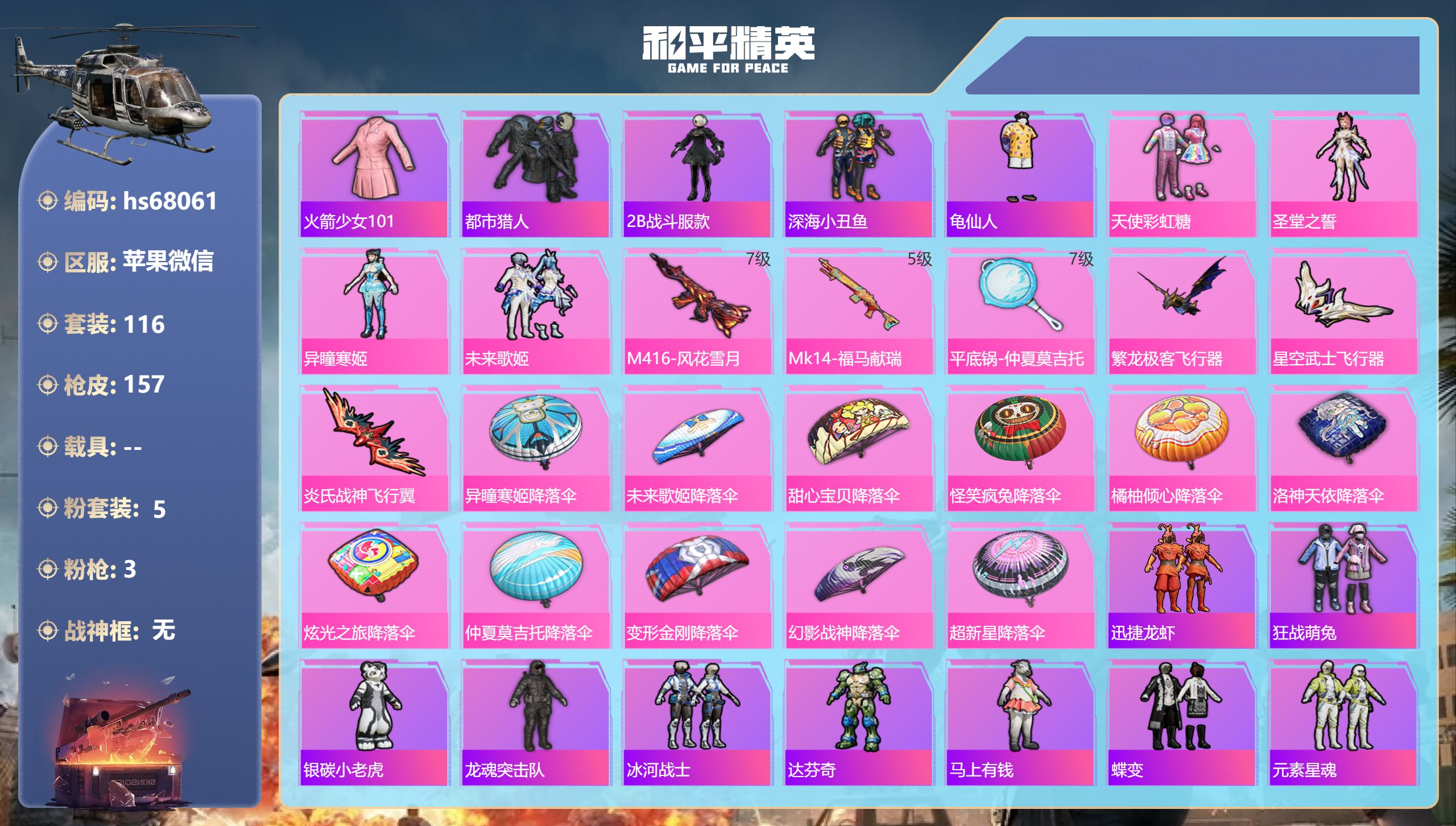 PX_2541612-,苹果微信-5王牌印记-5粉装-3特效枪-52815热力值-116套装-157枪皮 【5粉装】套装-天使彩虹糖,角色-鸢尾珑雾,套装-未来歌姬,角色-圣堂之誓,角色-异瞳寒姬 【3特效枪】M416-风花雪月/7级,平底锅-仲夏莫吉托/7级,Mk14-福马献瑞/5级 【1热门】火箭少女101 【4稀有紫装】都市猎人,2B战斗服款,深海小丑鱼,龟仙人 【115稀有时装】天使彩虹糖,圣堂之誓,异瞳寒姬,未来歌姬,火箭少女101,迅捷龙虾,都市猎人,龟仙人,深海小丑鱼,2B战斗服款,狂战萌兔,银碳小老虎,龙魂突击队,冰河战士,达芬奇,马上有钱,蝶变,元素星魂,琴音绮想,画境星梦,绯色魅影,书海巡游,雪国风尚,青翼流星,SS29特训,华灯初上,SS36特训,贝斯之夜,焰鹰斗篷,军械专家,龙的传人,青玉碎影,SS37特训,SS28特训,猎鹰,黄色运动,蓝色运动,黄色伏地魔,白色伏地魔,湖蓝色名流,黄色名流,酷潮明星,绯格组合,涂山之恋,SS26特训,漫步者,空岛之星,热情海星,黑色伏地魔,炫蓝之夏,纯真浪花,竞技名士,深蓝色名流,猛禽,长空猛禽,六六大吉,街头潮人,惊鸿侠骨,魅力单车,春光漫游,水银刺客,浪漫假日,幻世战舞者,战地督导,青涩时光,幻影公爵,滨海假日,极速红龙,狙击之神,红釉青花,鹰眼刺客,雨过天青,福马献瑞,冰冻风暴,完美偶像,幻影武者,破蛋小黄鸡,疯狂小兔子,快闪甜心,绮丽涂鸦,坚韧舞者,竞技达人朋克,野性战心,海岛探路者,霓虹街区,无烬之地,SS27特训,情公主,SS18特训,SS17特训,空投萌叽,金戈铁马,SS19特训,光之冒险,SS20特训,SS21特训,绝对偶像,弄潮海豚,深海梦境,SS22特训,SS23特训,缤纷果语,天籁歌者,电音精灵,白兰地假日,龙舌兰冰茶,妙红点点,幻彩翩翩,幻羽潜行,海盐绵绵冰,荣耀,暗夜之虎,鹤鸣,SS25特训,锦衣飞扬 【158稀有枪械】M416-风花雪月/7级,Mk14-福马献瑞/5级,平底锅-仲夏莫吉托/7级,QBZ-纯真浪花,AWM-纯真浪花,汤姆逊-纯真浪花,DBS-乌木金纹,AA12-G-纯真浪花,平底锅-纯真浪花,蜜獾-精灵梦叶罗丽,S1897-精灵梦叶罗丽,SCAR-L-海盐豹豹,Mk14-冰河战士,UZI-冰河战士,M16A4-冰河战士,MK20-H-乌木金纹,MK12-乌木金纹,ACE32-画境星梦,M1加兰德-画境星梦,MP5K-画境星梦,蜜獾-乌木金纹,SPAS-12-狂鲨锋刃,MK20-H-狂鲨锋刃,SCAR-L-天象三御,ARX-像素花束,大砍刀-像素花束,AA12-G-画境星梦,平底锅-画境星梦,十字弩-异瞳寒姬,信号枪-异瞳寒姬,MG-36-薄荷星砂,M416-红色方程式,M416-蓝色火焰,M416-糯团青竹,M416-绿野极光,AKM-影袭,AKM-星之彼岸,AKM-彩虹符号,AKM-破晓战魂,AKM-龙的传人,AKM-2P战斗服款,AKM-灼热熔岩,AKM-霓虹街区,SCAR-L-红色方程式,SCAR-L-甜蜜旋律,M16A4-幻世战舞者,GROZA-影袭,AUG-耀粉歌者,QBZ-洛神天依,QBZ-银碳小老虎,M762-甜心宝贝,M762-第五大道,Mk47-乌木金纹,Mk47-炫光之旅,Mk47-妙红点点,Mk47-洛神天依,G36C-乌木金纹,AC-VAL-快闪甜心,AC-VAL-乌木金纹,蜜獾-天降萌叽,蜜獾-千面幻镜,Kar98K-2B战斗服款,Kar98K-影袭,Kar98K-炫彩节奏,M24-乌木金纹,M24-青空秋雨,M24-影袭,M24-仲夏莫吉托,M24-炫彩节奏,AWM-天降萌叽,AWM-雷霆特警,AWM-焰鹰斗篷,莫辛纳甘-乌木金纹,莫辛纳甘-银碳小老虎,AMR-乌木金纹,AMR-镜光幻境,AMR-妙红点点,M200-仲夏莫吉托,M200-惊鸿侠骨,SKS-炫彩节奏,VSS-绿野极光,VSS-彩虹符号,Mini14-耀粉歌者,Mini14-涂山之恋,Mini14-穿刺龙虾,Mk14-乌木金纹,M417-惊鸿侠骨,MK20-H-快闪甜心,MK20-H-莲影清波,UZI-影袭,UZI-金玉无双,UZI-啾咪啾咪,UMP45-涂山之恋,UMP45-蓝色火焰,UMP45-生命誓言,UMP45-仲夏莫吉托,UMP45-炫光之旅,UMP45-猪猪侠,Vector-彩虹符号,Vector-焰鹰斗篷,汤姆逊-耀粉歌者,汤姆逊-天降萌叽,野牛-乌木金纹,野牛-粉锦千层,MP5K-蓝莓炮弹,MP5K-乌木金纹,P90-乌木金纹,P90-快闪甜心,P90-倾城蜜语,P90-闪光银龙,P90-玩趣呆呆,S12K-破晓战魂,S12K-玩趣呆呆,S12K-幻世战舞者,DBS-焰鹰斗篷,AA12-G-星空武士,AA12-G-炫光之旅,M249-彩虹符号,M249-糯团青竹,M249-莲影清波,M249-妙红点点,DP-28-相思残雪,DP-28-甜心宝贝,DP-28-焰鹰斗篷,DP-28-彩虹符号,MG3-惊鸿侠骨,MG3-幻世战舞者,MG3-妙红点点,MG3-乌木金纹,蝎式手枪-闲梦青缨,沙漠之鹰-快闪甜心,TMP-9-未来歌姬,大砍刀-2P战斗服款,平底锅-惊鸿侠骨,平底锅-空岛之星,平底锅-光之冒险,平底锅-妙红点点,平底锅-快闪甜心,平底锅-焰鹰斗篷,撬棍-甜心宝贝,爆炸猎弓-惊鸿侠骨,爆炸猎弓-炎氏战神,破片手榴弹-呆爆全场,撬棍-冰晶雪宝,MG3-火熔核心,ACE32-冰晶雪宝,M16A4-雨过天青,GROZA-福马献瑞,蜜獾-启元战纹,AMR-雨过天青,SLR-乌木金纹,AA12-G-雨过天青,PKM-雨过天青,沙漠之鹰-雨过天青,Mk47-虹云熊熊,VSS-香桃花海,汤姆逊-像素花束,MG3-火熔核心 【7稀有飞行器】狂鲨锋刃飞行器,马上有福飞行器,空岛之星尾迹,粉色滑翔尾迹,繁龙极客飞行器,星空武士飞行器,炎氏战神飞行翼 【31稀有背包】百万伏特背包(3级),萌物绒绒背包(3级),狂鲨锋刃背包(3级),画境星梦背包(3级),异瞳寒姬背包(3级),幻影战神背包(3级),金丰海韵背包(3级),天降萌叽背包(3级),龟仙人龟壳背包(3级),破晓战魂背包(3级),焰鹰斗篷背包(3级),海盐豹豹背包(3级),甜心宝贝背包(3级),快闪甜心背包(3级),纯真浪花背包(3级),蝶变背包(3级),仲夏莫吉托背包(3级),炫光之旅背包(3级),霓虹街区背包(3级),雪国风尚背包(3级),龙的传人背包(3级),雨过天青背包(3级),千仞雪背包(3级),鬼刀背包(3级),拂晓神骑背包(3级),福马献瑞背包(3级),2B战斗服款背包(3级),炎氏战神背包(3级),冰河战士背包(3级),妙红点点背包(3级),惊鸿侠骨背包(3级) 【49稀有降落伞】海盐豹豹降