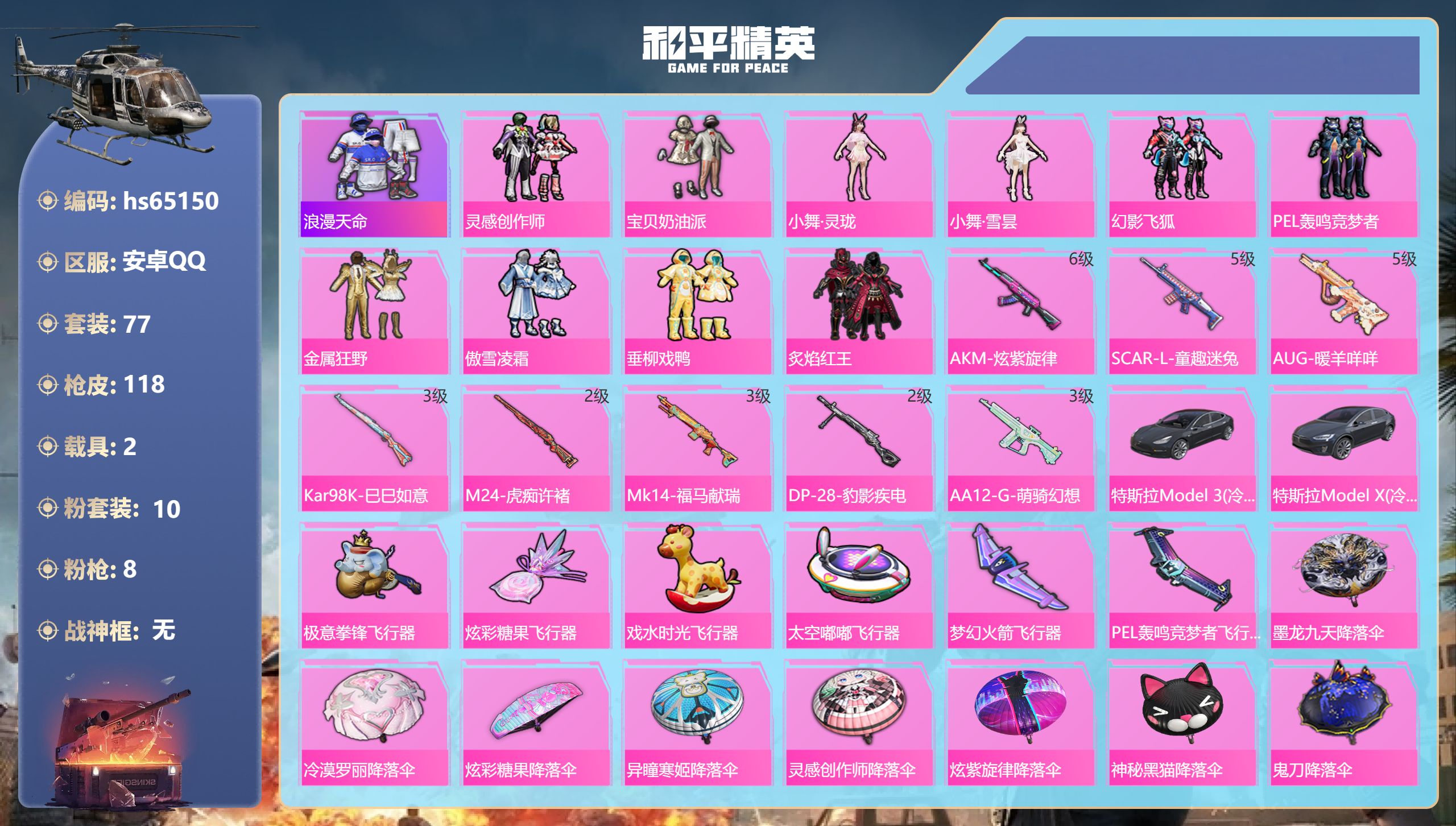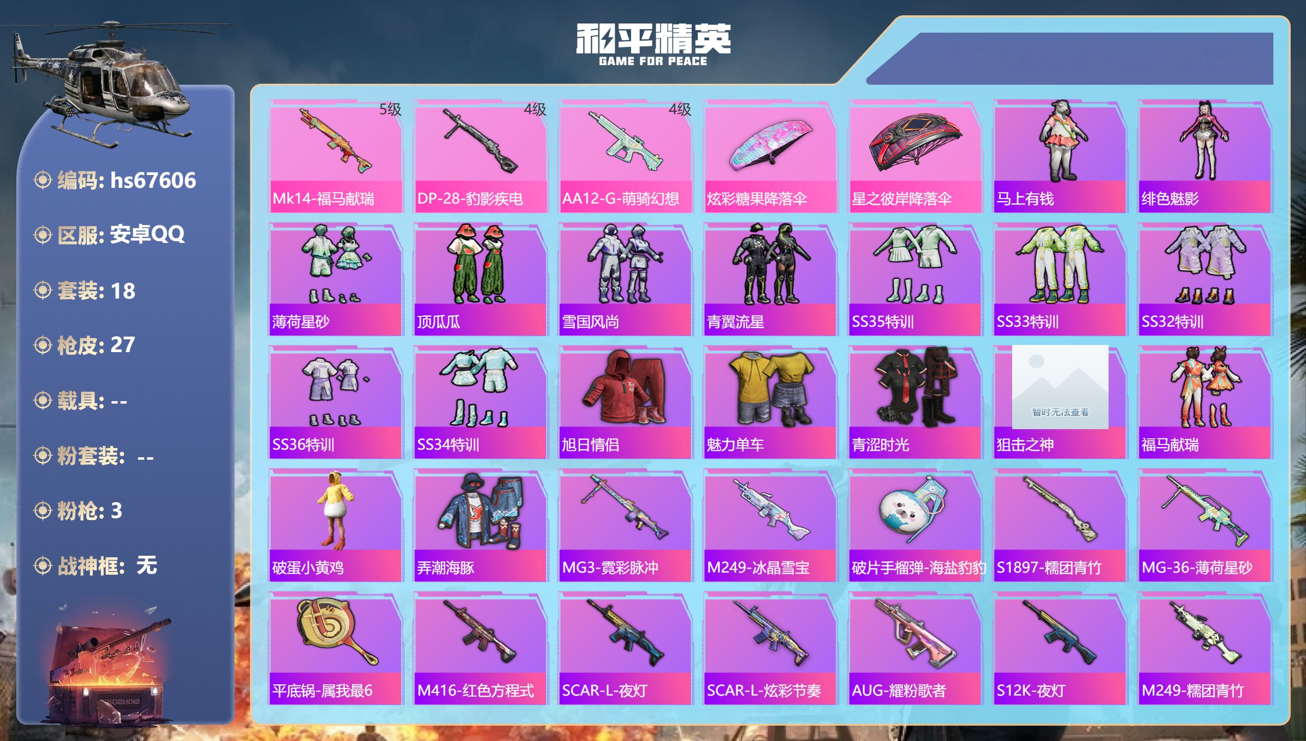 PX_2524936-具-4粉装-3特效枪,幻彩电音,7级冷魅冰魄,智耀战神[7级]】无二次包安卓手Q-1载具-4粉装-3特效枪-101套装-118枪皮-8王牌印记-英勇黄金Ⅱ-37024热力值【1载具】俏皮小熊猫【4粉装】幻彩电音,紫电风暴,彩虹鹿灵,山涧鹿灵【3特效枪】M762-冷魅冰骑[7级],AMR-智耀战神[7级],Kar98K-巳巳如意[5级]【3飞行器】异域银装飞行器,火焰蝠人飞行服,破刃行动尾