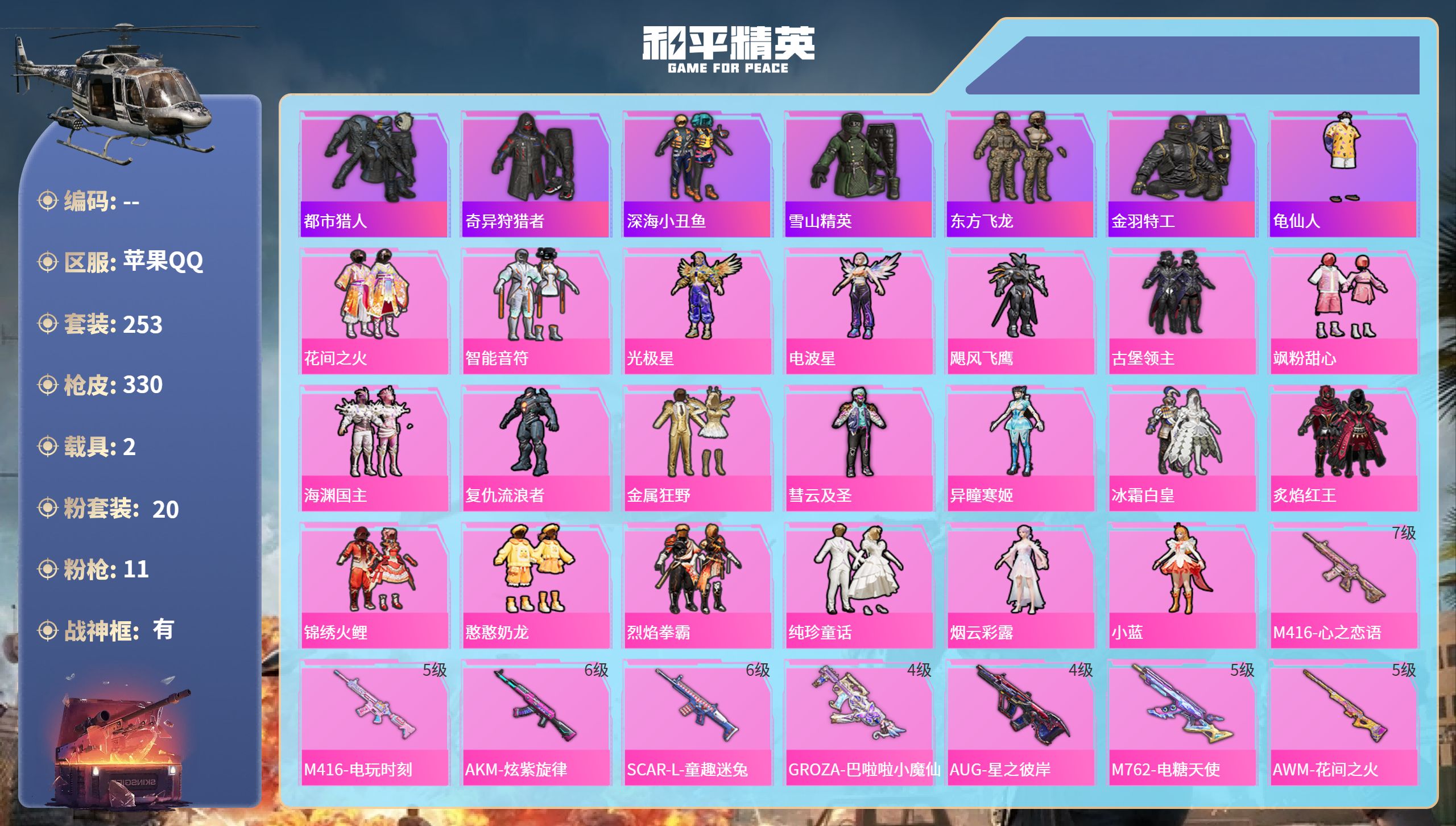 PX_2550068-苹果手Q-18王牌印记-有战神框-20粉装-11特效枪-2载具-热力值-253套装-330枪皮-2卓越印记-1传奇印记 【20粉装】套装-彗云及圣,套装-古堡领主,角色-异瞳寒姬,套装-烈焰拳霸,套装-锦绣火鲤,套装-憨憨奶龙,套装-飒粉甜心,角色-小蓝,套装-纯珍童话,套装-飓风飞鹰,套装-炙焰红王,套装-智能音符,角色-光极星,套装-海渊国主,套装-冰霜白皇,角色-复仇流浪者,套装-花间之火,角色-烟云彩露,套装-金属狂野,角色-电波星 【11特效枪】M762-电糖天使/5级,蜜獾-辉耀战甲/6级,M416-电玩时刻/5级,Vector-环太平洋/5级,GROZA-巴啦啦小魔仙/4级,AUG-星之彼岸/4级,SCAR-L-童趣迷兔/6级,AKM-炫紫旋律/6级,M416-心之恋语/7级,PKM-江南烟雨/4级,AWM-花间之火/5级 【7稀有紫装】都市猎人,奇异狩猎者,深海小丑鱼,雪山精英,东方飞龙,金羽特工,龟仙人 【2稀有载具】宾利飞驰(布罗德盖棕双色),布加迪威龙(律动橙) 【253稀有时装】花间之火,智能音符,光极星,电波星,飓风飞鹰,古堡领主,飒粉甜心,海渊国主,复仇流浪者,金属狂野,彗云及圣,异瞳寒姬,冰霜白皇,炙焰红王,锦绣火鲤,憨憨奶龙,烈焰拳霸,纯珍童话,烟云彩露,小蓝,迅捷龙虾,都市猎人,奇异狩猎者,龟仙人,雪山精英,深海小丑鱼,东方飞龙,金羽特工,大橘为重,潮萌小黄鸭,Alan,Walker,萌趣咩咩,神秘黑猫,软萌银虎,海上生明月,龙魂突击队,小熊娃娃,星途旅人,冰河战士,诡面顽熊,雏菊兔兔,香桃花海,蝶变,粉日山川,琴音绮想,画境星梦,喜羊羊,萌鸡速递,书海巡游,青翼流星,SS35特训,迷域探索者,机械英豪,机械征服者,SS29特训,萝兰蝴蝶,SS31特训,SS16特训,SS36特训,焰鹰斗篷,英勇保护者,智慧隐士,湖雨初晴,云丝凤蟒,福星高照,暗夜契约,纯白誓言,豚鼠丹丹,虎虎生威吉莉,夏日音浪,五号元素,军刀雅典娜,潮流炫酷,SS8特训,众神之王,智慧之神,白熊同盟,萌黄之夏,隐空刺,影双刃,SS37特训,PEL摇滚竞梦者,蝶吟花词,SS28特训,特训学院,猎鹰,深海来使,青年教官,暗黑骑手,橘黑制服,红色运动,黄色运动,蓝色运动,极速竞梦,黄色伏地魔,飞驰魅影,白色伏地魔,音速流光,热血青春,冰川格斗者,SS9特训,白月香洋装,酒红色名流,阳光火鸡,湖蓝色名流,黄色名流,丝绸行者,酷潮明星,绯格组合,涂山之恋,迅猛虎鲸,漫步者,黑色伏地魔,黎明保卫者,炫蓝之夏,SS34特训,竞技名士,蓝色守护者,深蓝色名流,猛禽,荷鲁斯之眼,SS30特训,长空猛禽,神奈川冲浪里,安第斯皇冠,特战装甲,灰色格斗者,六六大吉,甜蜜告白,本愿之火,街头潮人,辉星之火,怒火燎原,冷焰舞者,魅力单车,灼焰舞者,雪山征服者,水银刺客,猎梦纪元,丛林猎人,甜心亚梦,虚音幻奏,极地朋克,贵族骑装,幻世战舞者,蓝甜马卡龙,青春校园,战地名士,牛气满满,迎春赐吉,娇憨猪猪,风暴特警,春日漫步,冰川特警,燃烧卡路里,幻影公爵,极速红龙,狙击之神,红釉青花,麻辣教官,鹰眼刺客,雨过天青,冰冻风暴,完美偶像,SS11特训,人气偶像,幽夜迷踪,幻影武者,青春冒险家,破蛋小黄鸡,潮流游乐家,疯狂小兔子,特战英豪,酸甜橘柚,蓝彩潮人,千禧之恋,神秘领域,奶油香芋,耀眼新星,坚韧舞者,竞技达人朋克,淡雅花蕊,野性战心,原初圣火,逆风勇士,海岛探路者,李逍遥,核芯基因,精神漫游,幻世保卫者,霓虹街区,田园牧歌,萌趣颜团子,轻风白浪,SS10特训,风行保卫者,特种颜团子,沙漠兵团,闪金天王,镭射皇者,耀粉歌者,风华少年志,探宝勇士,SS12特训,SS27特训,牛气冲天,迅捷之星,SS18特训,治愈之星,银白舞王,清新柠檬,科技之星,SS13特训,飞行日记,SS17特训,瑞龙福将,团圆交子,金耀舞者,蓝调潮人,绚烂繁星,空投萌叽,SS19特训,光之冒险,SS20特训,SS21特训,玉兔迎春,弄潮海豚,深海梦境,SS22特训,SS23特训,摩登艾咪,甜蜜熊情侣,缤纷果语,SS14特训,龙舌兰冰茶,神气柴柴,妙红点点,幻彩翩翩,格斗先锋,幻羽潜行,海盐绵绵冰,吉莉礼服,王牌教练,柠萌假日,粉红小猪,SS24特训,懵萌河马,短笛,快乐星愿,蝎王蛇后,黑夜传说,SS15特训,深蓝冒险家 【331稀有枪械】M416-心之恋语/7级,M416-电玩时刻/5级,AKM-炫紫旋律/6级,SCAR-L-童趣迷兔/6级,GROZA-巴啦啦小魔仙/4级,AUG-星之彼岸/4级,M762-电糖天使/5级,AWM-花间之火/5级,Vector-环太平洋/5级,PKM-江南烟雨/4级,蜜獾-辉耀战甲/6级,S1897-青蛇行歌,DBS-乌木金纹,Famas-墨龙九天,Vector-创世·救赎,SCAR-L-海盐豹豹,GROZA-海盐豹豹,野牛-雏菊兔兔,Mk14-冰河战士,AKS-74U-尼罗河传说,平底锅-雏菊兔兔,M762-雏菊兔兔,Mini14-雏菊兔兔,Famas-突变脉冲,M200-宇宙意志,Vector-突变脉冲,R1895-雏菊兔兔,UZI-冰河战士,M16A4-冰河战士,MK20-H-乌木金纹,Win94-乌木金纹,MK12-乌木金纹,ACE32-画境星梦,M1加兰德-画境星梦,MP5K-画境星梦,SPAS-12-狂鲨锋刃,UZI-炫彩糖果,AA12-G-画境星梦,平底锅-画境星梦,AKS-74U-乌木金纹,破片手榴弹-拽到爆炸,MG-36-薄荷星砂,SVD-霓彩脉冲,SLR-霓彩脉冲,SCAR-L-彩虹符号,S12K-霓彩脉冲,M416-红色方程式,M416-神秘黑猫,M416-乌木金纹,M416-夜灯,M416-糯团青竹,M416-绿野极光,M416-滑板小狐,M416-彩虹嘻嘻猴,AKM-环太平洋,AKM-影袭,AKM-墨染幽兰,AKM-锦绣火鲤,AKM-夜灯,AKM-奇异狩猎者,AKM-乌木金纹,AKM-星之彼岸,AKM-彩虹符号,AKM-江南烟雨,AKM-龙的传人,AKM-玉龙,AKM-灼热熔岩,AKM-虎虎生威,AKM-萌趣颜团子,AKM-阿狸红,SCAR-L-玉兔迎春,SCAR-L-乌木金纹,SCAR-L-银碳小老虎,SCAR-L-繁花小夜曲,SCAR-L-怪兽之王,SCAR-L-扶摇飞仙,SCAR-L-炫彩节奏,M16A4-机械英豪,M16A4-幻世战舞者,M16A4-甜心亚梦,M16A4-九霄,GROZA-乌木金纹,GROZA-春暖花开,GRO