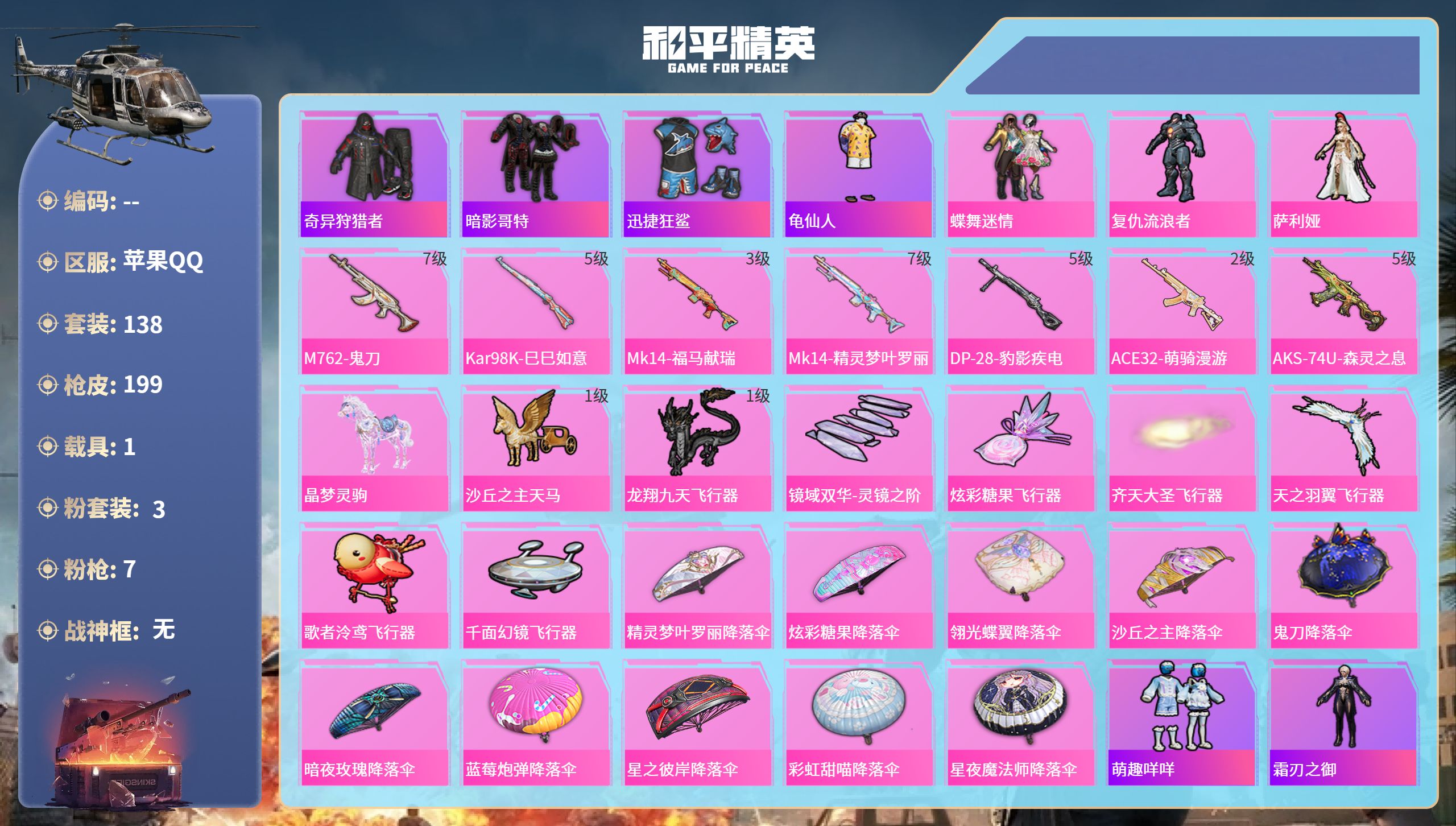 PX_2549178-,苹果手Q-10王牌印记-有战神框-2粉装-10特效枪-43287热力值-116套装-162枪皮-7卓越印记-5传奇印记 【2粉装】角色-冷漠罗丽,套装-极限特训 【10特效枪】Mk14-甜梦熊击/5级,M416-电玩时刻/5级,信号枪-金乌曜日/2级,ACE32-萌骑漫游/5级,AKS-74U-森灵之息/5级,Mk14-福马献瑞/5级,Kar98K-巳巳如意/5级,DP-28-豹影疾电/5级,SCAR-L-锦绣绵绵/5级,AUG-暖羊咩咩/5级 【3稀有紫装】都市猎人,派对舞王,龟仙人 【115稀有时装】极限特训,冷漠罗丽,SS38特训,都市猎人,龟仙人,派对舞王,龙魂突击队,阿虎,异域银装,幸运青,星渊小夜曲,街头风暴,星途旅人,冰河战士,鱼渊荷华,大橘大利,燕燕于飞,战术大师,智谋强哥,香桃花海,蝶变,巳巳如意,粉日山川,元素星魂,午间小调,彩虹兔,琴音绮想,乐音,雪绒豹,画境星梦,朱霞炽焰,狂鲨锋刃,阳光菠萝,游乐,凌霄紫焰,粉黛兰香,云魄琉璃,擎苍青焰,炫彩糖果,萌鸡速递,元气之梦,书海巡游,风迹短诗,薄荷星砂,秘语星愿,云朵鹅,顶瓜瓜,雪国风尚,恋语绒绒,青翼流星,马上来财,SS35特训,SS29特训,SS31特训,SS33特训,SS32特训,SS36特训,焰鹰斗篷,军械专家,魂电,SS37特训,蝶吟花词,SS28特训,特训学院,猎鹰,青年教官,红色运动,黄色运动,蓝色运动,黄色伏地魔,白色伏地魔,活力之心,湖蓝色名流,漫步者,黑色伏地魔,SS34特训,竞技名士,猛禽,SS30特训,长空猛禽,旭日情侣,魅力单车,水银刺客,青涩时光,青春校园,春日漫步,燃烧卡路里,幻影公爵,狙击之神,红釉青花,鹰眼刺客,雨过天青,福马献瑞,冰冻风暴,玲珑侠影,冷酷挑战者,幽夜迷踪,破蛋小黄鸡,摇滚战魂,摇滚舞王,暗金炫舞,绮丽涂鸦,海岛探路者,幻世保卫者,霓虹街区,奈斯,烈火街头,SS27特训,光之冒险,缤纷果语,滨海厨神,幻羽潜行,海盐绵绵冰,王牌教练,粉红小猪 【162稀有枪械】M416-电玩时刻/5级,SCAR-L-锦绣绵绵/5级,AUG-暖羊咩咩/5级,Kar98K-巳巳如意/5级,Mk14-甜梦熊击/5级,Mk14-福马献瑞/5级,DP-28-豹影疾电/5级,ACE32-萌骑漫游/5级,AKS-74U-森灵之息/5级,信号枪-金乌曜日/2级,DBS-乌木金纹,SCAR-L-海盐豹豹,平底锅-精灵梦叶罗丽,GROZA-海盐豹豹,Mk14-冰河战士,UZI-冰河战士,M16A4-冰河战士,MK20-H-乌木金纹,DBS-风迹短诗,莫辛纳甘-风迹短诗,Mini14-鸡智如我,AKM-绿洲时空,Win94-乌木金纹,MK12-风迹短诗,MK12-乌木金纹,破片手榴弹-爆破雪人,DBS-幻彩电音,ACE32-画境星梦,M1加兰德-画境星梦,MP5K-画境星梦,蜜獾-乌木金纹,M762-云朵鹅,SVD-云朵鹅,SPAS-12-狂鲨锋刃,M417-玩趣呆呆,MK20-H-狂鲨锋刃,AUG-冰晶雪宝,铝热弹-炫彩糖果,UZI-炫彩糖果,ARX-像素花束,MG3-鸢尾珑雾,AA12-G-画境星梦,平底锅-画境星梦,M249-冰晶雪宝,Mk47-风迹短诗,JS9-凌霄紫焰,MG-36-凌霄紫焰,破片手榴弹-海盐豹豹,UMP45-海盐豹豹,ARX-凌霄紫焰,AKS-74U-乌木金纹,AKM-涂鸦街区,蜜獾-风迹短诗,爆炸猎弓-喜羊羊与灰太狼,P92-凌霄紫焰,Famas-乌木金纹,Famas-霓彩脉冲,SPAS-12-云朵鹅,M249-无面战甲,破片手榴弹-拽到爆炸,十字弩-异瞳寒姬,平底锅-凌霄紫焰,Mk14-薄荷星砂,AKS-74U-鸡智如我,沙漠之鹰-云朵鹅,烟雾弹-冰氧夏日,Mk14-紫晶流影,MG-36-薄荷星砂,大砍刀-云朵鹅,PKM-啾咪啾咪,SVD-霓彩脉冲,SLR-霓彩脉冲,平底锅-属我最6,SCAR-L-彩虹符号,AUG-紫晶流影,S12K-霓彩脉冲,AMR-鸡智如我,AKM-霓彩脉冲,M416-蓝色火焰,AKM-影袭,AKM-破晓战魂,AKM-龙的传人,SCAR-L-夜灯,GROZA-影袭,AUG-耀粉歌者,AUG-甜蜜菠萝,AUG-闲梦青缨,AUG-天降萌叽,QBZ-彩虹符号,M762-彩虹符号,M762-奇异狩猎者,蜜獾-天降萌叽,Kar98K-影袭,Kar98K-金玉无双,M24-影袭,AWM-天降萌叽,AWM-焰鹰斗篷,AMR-乌木金纹,SKS-金玉无双,Mini14-金玉无双,Mini14-炫彩节奏,UZI-影袭,UZI-幻影战神,UZI-金玉无双,UZI-天降萌叽,UMP45-夜灯,UMP45-金玉无双,Vector-金玉无双,Vector-焰鹰斗篷,MP5K-乌木金纹,P90-玩趣呆呆,S1897-炫彩节奏,S12K-玩趣呆呆,S12K-幻影战神,S12K-夜灯,DBS-焰鹰斗篷,M249-彩虹符号,M249-星之彼岸,DP-28-焰鹰斗篷,MG3-幻世战舞者,平底锅-空岛之星,平底锅-炫紫旋律,平底锅-焰鹰斗篷,破片手榴弹-呆爆全场,Kar98K-顶峰精英,撬棍-冰晶雪宝,MG3-火熔核心,ACE32-冰晶雪宝,AUG-异域银装,MK20-H-星途旅人,DBS-月影灵韵,M24-樱桃泡泡,野牛-燕燕于飞,UZI-月影灵韵,M200-乌木金纹,SPAS-12-燕燕于飞,蝎式手枪-燕燕于飞,十字弩-异域银装,SCAR-L-星途旅人,大砍刀-鬼刀,S686-巳巳如意,SPAS-12-乌木金纹,爆炸猎弓-花中眠,Vector-燕燕于飞,十字弩-燕燕于飞,破片手榴弹-星途旅人,M16A4-雨过天青,GROZA-福马献瑞,蜜獾-启元战纹,AMR-雨过天青,SLR-乌木金纹,AA12-G-雨过天青,PKM-雨过天青,沙漠之鹰-雨过天青,燃烧瓶-福马献瑞,P90-紫矿核心,VSS-香桃花海,Mini14-香桃花海,汤姆逊-像素花束,P90-巳巳如意,破片手榴弹-巳巳如意,MG3-火熔核心 【6稀有飞行器】狂鲨锋刃飞行器,马上有福飞行器,鸡智如我飞行器,炫彩糖果飞行器,顶峰精英尾迹,异域银装飞行器 【30稀有背包】狂鲨锋刃背包(3级),绝对恒星背包(3级),画境星梦背包(3级),星穹咏叹调背包(3级),炫彩糖果背包(3级),凌霄紫焰背包(3级),粉黛兰香背包(3级),萌鸡速递背包(3级),薄荷星砂背包(3级),风迹短诗背包(3级),巳巳如意背包(3级),云朵鹅背包(3级),幻影战神背包(3级),暮色玫影背包(3级),龟仙人龟壳背包(3级),焰鹰斗篷背包(3级),海盐豹豹背包(3级),蝶变背包(3级),圣堂之誓背包(3级),异域银装背包(3级),雪国风尚背包(3级),龙的传人背包(3级),江南烟雨背包(3级),甜蜜菠萝背包(3级),福马献瑞背包(3级),荒原烈焰背包(3级),智谋强哥背包(3级),香桃花海背
