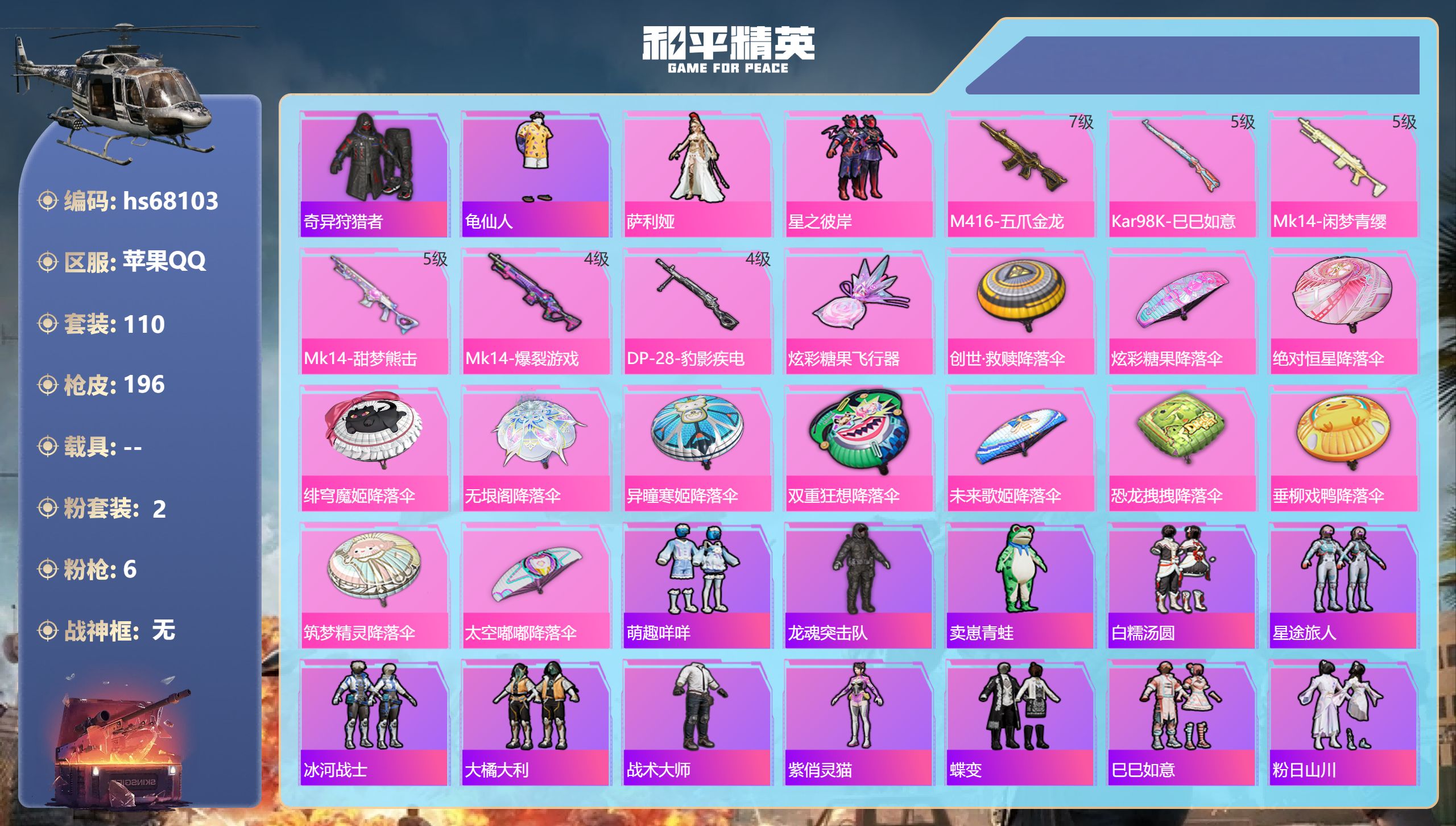 PX_2550095-,苹果手Q-7王牌印记-2粉装-6特效枪-51835热力值-110套装-196枪皮-3卓越印记 【2粉装】角色-萨利娅,套装-星之彼岸 【6特效枪】Mk14-爆裂游戏/4级,M416-五爪金龙/7级,Kar98K-巳巳如意/5级,DP-28-豹影疾电/4级,Mk14-闲梦青缨/5级,Mk14-甜梦熊击/5级 【2稀有紫装】奇异狩猎者,龟仙人 【110稀有时装】萨利娅,星之彼岸,奇异狩猎者,龟仙人,萌趣咩咩,龙魂突击队,卖崽青蛙,白糯汤圆,星途旅人,冰河战士,大橘大利,战术大师,紫俏灵猫,蝶变,巳巳如意,粉日山川,曼妙人鱼,元素星魂,午间小调,琴音绮想,画境星梦,星影赞美诗,狂鲨锋刃,阳光菠萝,炫彩糖果,萌鸡速递,荧光像素,小鸟芋圆,书海巡游,风迹短诗,错位像素,混沌火种,秘语星愿,顶瓜瓜,雪国风尚,蓝冰羽,青翼流星,紫幽梦,SS35特训,SS29特训,SS31特训,SS33特训,SS32特训,SS36特训,贝斯之夜,童真绒兔,湖雨初晴,SS37特训,SS28特训,飞驰魅影,白色伏地魔,音速流光,活力之心,湖蓝色名流,顽皮玉兔,绯格组合,SS26特训,空岛之星,热情海星,黑色伏地魔,纯真浪花,竞技名士,银月精灵,猛禽,SS30特训,长空猛禽,特战装甲,旭日情侣,街头潮人,惊鸿侠骨,魅力单车,春光漫游,猎梦纪元,甜心亚梦,虚音幻奏,幻世战舞者,青涩时光,牛气满满,娇憨猪猪,春日漫步,燃烧卡路里,麻辣教官,冰冻风暴,破蛋小黄鸡,疯狂小兔子,快闪甜心,耀眼新星,坚韧舞者,海岛探路者,霓虹街区,探宝勇士,SS27特训,牛气冲天,清新柠檬,蓝调潮人,SS19特训,SS20特训,SS21特训,玉兔迎春,SS22特训,缤纷果语,神气柴柴,海盐绵绵冰,老实芭蕉,SS24特训,鹤鸣,懵萌河马,SS25特训,锦衣飞扬,星梦畅游 【196稀有枪械】M416-五爪金龙/7级,Kar98K-巳巳如意/5级,Mk14-闲梦青缨/5级,Mk14-甜梦熊击/5级,Mk14-爆裂游戏/4级,DP-28-豹影疾电/4级,AKS-74U-白蛇盈舞,QBZ-纯真浪花,AWM-纯真浪花,汤姆逊-纯真浪花,DBS-乌木金纹,AA12-G-纯真浪花,平底锅-纯真浪花,P1911-创世·救赎,Vector-创世·救赎,蜜獾-精灵梦叶罗丽,S1897-精灵梦叶罗丽,SCAR-L-海盐豹豹,GROZA-海盐豹豹,Mk14-冰河战士,Famas-突变脉冲,Vector-突变脉冲,UZI-冰河战士,M16A4-冰河战士,MK20-H-乌木金纹,DBS-风迹短诗,莫辛纳甘-风迹短诗,M416-错位像素,Win94-乌木金纹,MK12-风迹短诗,野牛-魔童闹海,敖闰,MK12-乌木金纹,F57-魔童闹海,敖闰,AKS-74U-荧光像素,S12K-极意拳锋,PKM-紫幽梦,ACE32-画境星梦,M1加兰德-画境星梦,MP5K-画境星梦,Mk14-紫幽梦,M24-幻彩电音,蜜獾-乌木金纹,S1897-紫幽梦,P92-紫幽梦,AWM-绿洲时空,M249-绯穹魔姬,汤姆逊-错位像素,MK20-H-狂鲨锋刃,AUG-冰晶雪宝,突击盾牌-绝对恒星,铝热弹-炫彩糖果,UZI-炫彩糖果,UMP45-极意拳锋,AA12-G-画境星梦,平底锅-画境星梦,M249-冰晶雪宝,Kar98K-星穹咏叹调,Mk47-风迹短诗,平底锅-紫幽梦,燃烧瓶-甜梦桃焰,UMP45-海盐豹豹,AKS-74U-乌木金纹,电击枪-喜羊羊与灰太狼,蜜獾-风迹短诗,Famas-乌木金纹,破片手榴弹-拽到爆炸,十字弩-异瞳寒姬,信号枪-异瞳寒姬,Mk14-薄荷星砂,AKS-74U-鸡智如我,烟雾弹-冰氧夏日,MG-36-薄荷星砂,SCAR-L-绿洲时空,PKM-荧光像素,M200-爆裂游戏,撬棍-双重狂想,SVD-霓彩脉冲,蜜獾-鸡智如我,AUG-紫晶流影,M416-魔童闹海,敖闰,M416-红色方程式,M416-蓝色火焰,M416-黄金狮王,M416-绯红前夜,AKM-彩虹符号,AKM-缤纷海域,AKM-冰凉西瓜,AKM-破晓战魂,AKM-龙的传人,AKM-灼热熔岩,AKM-霓虹街区,SCAR-L-红色方程式,SCAR-L-玉兔迎春,SCAR-L-黄金龙骨,SCAR-L-夜灯,SCAR-L-炫彩节奏,M16A4-幻世战舞者,M16A4-甜心亚梦,GROZA-恐龙拽拽,GROZA-影袭,GROZA-懵萌河马,GROZA-彩虹符号,AUG-耀粉歌者,AUG-天降萌叽,QBZ-飞驰魅影,QBZ-洛神天依,QBZ-彩虹符号,M762-彩虹符号,M762-奇异狩猎者,M762-橘柚倾心,M762-天降萌叽,Mk47-乌木金纹,G36C-懵萌河马,AC-VAL-天降萌叽,AC-VAL-快闪甜心,AC-VAL-甜心亚梦,AC-VAL-乌木金纹,蜜獾-天降萌叽,蜜獾-娇憨猪猪,Kar98K-王子的夏天,Kar98K-飞驰魅影,Kar98K-彩虹符号,M24-乌木金纹,M24-影袭,M24-炫彩节奏,AWM-天降萌叽,莫辛纳甘-懵萌河马,AMR-乌木金纹,M200-惊鸿侠骨,SKS-炫彩节奏,VSS-星之彼岸,VSS-彩虹符号,Mini14-耀粉歌者,Mk14-乌木金纹,SLR-娇憨猪猪,M417-惊鸿侠骨,MK20-H-快闪甜心,UZI-炫彩节奏,UZI-影袭,UZI-娇憨猪猪,UZI-天降萌叽,UZI-啾咪啾咪,UMP45-生命誓言,UMP45-夜灯,Vector-生命誓言,汤姆逊-天降萌叽,汤姆逊-炫彩节奏,汤姆逊-环太平洋,MP5K-乌木金纹,P90-乌木金纹,P90-快闪甜心,P90-飞驰魅影,P90-玩趣呆呆,S686-生命誓言,S1897-炫彩节奏,S1897-飞驰魅影,S12K-守护天翼,S12K-破晓战魂,S12K-玩趣呆呆,S12K-幻世战舞者,S12K-娇憨猪猪,S12K-垂柳戏鸭,S12K-夜灯,DBS-甜心亚梦,DBS-彩虹符号,M249-糯团青竹,DP-28-彩虹符号,DP-28-甜心亚梦,DP-28-紫翼圣骑,MG3-惊鸿侠骨,MG3-幻世战舞者,MG3-乌木金纹,PKM-懵萌河马,沙漠之鹰-快闪甜心,TMP-9-未来歌姬,平底锅-惊鸿侠骨,平底锅-空岛之星,平底锅-飞驰魅影,平底锅-懵萌河马,平底锅-娇憨猪猪,平底锅-甜心亚梦,平底锅-快闪甜心,撬棍-幻世战舞者,爆炸猎弓-惊鸿侠骨,破片手榴弹-呆爆全场,Mk14-阳光菠萝,撬棍-冰晶雪宝,ACE32-冰晶雪宝,UMP45-绒宝小鹅,MK20-H-星途旅人,M200-乌木金纹,十字弩-异域银装,SPAS-12-乌木金纹,P90-紫矿核心,GROZA-紫矿核心,P90-巳巳如意 【5稀有飞行器】狂鲨锋刃飞行器,炫彩糖果飞行器,登顶巅峰飞行器,破刃行动尾迹,空岛之星尾迹 【29稀有背包】懵萌河马背包(3级),狂鲨锋刃背包(3级),绝对恒星背包(3级),画境星梦背包(3级),炫彩糖果背包(3级),异瞳寒姬背包(3级),紫幽梦背包(3级),风迹短诗背包(3级),双重狂想背包(3级),巳巳如