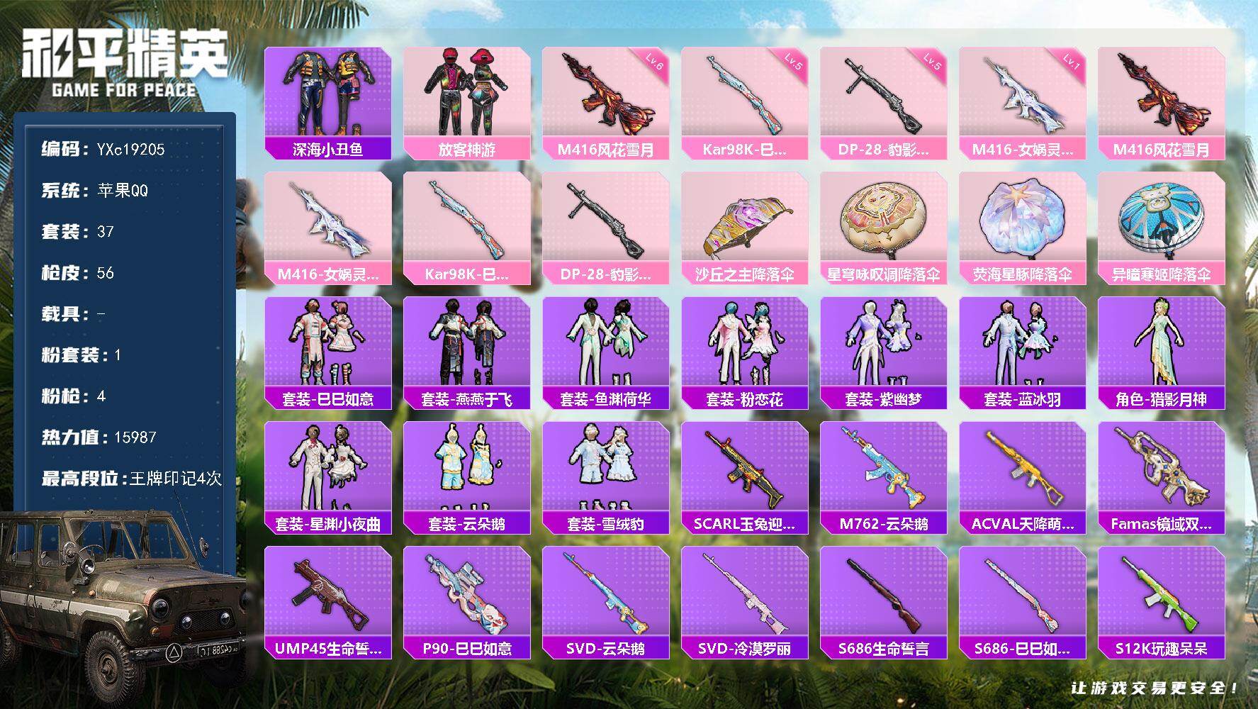 PX_2257203-??,M416女娲】YXc19205-【可二次】【因赛季更新游戏段付以上号为准!】 苹果Q-1粉装4特效枪3热门37套装56枪皮,4印记,历史卓越王牌12星, 【1粉装】,放客神游, 【4特效枪】,M416-女娲灵识,(1级),Kar98K-巳巳如意,(5级),DP-28-豹影疾电,(5级),M416-风花雪月,(6级), 【3热门】,梦魇先生,迅捷狂鲨,深海小丑鱼