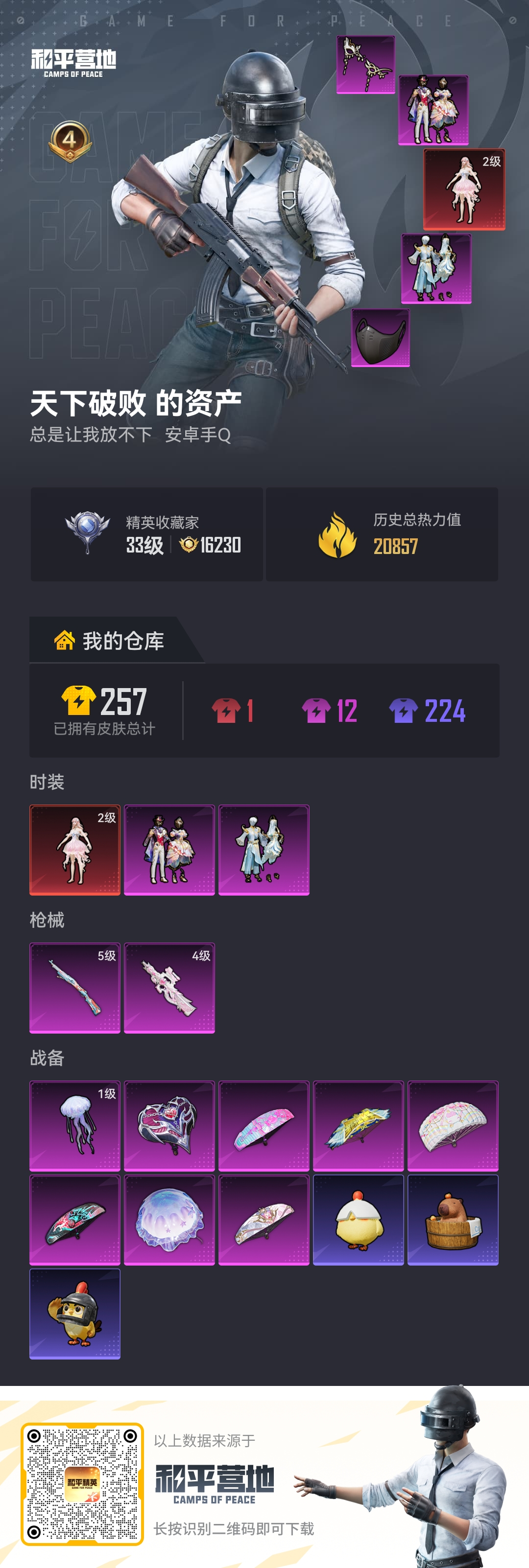 PX_2554484-2载具-68套装-119枪皮-1红装2载具6粉装10特效枪1热门68套装119枪皮,45810热力值,6印记,历史传奇王牌20星,【1红装】,暮色玫影-艾丽娅,(3级),【2载具】,暮色幽蹄,凌风神骏,【6粉装】,冰魄,奇迹舞步美雪,绯穹魔姬,千金淑猫,冷漠罗丽,幻海仙踪,【10特效枪】,AKM-暮色玫影,(3级),SCAR-L-灵驹仙姬,(3级),M416-灵猫魔法师,(3级),P90-冷漠罗丽,(5级),AKS-74U-星穹咏叹调,(5级),Vector-最终圣卫者,(3级),Mk14-樱桃泡泡,(4级),M416-风花雪月,(3级),Mk14-福马献瑞,(5级),UMP45-萌骑冒险,(4级),【1热门】,破蛋小黄鸡,营地ID: