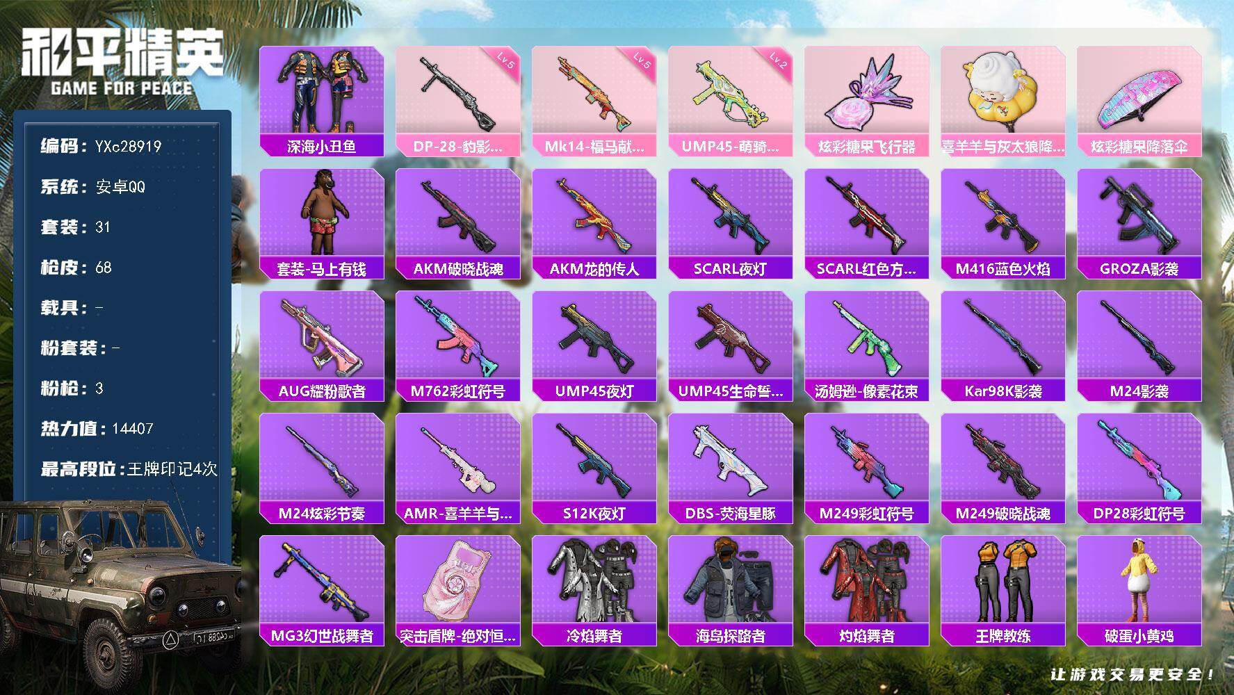 PX_2541543-安卓手Q-16王牌印记-1红装-14粉装-15特效枪-88415热力值-206套装-257枪皮-2卓越印记-1传奇印记 【1红装】沙丘之主-图卡盟/3级 【14粉装】角色-洛天依,套装-星之彼岸,套装-梦幻火箭,套装-怪诞乔克,套装-光明术士,套装-幻影战神,角色-异瞳寒姬,角色-复仇流浪者,角色-初号机款机体服,角色-冰魄,角色-灵玺,套装-极限特训,套装-放客神游,角色-月影灵韵 【15特效枪】M416-女娲灵识/3级,Kar98K-巳巳如意/5级,AUG-暖羊咩咩/5级,M200-梦海之灵/3级,蜜獾-异瞳寒姬/4级,AKS-74U-森灵之息/5级,DP-28-豹影疾电/5级,MG-36-沧焰双生/5级,Mk14-盛世惊鸿/3级,UMP45-萌骑冒险/3级,AUG-星之彼岸/5级,MG3-洛神天依/1级,M416-至情至圣/9级,Mk14-福马献瑞/5级,ARX-无垠阁/4级 【10稀有紫装】都市猎人,派对舞王,暗影哥特,深海小丑鱼,浪漫天命,明日香款战斗服,金羽特工,小丑鱼,龟仙人,临安公主 【205稀有时装】图卡盟/3级,梦幻火箭,怪诞乔克,初号机款机体服,放客神游,洛天依,极限特训,幻影战神,复仇流浪者,创世·幻影,月影灵韵,光明术士,灵玺,异瞳寒姬,冰魄,星之彼岸,迅捷龙虾,都市猎人,浪漫天命,龟仙人,暗影哥特,深海小丑鱼,小丑鱼,金羽特工,明日香款战斗服,派对舞王,狂沙舞者,潮萌小黄鸭,Alan,Walker,萌趣咩咩,龙魂突击队,卖崽青蛙,小熊娃娃,异域银装,摩登魅猫,星渊小夜曲,街头风暴,星途旅人,蜜桃派对,冰河战士,鱼渊荷华,TT战队服,青团波波,大橘大利,燕燕于飞,临安公主,战术大师,智谋强哥,紫俏灵猫,瑰石海星,雏菊兔兔,马上有钱,糖糖葫芦,小狗蛇点点,香桃花海,巳巳如意,粉恋花,棉花软糖,薰款战斗服,元素星魂,午间小调,琴音绮想,画境星梦,朱霞炽焰,狂鲨锋刃,凌霄紫焰,粉黛兰香,擎苍青焰,炫彩糖果,绯色魅影,萌鸡速递,元气之梦,书海巡游,风迹短诗,秘语星愿,顶瓜瓜,雪国风尚,蓝冰羽,恋语绒绒,紫幽梦,SS35特训,SS29特训,萝兰蝴蝶,SS31特训,SS33特训,SS32特训,SS36特训,贝斯之夜,焰鹰斗篷,军械专家,龙的传人,果汁能量,萌黄之夏,隐空刺,SS37特训,SS28特训,特训学院,猎鹰,青年教官,橘黑制服,红色运动,黄色运动,蓝色运动,顽皮橙,黄色伏地魔,白色伏地魔,登山爱好者,冰川格斗者,太极红客,湖蓝色名流,黄色名流,绯格组合,SS26特训,漫步者,空岛之星,黑色伏地魔,SS34特训,竞技名士,深蓝色名流,猛禽,SS30特训,长空猛禽,旭日情侣,街头潮人,惊鸿侠骨,魅力单车,春光漫游,极地朋克,幻世战舞者,战地督导,街舞达人,牛气满满,娇憨猪猪,风暴特警,春日漫步,冰川特警,龙腾端午,燃烧卡路里,极速红龙,狙击之神,沙漠毒蛇,红釉青花,麻辣教官,鹰眼刺客,雨过天青,福马献瑞,冰冻风暴,玲珑侠影,冷酷挑战者,完美偶像,幽夜迷踪,幻影武者,破蛋小黄鸡,摇滚舞王,快闪甜心,蓝彩潮人,千禧之恋,绮丽涂鸦,竞技达人朋克,野性战心,海岛探路者,精神漫游,破晓战魂,幻世保卫者,和煦暖阳,霓虹街区,森林游猎者,田园牧歌,轻风白浪,耀粉歌者,探宝勇士,SS27特训,牛气冲天,清新柠檬,飞行日记,金耀舞者,光之冒险,SS20特训,SS21特训,玉兔迎春,深海梦境,SS22特训,SS23特训,呆萌铁蟹,摩登艾咪,夏日倾情,缤纷果语,滨海厨神,莱茵河畔,香榭午后,电音精灵,妙红点点,幻彩翩翩,幻羽潜行,海盐绵绵冰,老实芭蕉,王牌教练,暗夜之虎,柠萌假日,SS24特训,鹤鸣,SS25特训,快乐星愿,锦衣飞扬,星梦畅游 【258稀有枪械】M416-至情至圣/9级,M416-女娲灵识/3级,Mk14-盛世惊鸿/3级,M200-梦海之灵/3级,AUG-暖羊咩咩/5级,AUG-星之彼岸/5级,Kar98K-巳巳如意/5级,Mk14-福马献瑞/5级,UMP45-萌骑冒险/3级,DP-28-豹影疾电/5级,MG3-洛神天依/1级,蜜獾-异瞳寒姬/4级,ARX-无垠阁/4级,MG-36-沧焰双生/5级,AKS-74U-森灵之息/5级,DBS-乌木金纹,AMR-墨龙九天,蜜獾-精灵梦叶罗丽,SCAR-L-海盐豹豹,野牛-雏菊兔兔,平底锅-雏菊兔兔,M762-雏菊兔兔,Mini14-雏菊兔兔,R1895-雏菊兔兔,M16A4-冰河战士,MK20-H-乌木金纹,DBS-风迹短诗,莫辛纳甘-风迹短诗,Win94-乌木金纹,MK12-风迹短诗,MK12-乌木金纹,烟雾弹-冰澜龙吟,破片手榴弹-爆破雪人,PKM-紫幽梦,MG3-霓彩脉冲,ACE32-画境星梦,M1加兰德-画境星梦,MP5K-画境星梦,Mk14-紫幽梦,蜜獾-乌木金纹,S1897-紫幽梦,P92-紫幽梦,SPAS-12-狂鲨锋刃,M417-玩趣呆呆,MK20-H-狂鲨锋刃,AUG-冰晶雪宝,铝热弹-炫彩糖果,UZI-炫彩糖果,ARX-像素花束,大砍刀-像素花束,AA12-G-画境星梦,G36C-星穹咏叹调,平底锅-画境星梦,M249-冰晶雪宝,Kar98K-星穹咏叹调,Mk47-风迹短诗,JS9-凌霄紫焰,MG-36-凌霄紫焰,平底锅-紫幽梦,ARX-凌霄紫焰,AKS-74U-乌木金纹,AKM-涂鸦街区,蜜獾-风迹短诗,爆炸猎弓-喜羊羊与灰太狼,P92-凌霄紫焰,AMR-喜羊羊与灰太狼,Famas-乌木金纹,Famas-霓彩脉冲,破片手榴弹-拽到爆炸,十字弩-异瞳寒姬,S1897-糯团青竹,信号枪-异瞳寒姬,平底锅-凌霄紫焰,MG3-智耀战神,MG-36-薄荷星砂,PKM-啾咪啾咪,SVD-霓彩脉冲,SLR-霓彩脉冲,SCAR-L-彩虹符号,S12K-霓彩脉冲,AKM-霓彩脉冲,破片手榴弹-火尖莲影,M416-蓝色火焰,M416-糯团青竹,M416-暗夜行者,M416-诡夜天鹅,AKM-影袭,AKM-星之彼岸,AKM-彩虹符号,AKM-春暖花开,AKM-破晓战魂,AKM-龙的传人,AKM-霓虹街区,SCAR-L-红色方程式,SCAR-L-玉兔迎春,SCAR-L-黄金龙骨,SCAR-L-夜灯,SCAR-L-炫彩节奏,M16A4-幻世战舞者,GROZA-春暖花开,GROZA-影袭,GROZA-田园牧歌,AUG-幻影战神,AUG-耀粉歌者,AUG-青春冒险家,QBZ-洛神天依,QBZ-彩虹符号,M762-奇异狩猎者,M762-天降萌叽,Mk47-乌木金纹,Mk47-炫光之旅,Mk47-妙红点点,Mk47-洛神天依,AC-VAL-天降萌叽,AC-VAL-快闪甜心,AC-VAL-乌木金纹,蜜獾-天