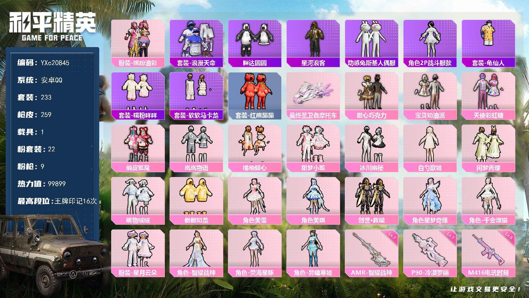 PX_2294347-??号,巧克力三姐妹,星梦奇缘,猪妹,小狐,番茄,糯粉,马卡龙】YXc20845-【无二次】【因赛季更新游戏段付以上号为准!】 安卓Q-1稀有1载具22粉装9特效枪17热门233套装259枪皮,16印记,历史超级王牌14星, 【1稀有】,浪漫天命, 【1载具】,最终圣卫者摩托车, 【22粉装】,美琪,美雪,傲傲奶龙,宝贝奶油派,天使彩虹糖,甜心巧克力,千金淑猫,荧海星豚,异瞳寒姬,星梦奇缘,创世救赎,白勺歌姬,闲梦青缨,智耀战神,星月云朵,缤纷油彩,萌物绒绒,橘柚倾心,冰川幽秘,俏皮狐尾,甜梦小狐,岚岚物语, 【9特效枪】,SCAR-L-锦绣绵绵,(5级),P90-魔童闹海敖丙,(3级),M416-电玩时刻,(5级),P90-冷漠罗丽,(7级),UMP45-宇宙意志,(3级),Kar98K-巳巳如意,(5级),DP-28-豹影疾电,(5级),AMR-智耀战神,(7级),破片手榴弹-粉粉猫爪,(7级), 【17热门】,龟仙人,2P战斗服款,红熊茄茄,动感兔斯基,软软马卡龙,晶辉守护,糯粉咩咩,兔兔白日梦,奶芙汪汪,恶魔喵喵,胖达圆圆,星河浪客,纯白誓言,梦之呓语,韶华初心,破蛋小黄鸡,极速红龙, 【7飞行器】,阿狸红飞行器,深渊漩涡飞行器,夜幕颂歌飞行器,萌物绒绒飞行器,太空嘟嘟飞行器,星夜魔法师飞行翼,甜梦小狐飞行器, 【1头盔】,甜心宝贝头盔, 【2背包】,甜心宝贝背包,深海小丑鱼背包