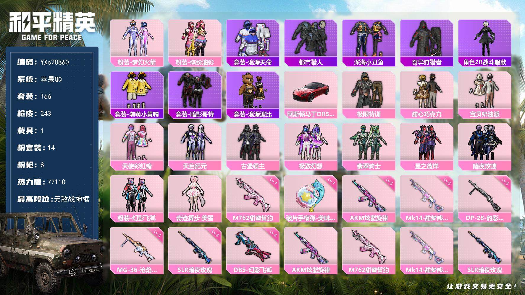 PX_2294338-赛季战神框,都市,蜘蛛侠,巧克力,猪妹,特训】YXc20860-【不可二次】【因赛季更新游戏段付以上号为准!】 苹果Q-3稀有1载具14粉装7特效枪35热门166套装243枪皮,7印记,历史无敌战神, 【3稀有】,奇异狩猎者,都市猎人,浪漫天命, 【1载具】,阿斯顿马丁S红色, 【14粉装】,梦幻火箭,天启纪元,奇迹舞步美雪,宝贝奶油派,天使彩虹糖,甜心巧克力,幻影飞狐,缤纷油彩,极限特训,古堡领主,极致幻想,翡翠骑士,星之彼岸,暗夜玫瑰, 【7特效枪】,AKM-炫紫旋律,(5级),M762-甜蜜誓约,(7级),MG-36-沧焰双生,(5级),DP-28-豹影疾电,(5级),Mk14-甜梦熊击,(5级),DBS-幻影飞狐,(4级),SLR-暗夜玫瑰,(4级), 【35热门】,奇迹天团,星光纪元,2B战斗服款,青涩年华,雪山精英,潮萌小黄鸭,鹰眼刺客,软萌银虎,奇迹天团,激萌罗小黑,深海小丑鱼,浪漫波比,NV战队服,暗夜契约,暗影哥特,团圆交子,瑞龙福将,纯白誓言,漫步者,梦之呓语,朱雀圣者,静谧青瓷,破蛋小黄鸡,风华少年志,白月香洋装,新侠客行,黑色刀锋,M416-魔法学院,M416-仓鼠灰灰,AKM-奇异狩猎者,M762-奇异狩猎者,M762-潮萌小黄鸭,M762-瑞龙福将,M24-奇异狩猎者,S686-奇异狩猎者, 【1飞行器】,春暖花开飞行器, 【6头盔】,梦幻火箭头盔,甜心宝贝头盔,金风玉露头盔,甜蜜誓约头盔,心之恋语头盔,夏日绵绵冰头盔, 【5背包】,梦幻火箭背包,甜心宝贝背包,金风玉露背包,神秘黑猫背包,甜蜜誓约背包
