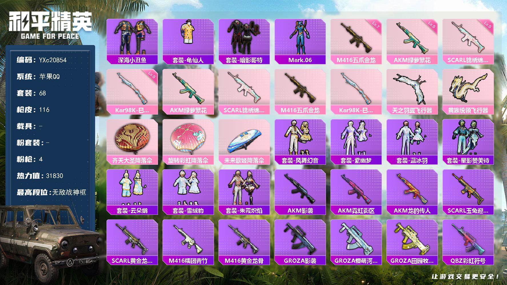 PX_2294341-??框,蓝螳螂,满级五爪金龙】YXc20854-【无二次协助处理】【因赛季更新游戏段付以上号为准!】 苹果Q-2稀有4特效枪7热门68套装116枪皮,12印记,历史无敌战神, 【2稀有】,M416-黄金龙骨,AWM-黄金龙骨, 【4特效枪】,M416-五爪金龙,(7级),SCAR-L-锦绣绵绵,(5级),AKM-绿萝繁花,(5级),Kar98K-巳巳如意,(5级), 【7热门】,Mark.06,龟仙人,鹰眼刺客,迅捷狂鲨,深海小丑鱼,暗影哥特,漫步者, 【2飞行器】,黄族统领飞行器,天之羽翼飞行器, 【2头盔】,深海小丑鱼头盔,金羽特工头盔, 【1背包】,金羽特工背包