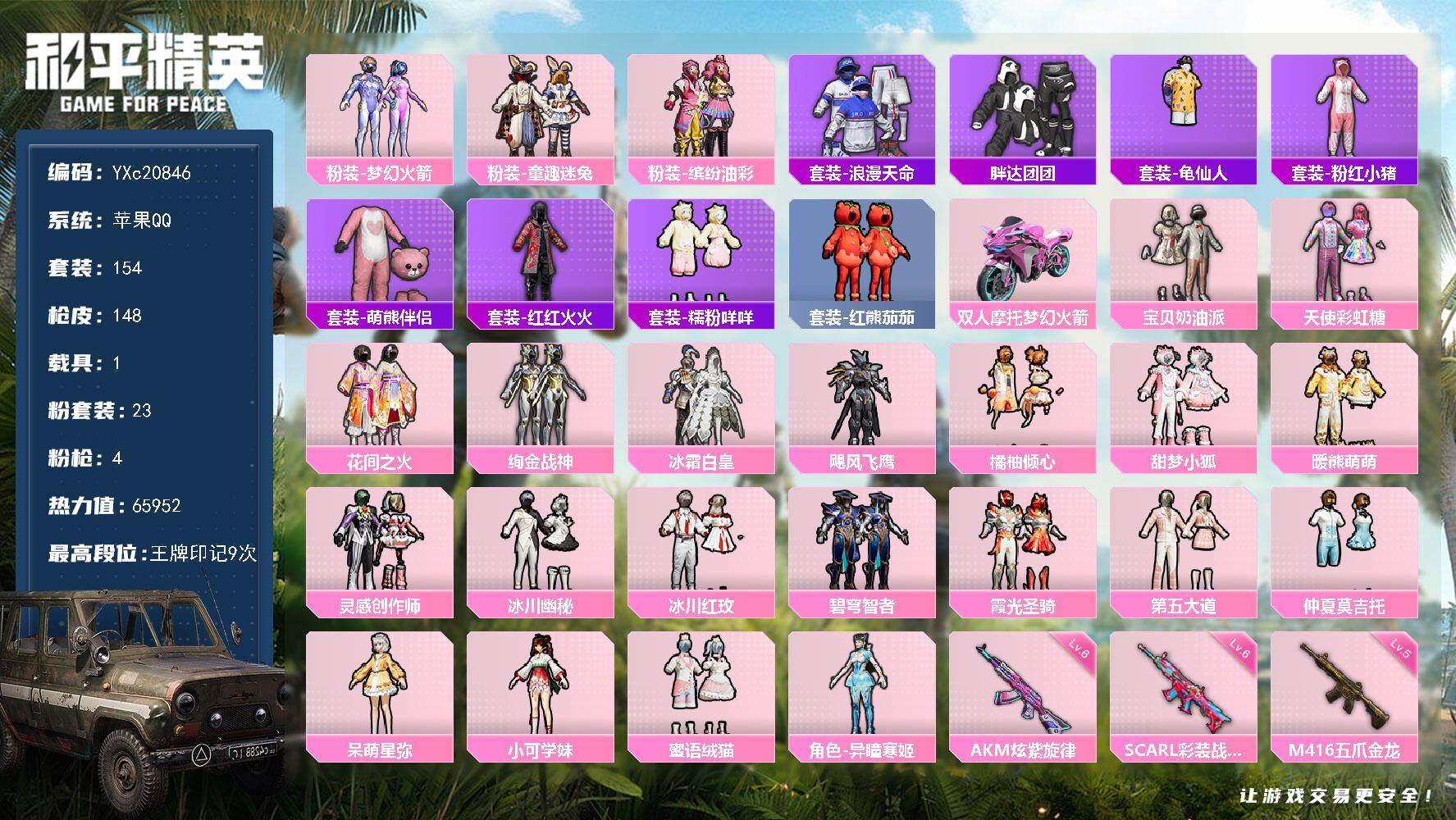 PX_2294346-??号,小狐,猪妹,新101,花和服,童趣,糯粉,番茄,胖达】YXc20846-【可二次】【因赛季更新游戏段付以上号为准!】 ,苹果Q-1稀有1载具23粉装4特效枪17热门154套装148枪皮,9印记,历史卓越王牌19星, 【1稀有】,浪漫天命, 【1载具】,双人摩托梦幻火箭, 【23粉装】,梦幻火箭,蜜语绒猫,宝贝奶油派,天使彩虹糖,异瞳寒姬,呆萌星弥,小可学妹,缤纷油彩,仲夏莫吉托,橘柚倾心,碧穹智者,第五大道,花间之火,冰川幽秘,灵感创作师,绚金战神,童趣迷兔,冰霜白皇,暖熊萌萌,霞光圣骑,甜梦小狐,飓风飞鹰,冰川红玫, 【4特效枪】,M416-五爪金龙,(5级),AKM-炫紫旋律,(6级),DP-28-豹影疾电,(5级),SCAR-L-彩装战姬,(6级), 【17热门】,龟仙人,萌神柯基,红熊茄茄,仓鼠灰灰,糯粉咩咩,鹰眼刺客,兔兔白日梦,奶芙汪汪,恶魔喵喵,胖达团团,粉红小猪,幽冥伯爵,西部牛仔,萌熊伴侣,狂沙舞者,梦之呓语,韶华初心, 【2飞行器】,梦幻火箭飞行器,夜幕颂歌飞行器, 【2头盔】,梦幻火箭头盔,花间之火头盔, 【3背包】,梦幻火箭背包,甜心宝贝背包,花间之火背包