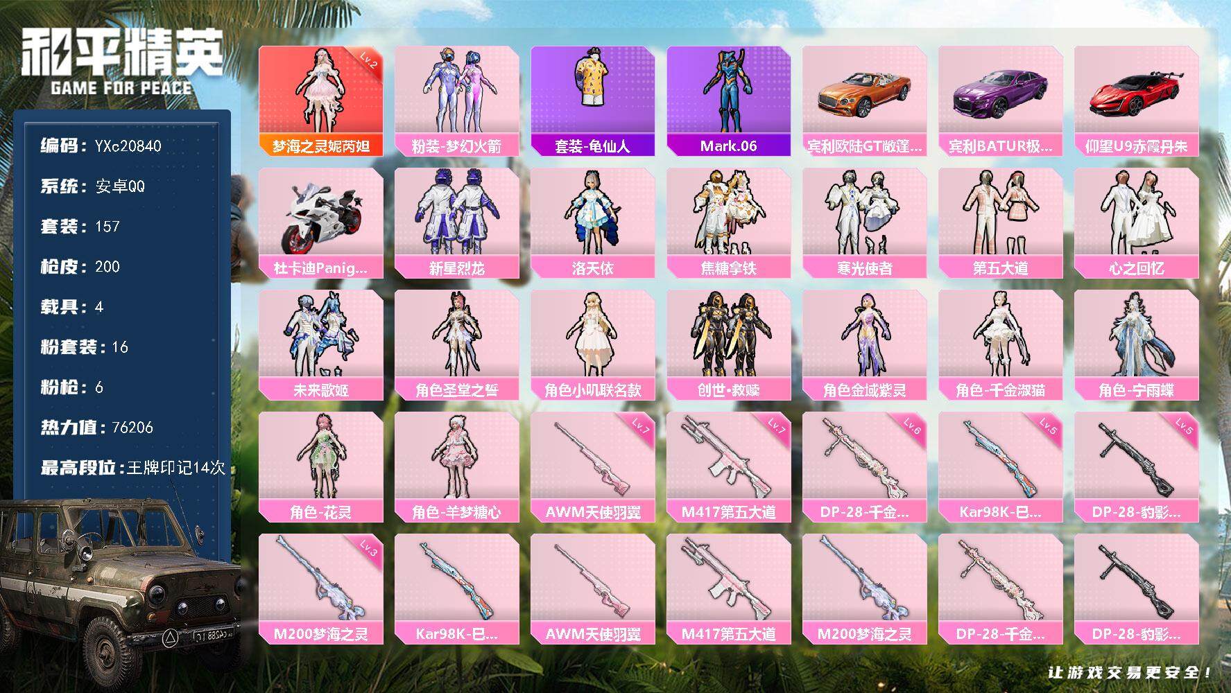 PX_2294351-??号,2级红,地铁满天赋】YXc20840-【无二次】【因赛季更新游戏段付以上号为准!】 安卓Q-1红装4载具16粉装6特效枪6热门157套装200枪皮,14印记,历史绝世王牌22星, 【1红装】,梦海之灵-妮芮妲,(2级), 【4载具】,仰望U9(赤霞丹朱),宾利BATUR(极速紫),宾利欧陆GT火焰橘,杜卡迪V4(星耀白), 【16粉装】,圣堂之誓,梦幻火箭,宁雨蝶,千金淑猫,洛天依,花灵,小叽联名款,未来歌姬,金域紫灵,羊梦糖心,创世救赎,第五大道,心之回忆,新星烈龙,焦糖拿铁,寒光使者, 【6特效枪】,Kar98K-巳巳如意,(5级),AWM-天使羽翼,(7级),DP-28-千金淑猫,(6级),DP-28-豹影疾电,(5级),M200-梦海之灵,(3级),M417-第五大道,(7级), 【6热门】,Mark.06,龟仙人,暗夜契约,团圆交子,纯白誓言,破蛋小黄鸡, 【2飞行器】,幻海精灵飞行器,冷魅冰骑飞行器, 【1头盔】,梦幻火箭头盔, 【1背包】,梦幻火箭背包