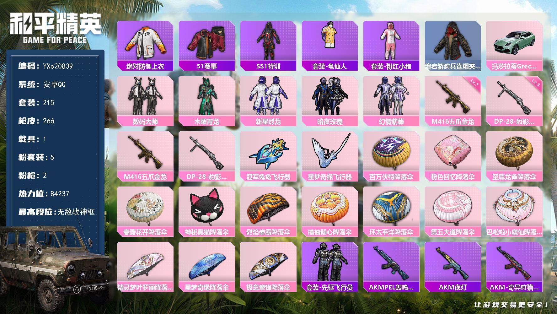 PX_2294360-??素材号,4个赛季战神框,S1整套,巡查衣,光子】YXc20839-【可二次】【因赛季更新游戏段付以上号为准!】 ,安卓Q-6稀有1载具5粉装2特效枪20热门215套装266枪皮,,26印记,历史无敌战神, 【6稀有】,S1赛事,S1赛事裤,S1赛事外套,巡查衣,AKM-百万伏特,SCAR-L-粉色回忆, 【1载具】,玛莎拉蒂G绿色, 【5粉装】,木曜青龙,数码大师,新星烈龙,幻情紫藤,暗夜玫瑰, 【2特效枪】,M416-五爪金龙,(7级),DP-28-豹影疾电,(3级), 【20热门】,龟仙人,光子十周年,雪山精英,梦魇先生,万圣娃娃,鹰眼刺客,迅捷狂鲨,赛罗奥特曼,SS1特训,团圆交子,瑞龙福将,粉红小猪,漫步者,机械英豪,破蛋小黄鸡,风华少年志,黑色刀锋,AKM-奇异狩猎者,M762-瑞龙福将,AUG-魔法学院, 【4头盔】,九霄头盔,木曜青龙头盔,百万伏特头盔,夏日绵绵冰头盔, 【3背包】,木曜青龙背包,百万伏特背包,金风玉露背包,