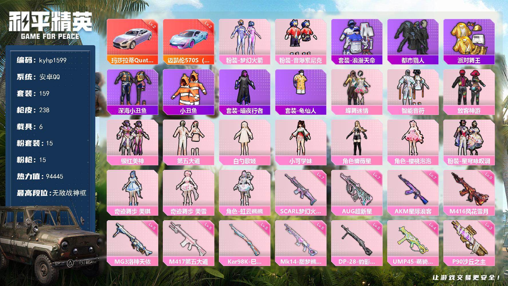 PX_2554417--无敌战神框-15粉装-15特效枪-6载具-7粉色飞行器-94445热力值-11王牌印记-159套装-238枪皮 【红色载具】:玛莎拉蒂Quattroporte(幻星粉)(二级),迈凯伦570S(炫冰蓝)(二级) 【热门品类】:粉装-梦幻火箭,粉装-音爆索尼克,套装-浪漫天命,套装-都市猎人,套装-派对舞王,套装-深海小丑鱼,套装-小丑鱼,套装-暗夜行者,套装-龟仙人 【粉色套装】: