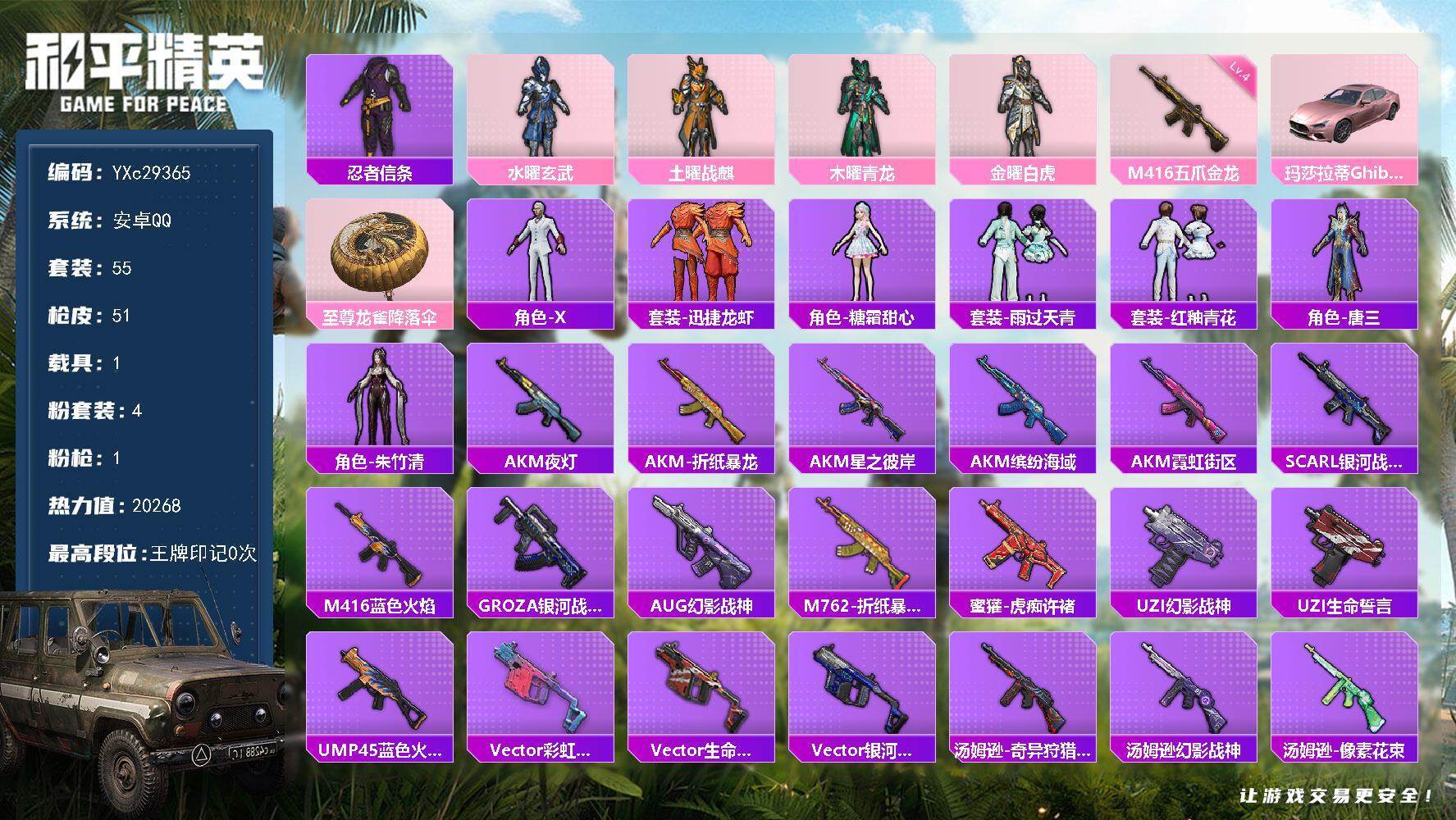 PX_2554435-??莎,五爪】YXc29365-【可二次】【因赛季更新游戏段付以上号为准!】 ,安卓Q-1稀有1载具4粉装1特效枪3热门55套装51枪皮,历史不朽星钻Ⅲ, 【1稀有】,AKM-缤纷海域, 【1载具】,玛莎拉蒂粉色, 【4粉装】,水曜玄武,土曜战麒,木曜青龙,金曜白虎, 【1特效枪】,M416-五爪金龙,(4级), 【3热门】,雪山精英,折纸暴龙,忍者信条, 【1飞行器】,至尊龙雀飞行服, 【8头盔】,银河战甲头盔,折纸暴龙头盔,土曜战麒头盔,金曜白虎头盔,木曜青龙头盔,水曜玄武头盔,幻影战神头盔,深海小丑鱼头盔, 【7背包】,折纸暴龙背包,土曜战麒背包,金曜白虎背包,木曜青龙背包,水曜玄武背包,幻影战神背包,深海小丑鱼背包,