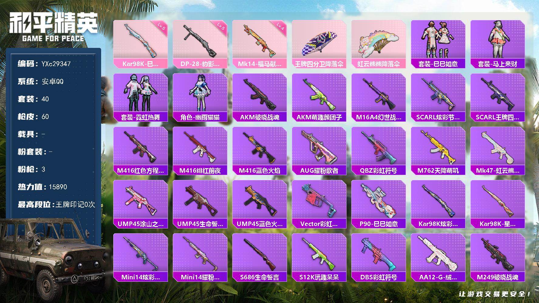 PX_2554430-7-【无二次协助处理】【因赛季更新游戏段付以上号为准!】 安卓Q-3特效枪1热门40套装60枪皮,,历史不朽星钻Ⅰ, 【3特效枪】,Kar98K-巳巳如意,(5级),DP-28-豹影疾电,(5级),Mk14-福马献瑞,(4级), 【1热门】,破蛋小黄鸡,