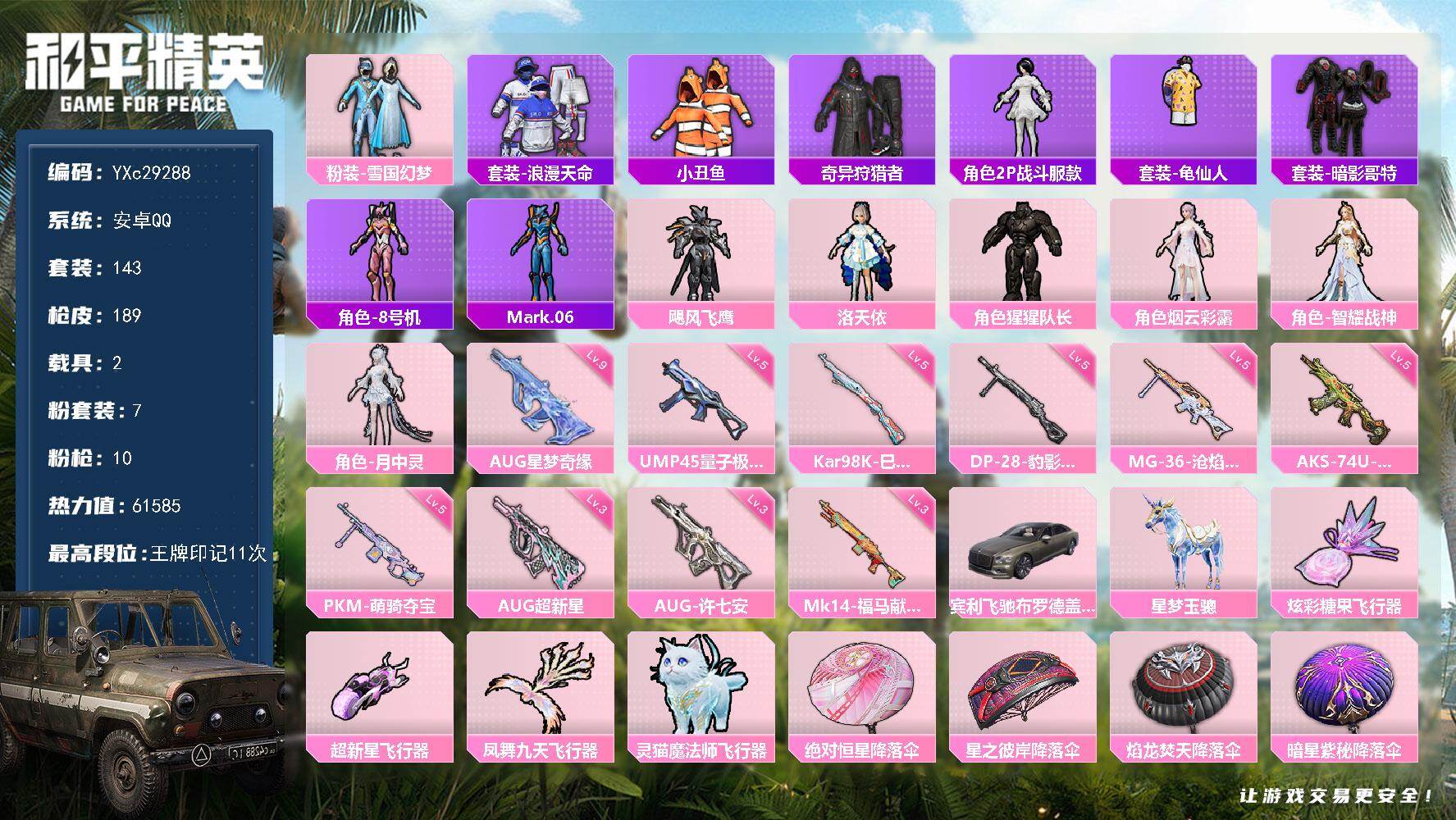 PX_2557027-??,金鞋,雪国,放客,6级AUG星梦,双马尾,小丑鱼,满地铁天赋】YXc29305-【无二次】【因赛季更新游戏段付以上号为准!】 ,安卓Q-4稀有1载具7粉装11特效枪7热门96套装153枪皮,8印记,历史传奇王牌17星, 【4稀有】,都市猎人,浪漫天命,派对舞王,派对舞王(金靴子), 【1载具】,星梦玉骢, 【7粉装】,雪国幻梦,时空协奏回响,洛天依,荧海星豚,星梦奇缘,放客神游,绚金战神, 【11特效枪】,AKS-74U-森灵之息,(4级),AKS-74U-星穹咏叹调,(7级),Kar98K-巳巳如意,(5级),DP-28-豹影疾电,(5级),AUG-星梦奇缘,(6级),GROZA-镜光银凌,(5级),AKM-梦之光华,(5级),MG3-洛神天依,(3级),Mk14-福马献瑞,(5级),ACE32-萌骑漫游,(2级),破片手榴弹-招财进宝,(5级), 【7热门】,小丑鱼,呆萌铁蟹,鹰眼刺客,深海小丑鱼,漫步者,破蛋小黄鸡,弄潮海豚, 【2头盔】,雪国精灵头盔,幻影战神头盔, 【3背包】,雪国精灵背包,幻影战神背包,深海小丑鱼背包,