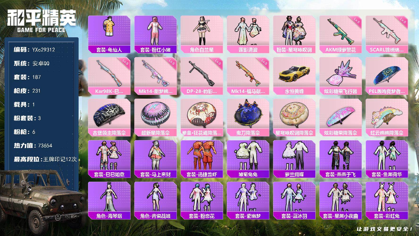 PX_2557022-2-【无二次】【因赛季更新游戏段付以上号为准!】 ,安卓Q-1载具3粉装6特效枪10热门187套装231枪皮,,12印记,历史传奇王牌18星, 【1载具】,永恒黄蜂, 【3粉装】,白兰星,星穹咏叹调,莲影清波, 【6特效枪】,SCAR-L-锦绣绵绵,(5级),AKM-绿萝繁花,(5级),Kar98K-巳巳如意,(5级),DP-28-豹影疾电,(5级),Mk14-甜梦熊击,(5级),Mk14-福马献瑞,(5级), 【10热门】,龟仙人,雪山精英,软萌银虎,4AM战队服,粉红小猪,破蛋小黄鸡,风华少年志,极速红龙,弄潮海豚,S686-奇异狩猎者, 【1头盔】,梦幻火箭头盔,