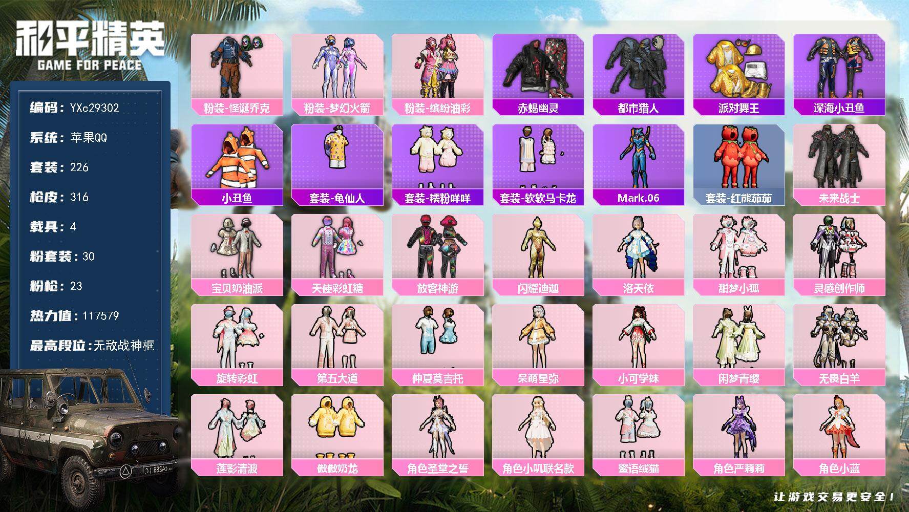 PX_2557030-??素材号!战神框,赤蝎,都市,金鞋,新101,怪诞,猪妹,放客,小狐,金迪迦,6级M4超新星,番茄,马卡龙,咩咩,国宝头,粉熊包,满地铁天赋】YXc29302-【可二次】【因赛季更新游戏段付以上号为准!】 ,苹果Q-5稀有4载具30粉装23特效枪18热门226套装316枪皮,,12印记,历史无敌战神, 【5稀有】,赤蝎幽灵,AKM-缤纷海域,都市猎人,派对舞王,派对舞王(金靴子), 【4载具】,兰博轿车灰色,萌喵橘座,护世瑞兽,盛世惊鸿摩托车, 【30粉装】,圣堂之誓,梦幻火箭,严莉莉,小蓝,美琪,美雪,蜜语绒猫,傲傲奶龙,宝贝奶油派,天使彩虹糖,千金淑猫,洛天依,小叽联名款,怪诞乔克,守护天翼,无畏白羊,呆萌星弥,小可学妹,闲梦青缨,智耀战神,缤纷油彩,放客神游,莲影清波,仲夏莫吉托,未来战士,第五大道,灵感创作师,甜梦小狐,旋转彩虹,闪耀迪迦型, 【23特效枪】,SCAR-L-纯梦嫁纱,(4级),SCAR-L-锦绣绵绵,(5级),M416-墨龙九天,(3级),M416-超新星,(6级),AKM-炫紫旋律,(7级),AKM-白勺歌姬,(1级),AKM-绿萝繁花,(5级),Kar98K-巳巳如意,(5级),SPAS-12-蜜语绒猫,(4级),MG3-酷泡奶龙,(5级),MG-36-沧焰双生,(5级),DP-28-豹影疾电,(5级),AUG-暖羊咩咩,(5级),PKM-江南烟雨,(4级),GROZA-巴啦啦小魔仙,(5级),DP-28-圣堂之誓,(3级),M417-第五大道,(4级),Vector-灵感创作师,(6级),Mk14-福马献瑞,(4级),UMP45-萌骑冒险,(5级),平底锅-仲夏莫吉托,(6级),破片手榴弹-粉粉猫爪,(6级),烟雾弹-猫咪绅士,(4级), 【18热门】,Mark.06,小丑鱼,龟仙人,红熊茄茄,幸运萌趣趣,软软马卡龙,晶辉守护,糯粉咩咩,鹰眼刺客,迅捷狂鲨,深海小丑鱼,暗夜契约,赛罗奥特曼,水银刺客,漫步者,破蛋小黄鸡,英勇保护者,弄潮海豚, 【2飞行器】,龙翔九天飞行器,千面幻镜飞行器, 【2头盔】,国宝胖达头盔,梦幻火箭头盔, 【5背包】,梦幻火箭背包,甜心宝贝背包,萌熊伴侣背包,深海小丑鱼背包,夏日绵绵冰背包,