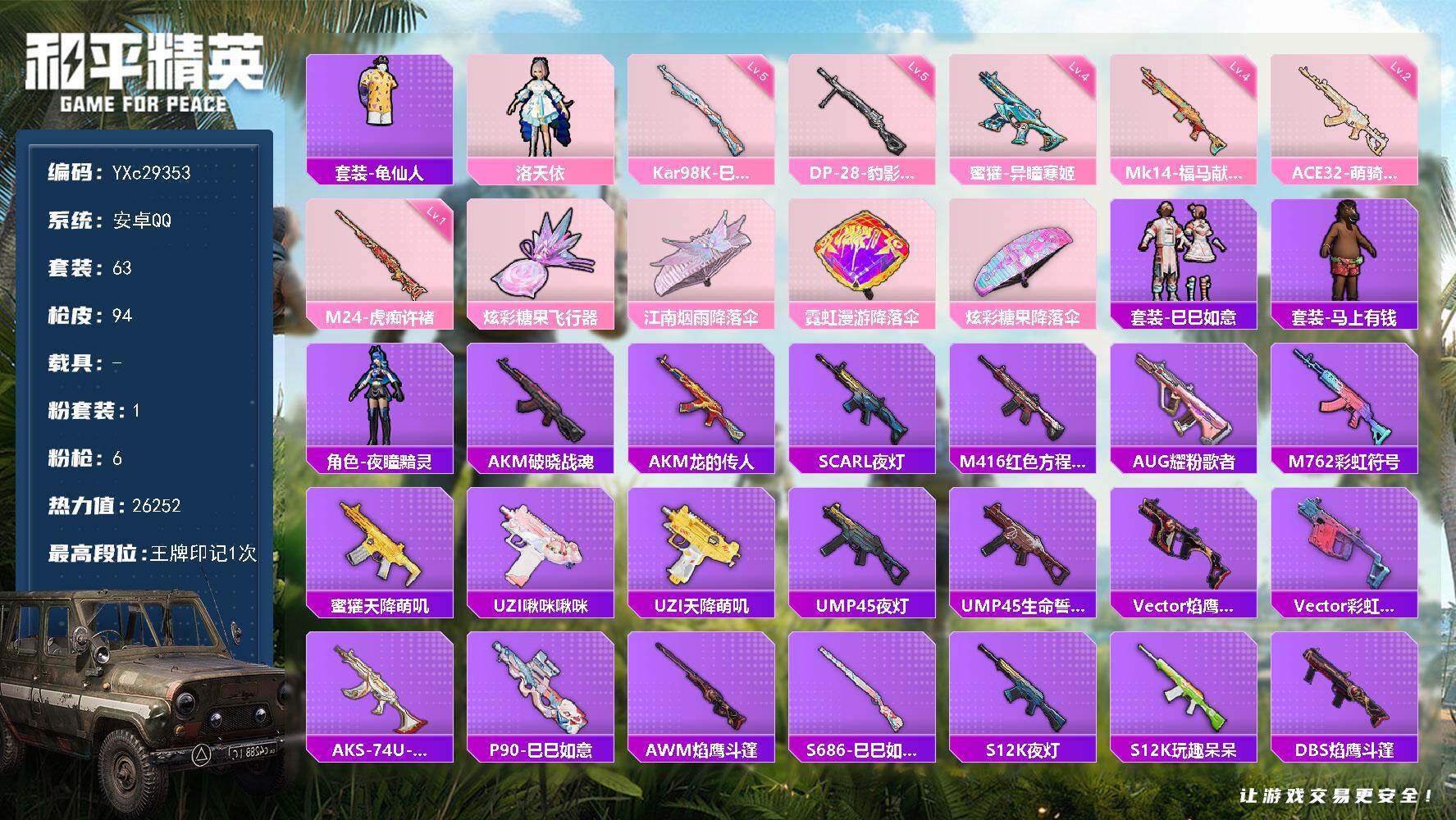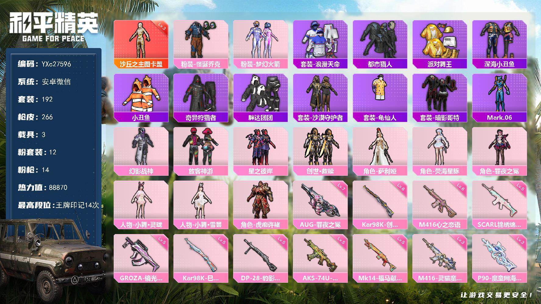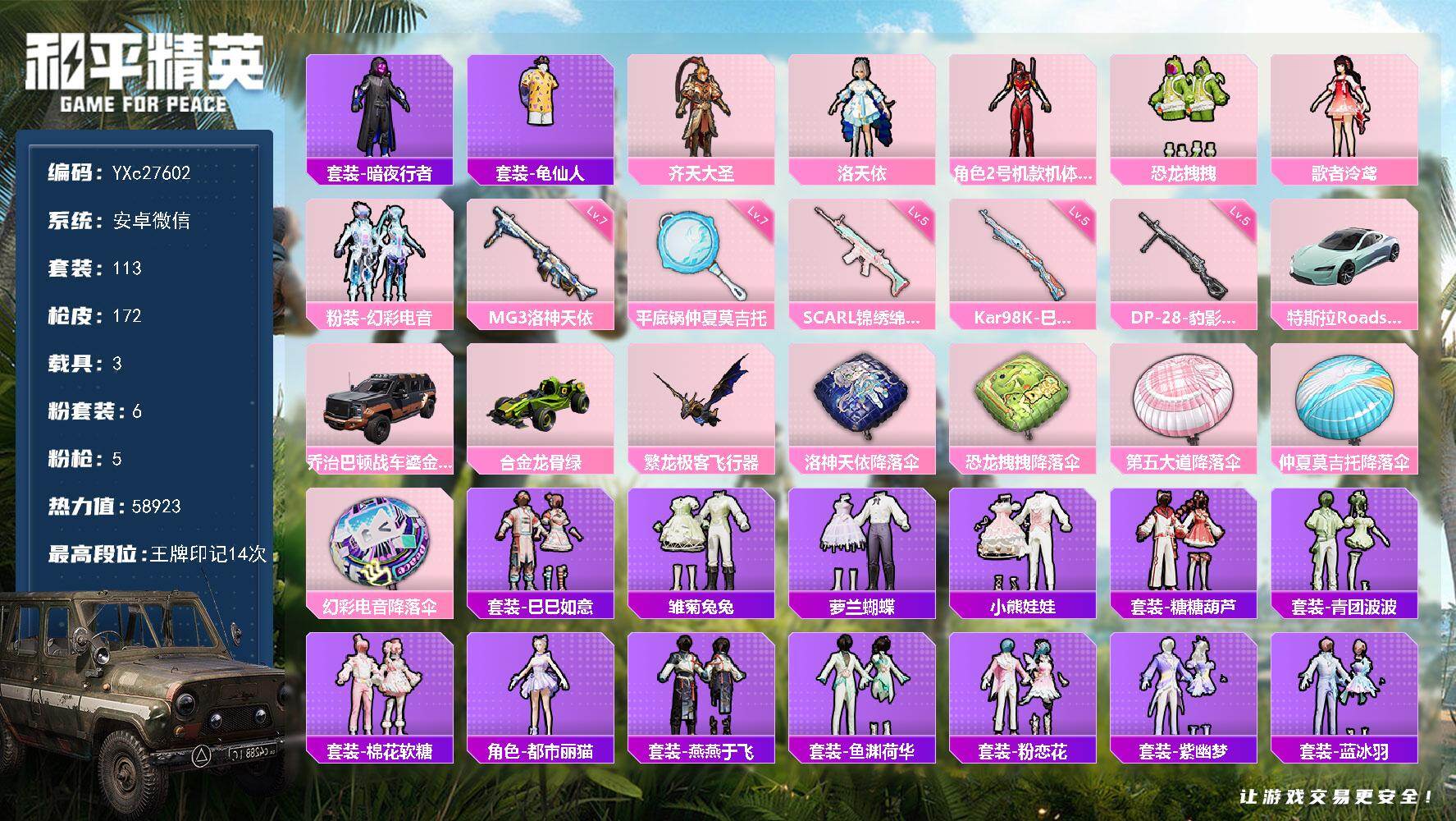 PX_2557246-??螂】YXc27602-【可二次】【因赛季更新游戏段付以上号为准!】 ,安卓V-3载具6粉装5特效枪2热门113套装172枪皮,14印记,历史超级王牌22星, 【3载具】,乔治巴顿鎏金黑,特斯拉R水滴蓝,合金龙骨绿色, 【6粉装】,红螳螂,洛天依,幻彩电音,歌者泠鸢,恐龙拽拽,齐天大圣, 【5特效枪】,SCAR-L-锦绣绵绵,(5级),Kar98K-巳巳如意,(5级),DP-28-豹影疾电,(5级),MG3-洛神天依,(7级),平底锅-仲夏莫吉托,(7级), 【2热门】,龟仙人,暗夜行者, 【1飞行器】,繁龙极客飞行器