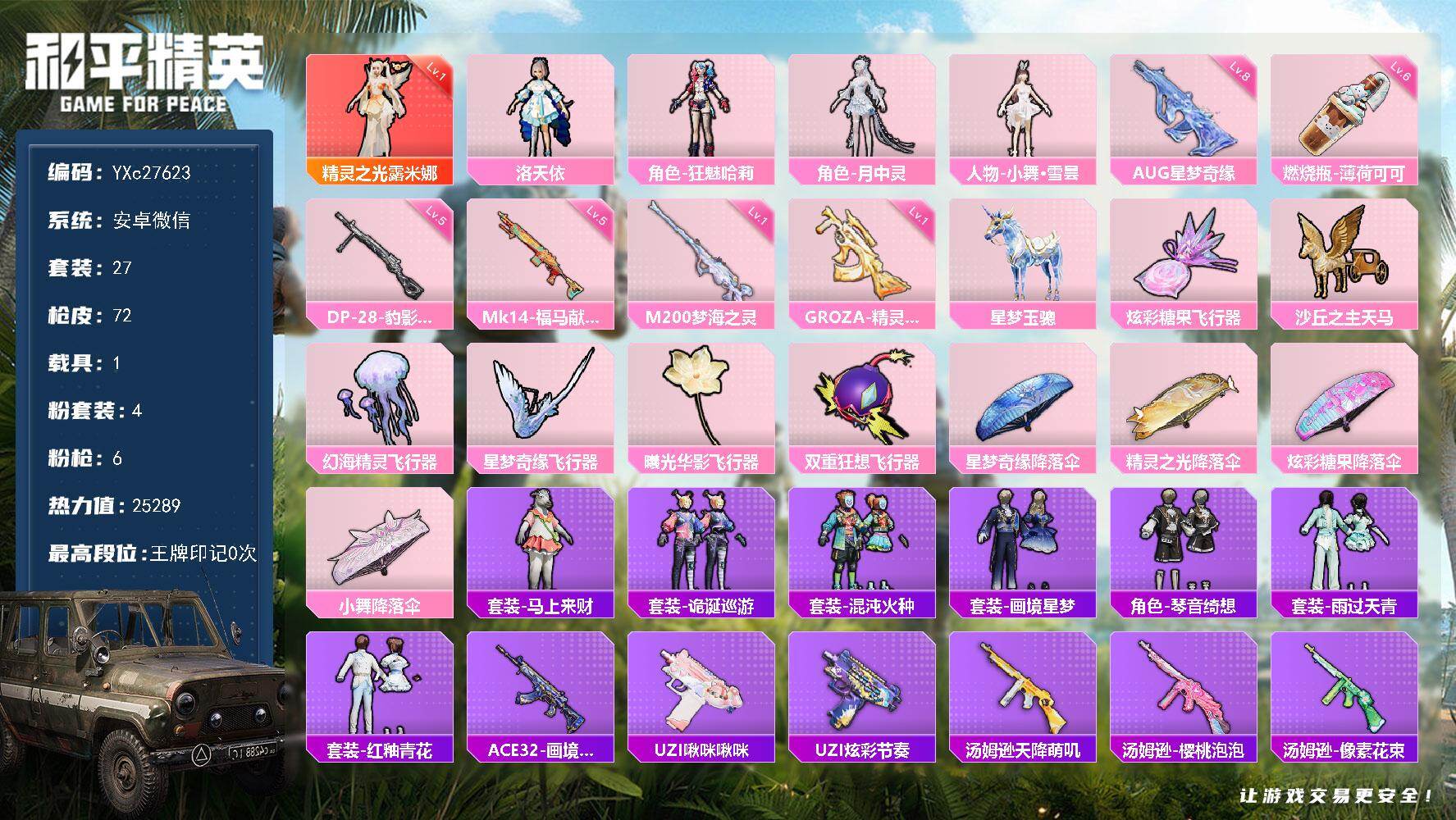 PX_2557250-??号!1级精灵,8级AUG星梦,满地铁天赋】YXc27623-【可二次】【因赛季更新游戏段付以上号为准!】 安卓V-1红装1载具4粉装6特效枪27套装72枪皮,2w热力值,历史英勇黄金Ⅳ, 【1红装】,精灵之光-露米娜,(1级), 【1载具】,星梦玉骢, 【4粉装】,狂魅哈莉,小舞雪昙,洛天依,月中灵, 【6特效枪】,DP-28-豹影疾电,(5级),AUG-星梦奇缘,(8级),M200-梦海之灵,(1级),GROZA-精灵之光,(1级),Mk14-福马献瑞,(5级),燃烧瓶-薄荷可可,(6级), 【1飞行器】,幻海精灵飞行器